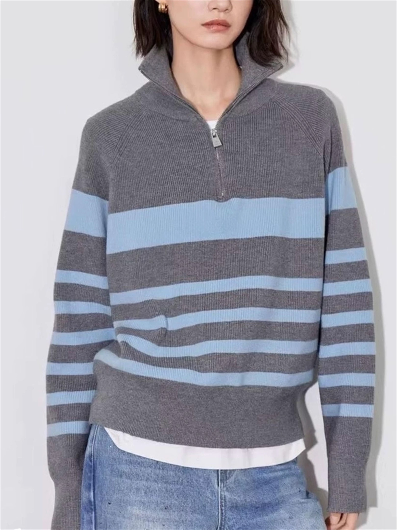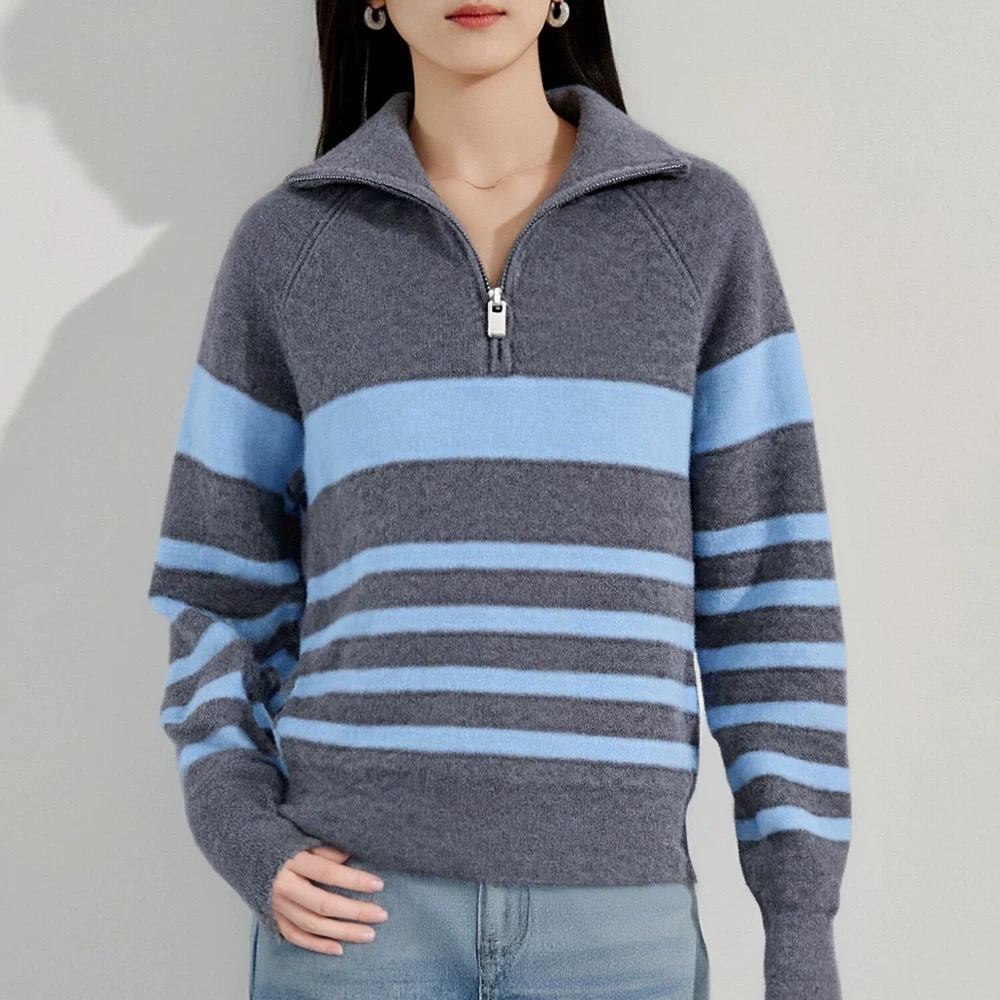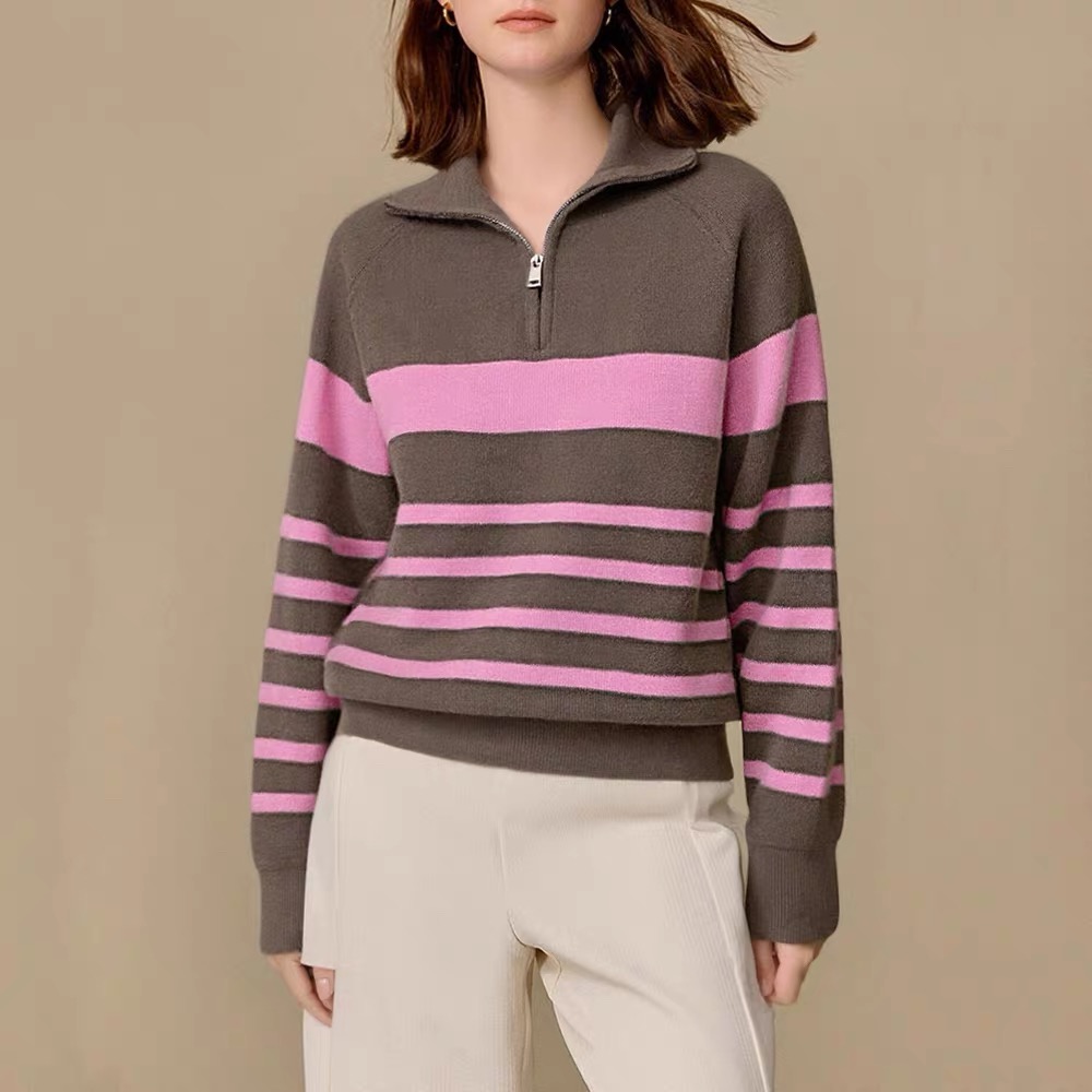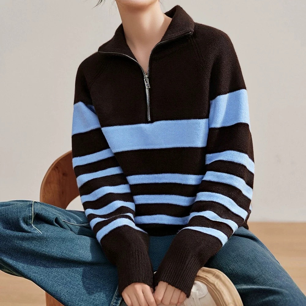 95169410 - 批条纹针织套头高级感条纹半拉链翻领毛衣女秋冬慵懒松弛感毛线衣 387676