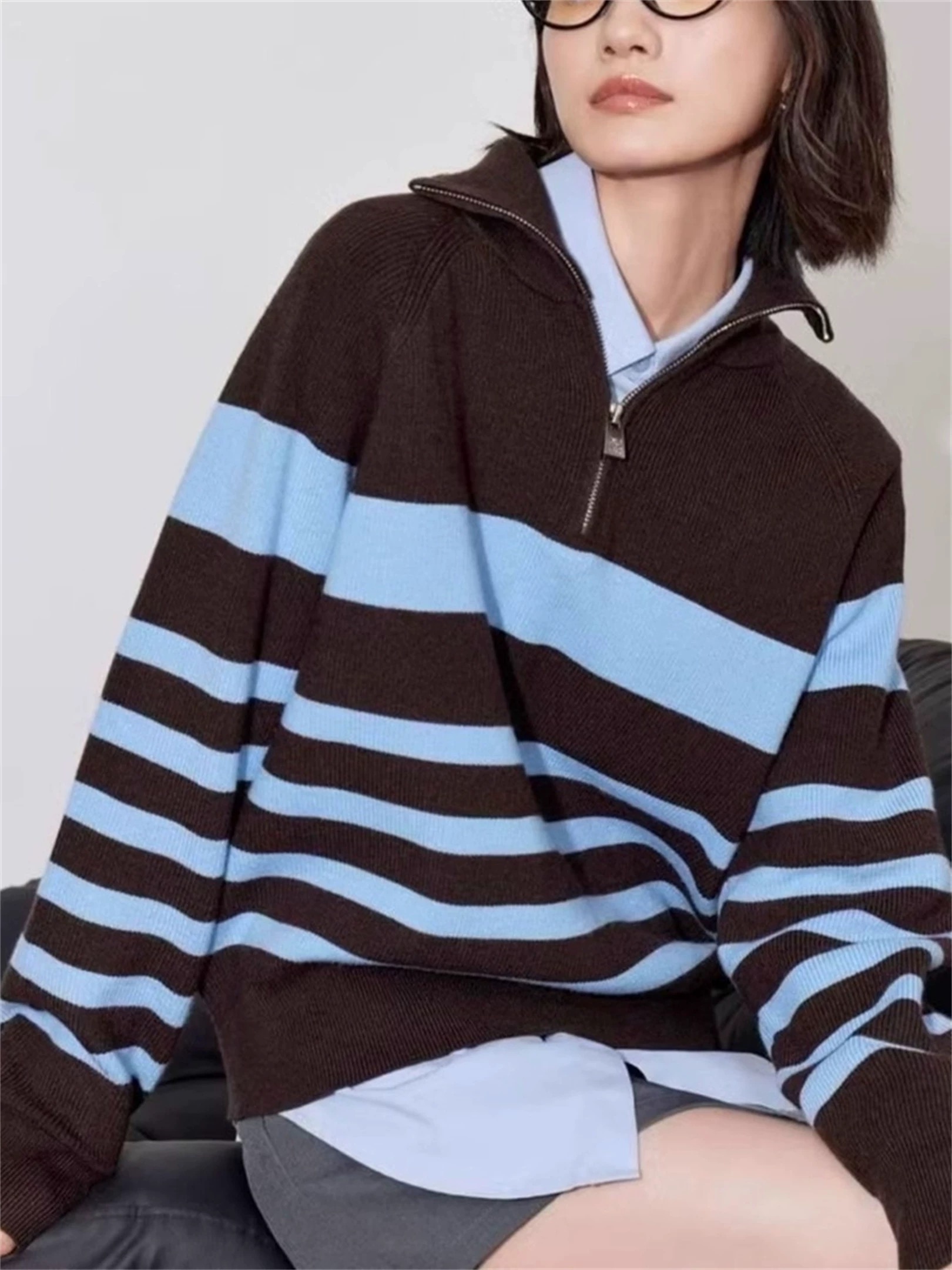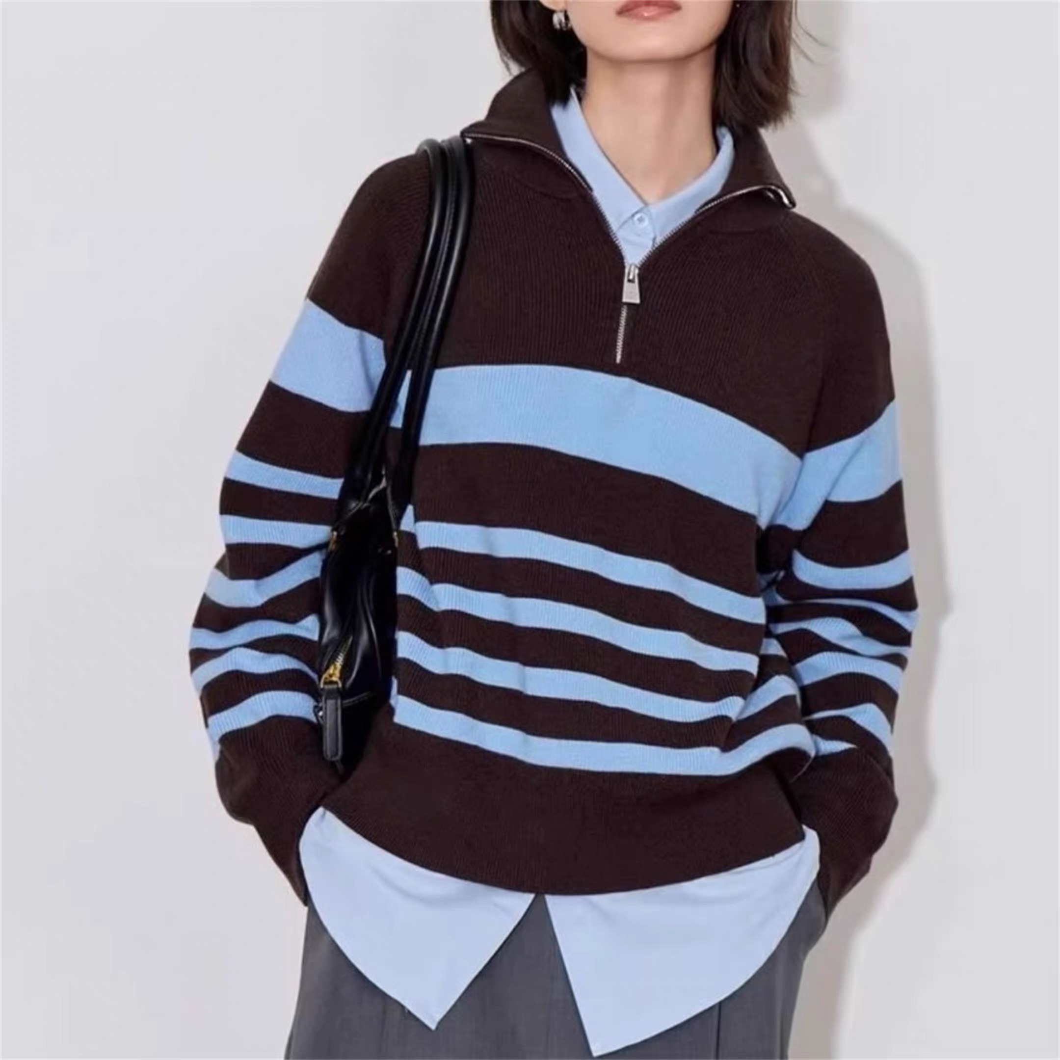 复古巧克力棕撞清新浅蓝 冷暖色调搭出松弛少年感 半拉链领口既能保暖又能解锁 露肤小心机 配黑裤就是韩系休闲风