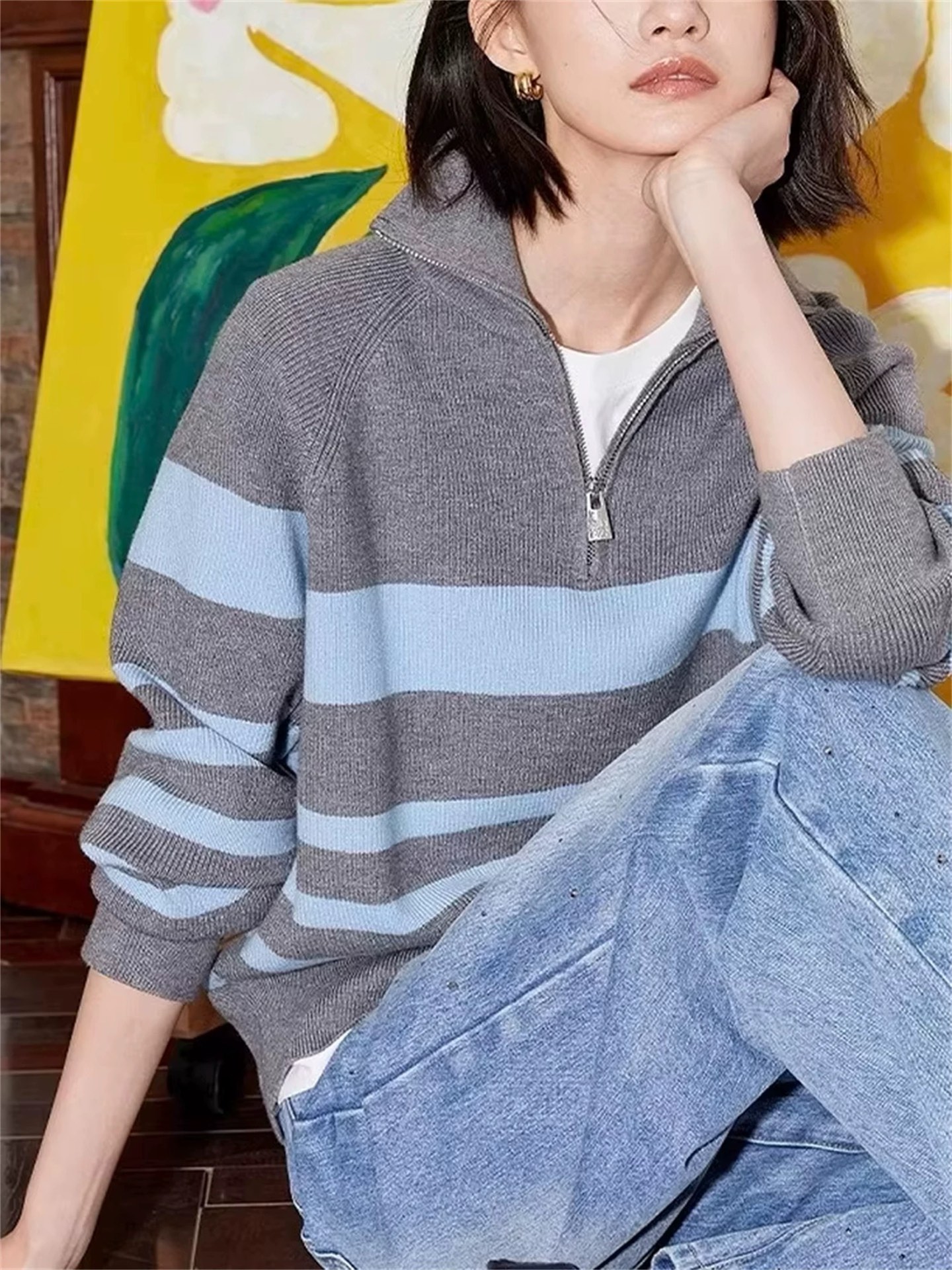 批条纹针织套头高级感条纹半拉链翻领毛衣女秋冬慵懒松弛感毛线衣厚毛织上衣 冬日 撞色条纹毛衣 复古又显白