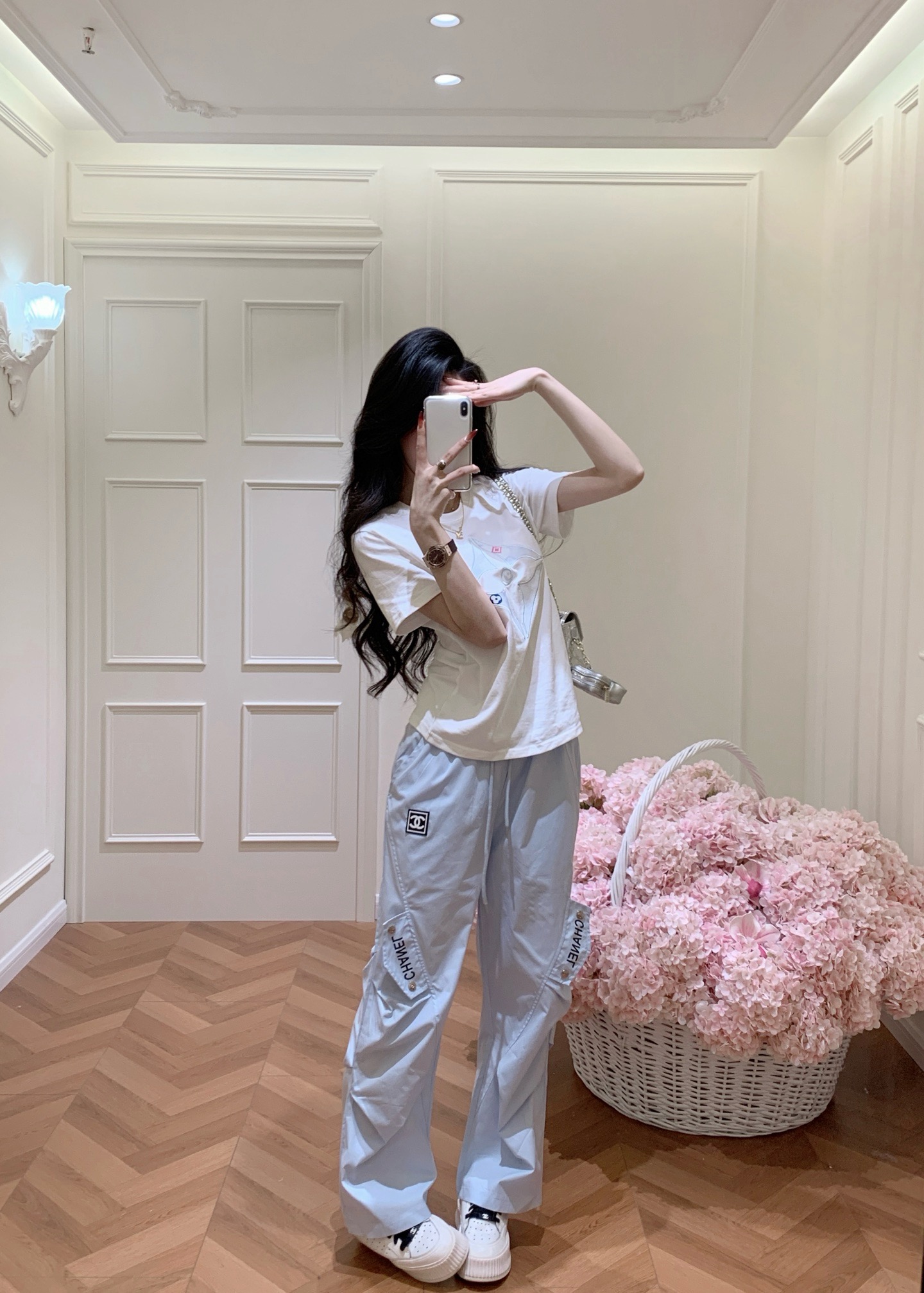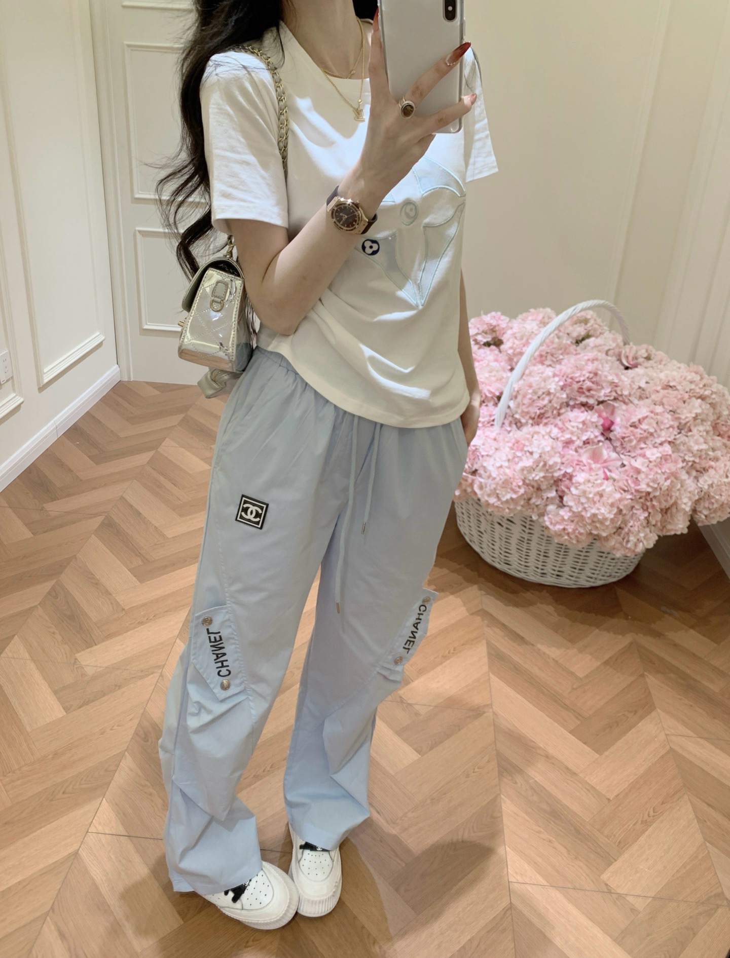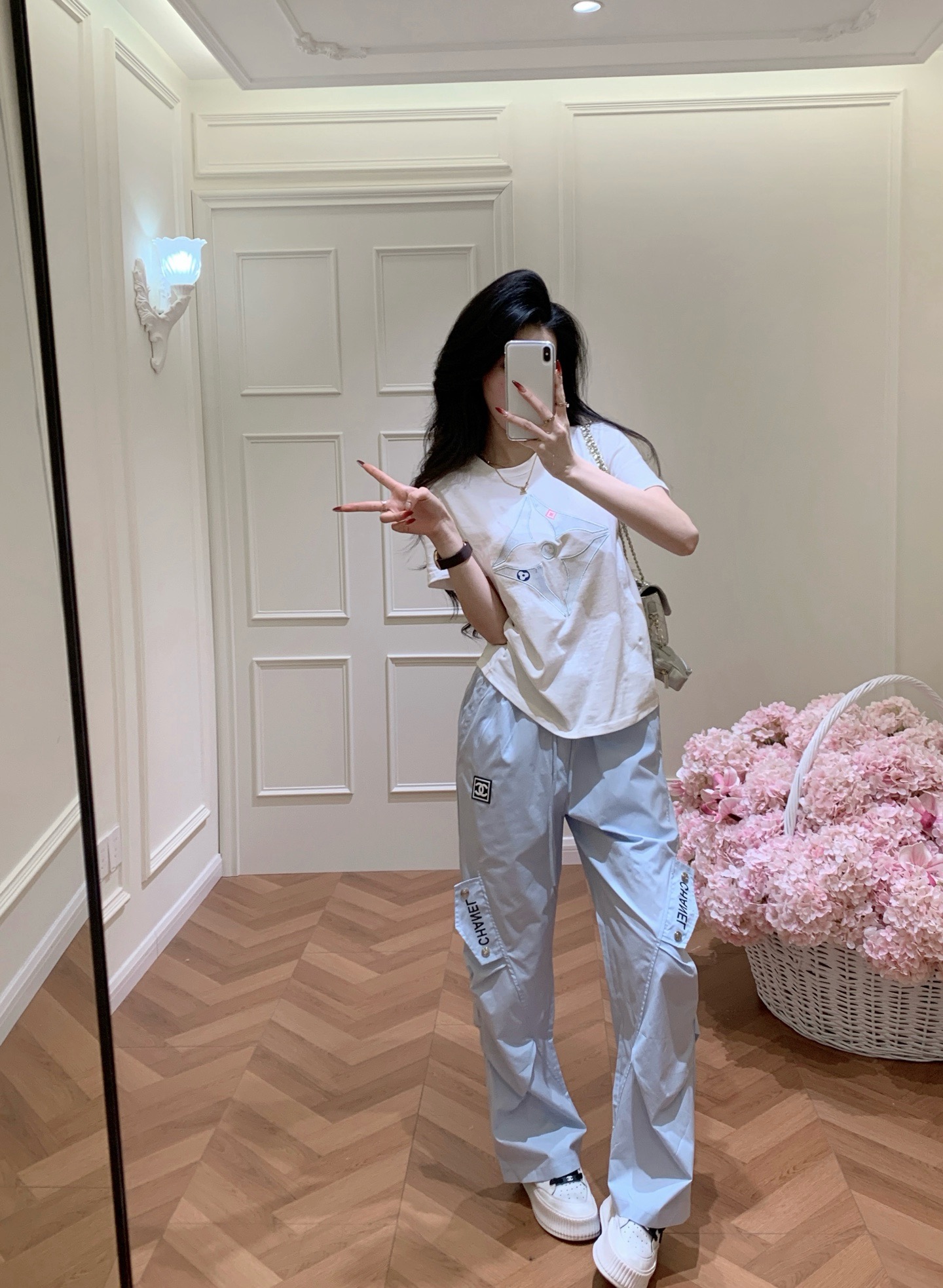 Chanel香奈儿小香定制中古双C皮标字母印花抽绳松紧腰工装休闲长裤