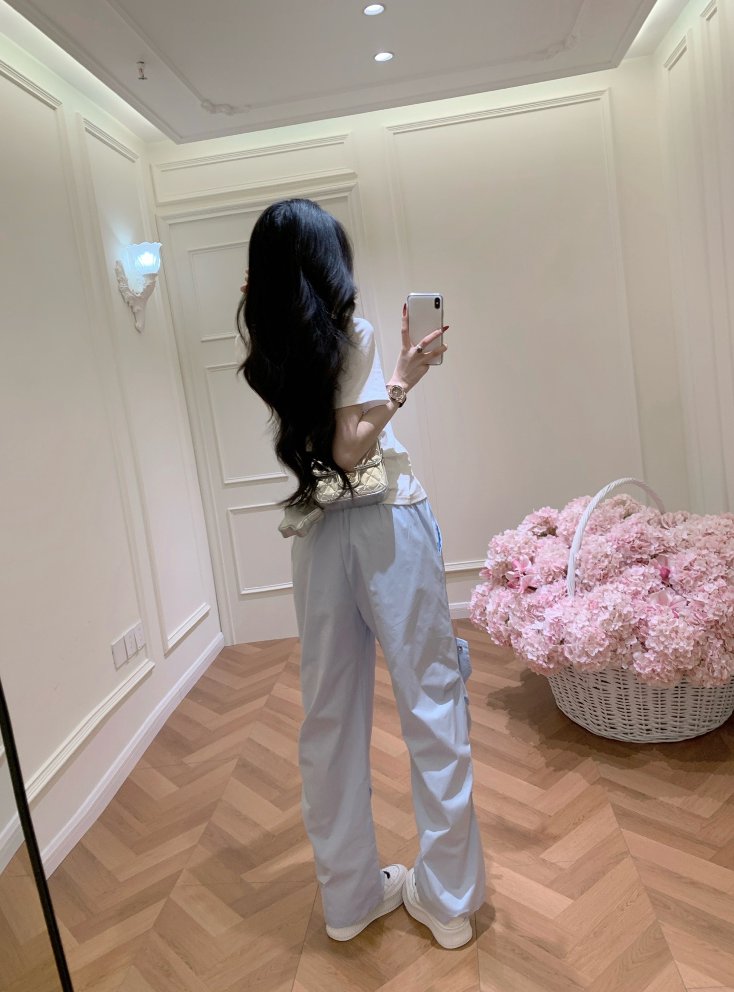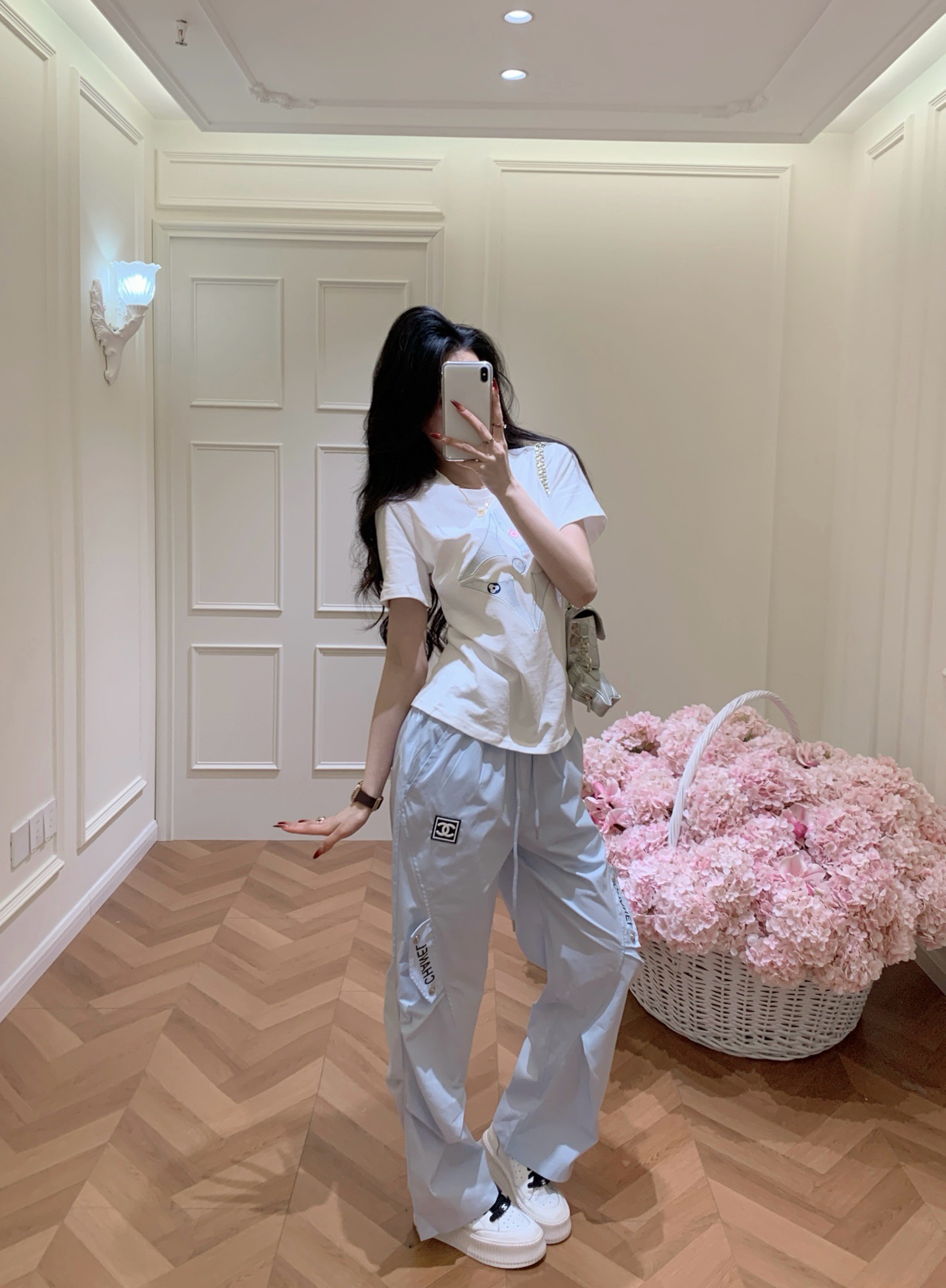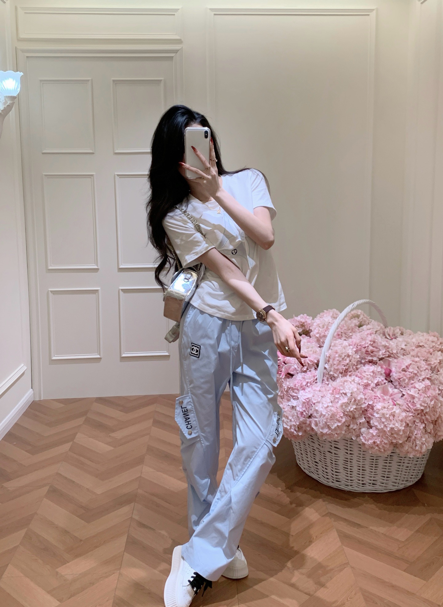 Chanel香奈儿小香定制中古双C皮标字母印花抽绳松紧腰工装休闲长裤