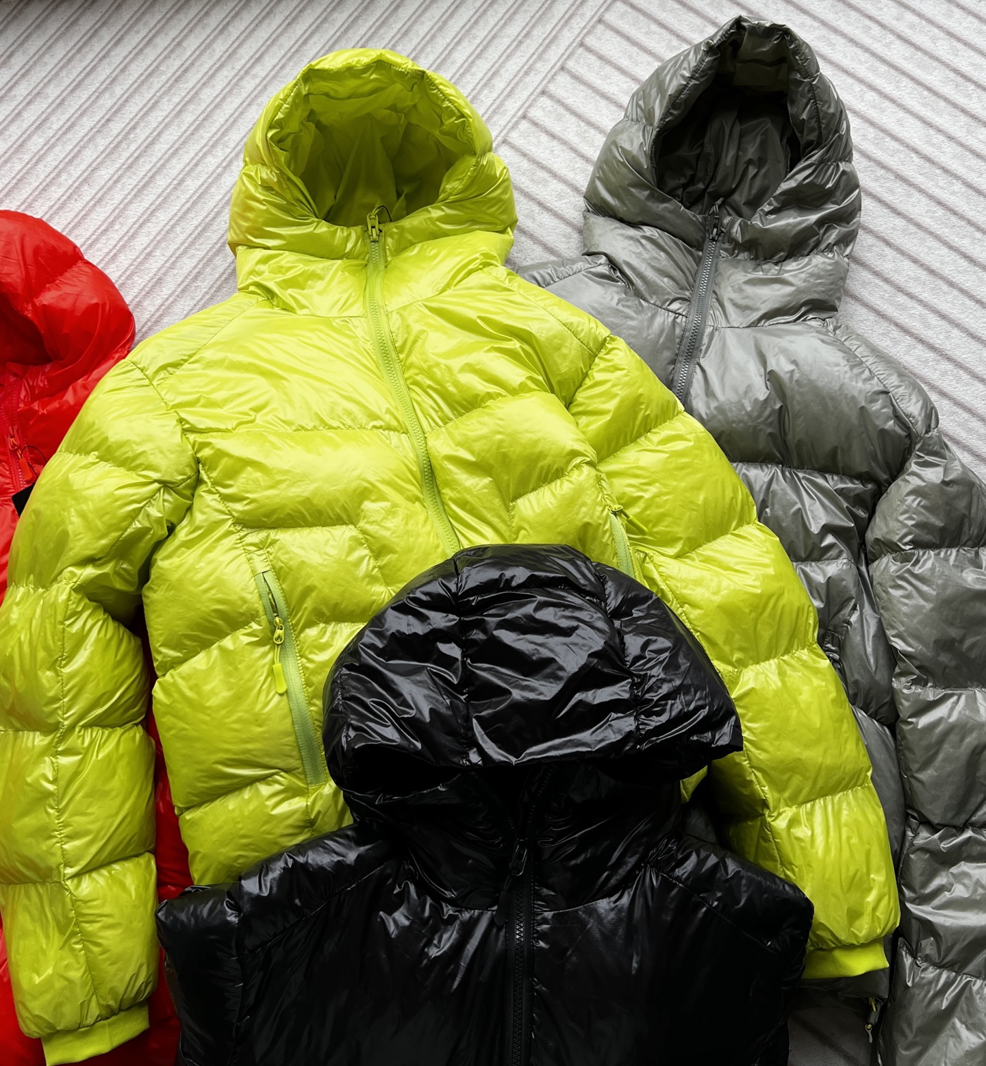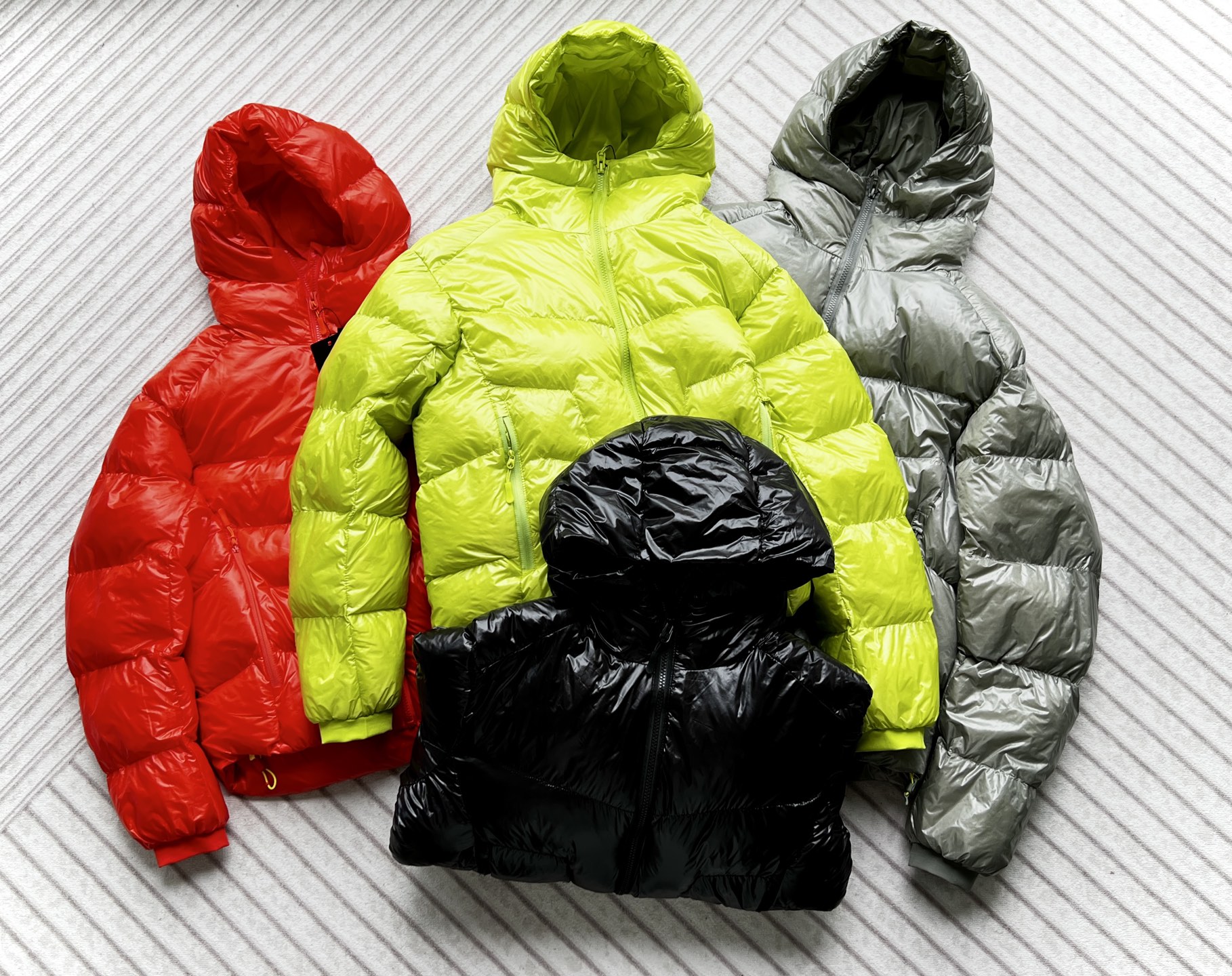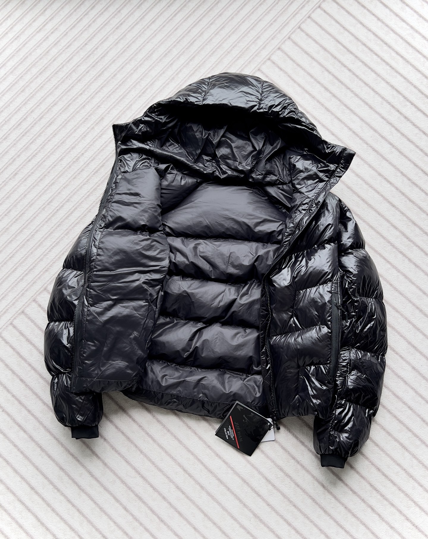 漆亮面质感 颜色超正 半高领连帽拉链 更加保暖 袖口收边 下摆有伸缩松紧抽绳 更方便调节上身后衣服长短