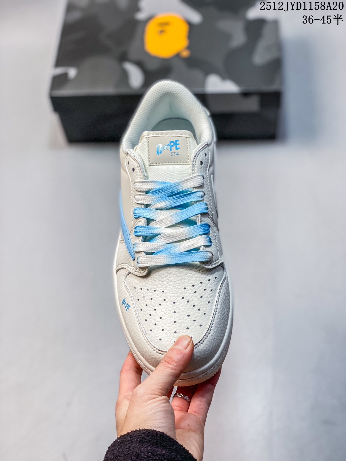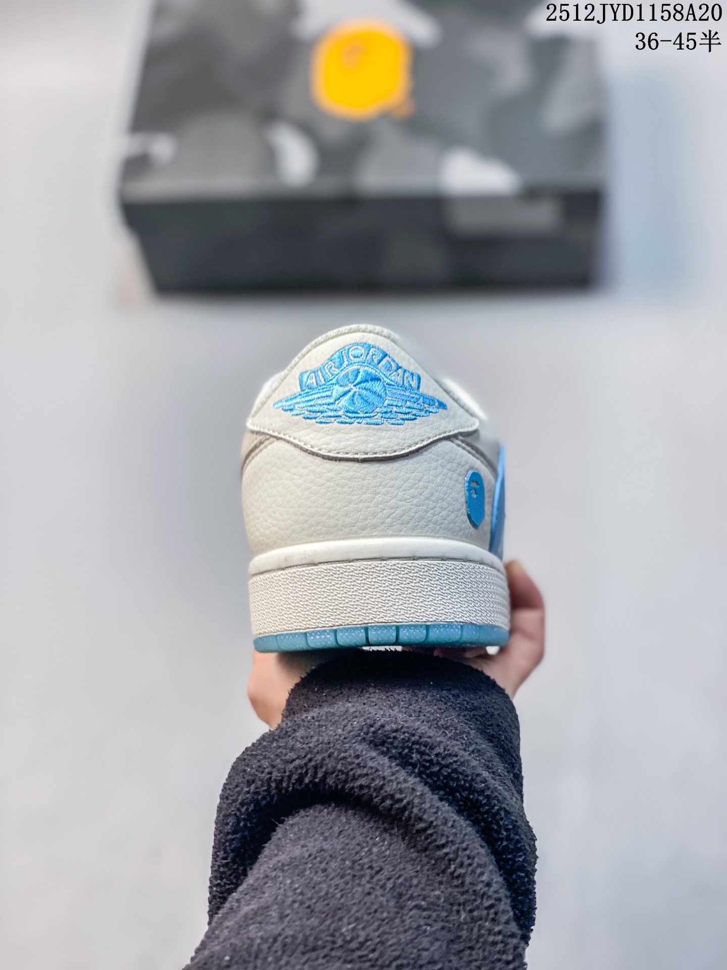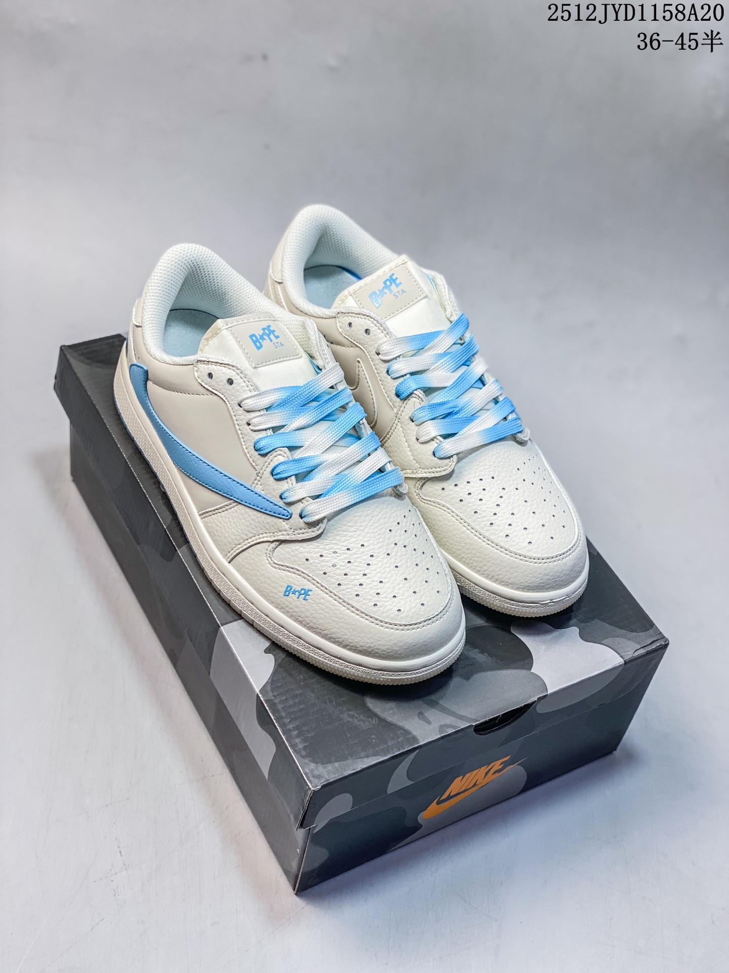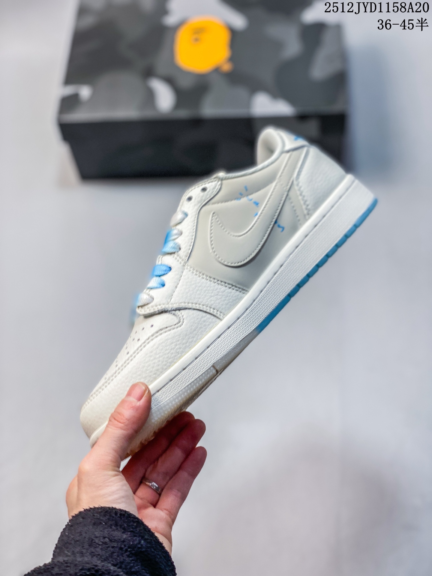 乔丹Fragment x Travis Scott xDior Air Jordan 1 Low 三方联名倒钩 整双鞋以全荔枝皮打造 腰身搭配白色 倒勾 再点缀上Travis Scott 标志性的Logo 后跟处以藤原浩最拿手的蓝色为主色调 完善极具Fragment Design的白蓝黑设计风格 左右脚分别以Travis Scott鬼脸和乔丹飞翼加以修饰 彰显出三方联名的奢华格调