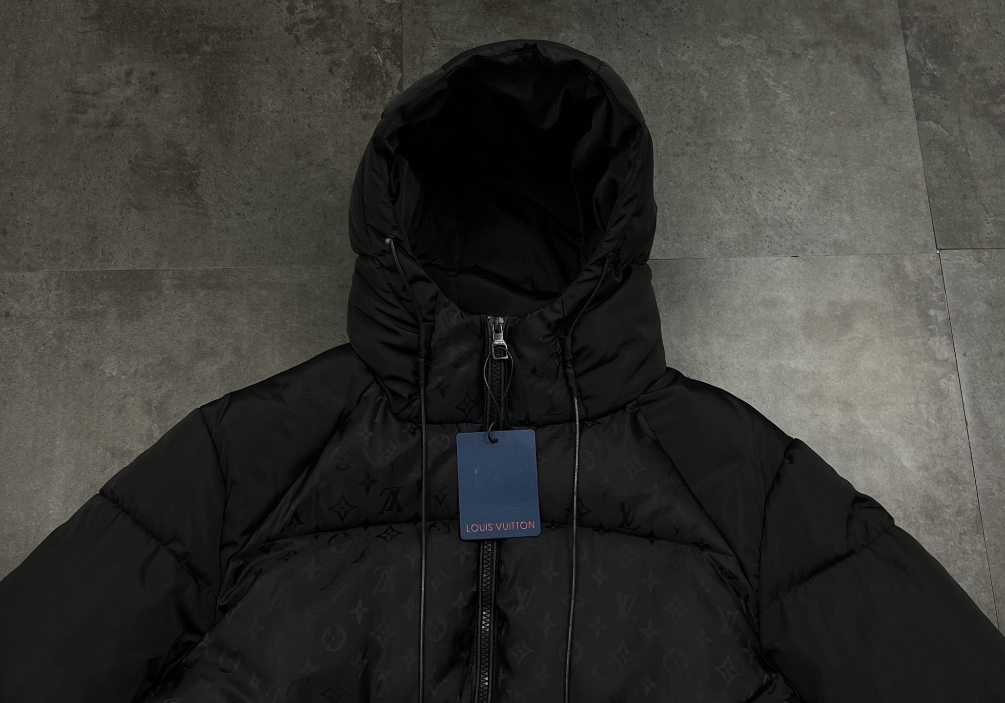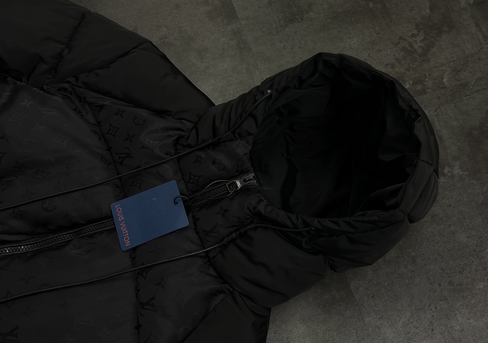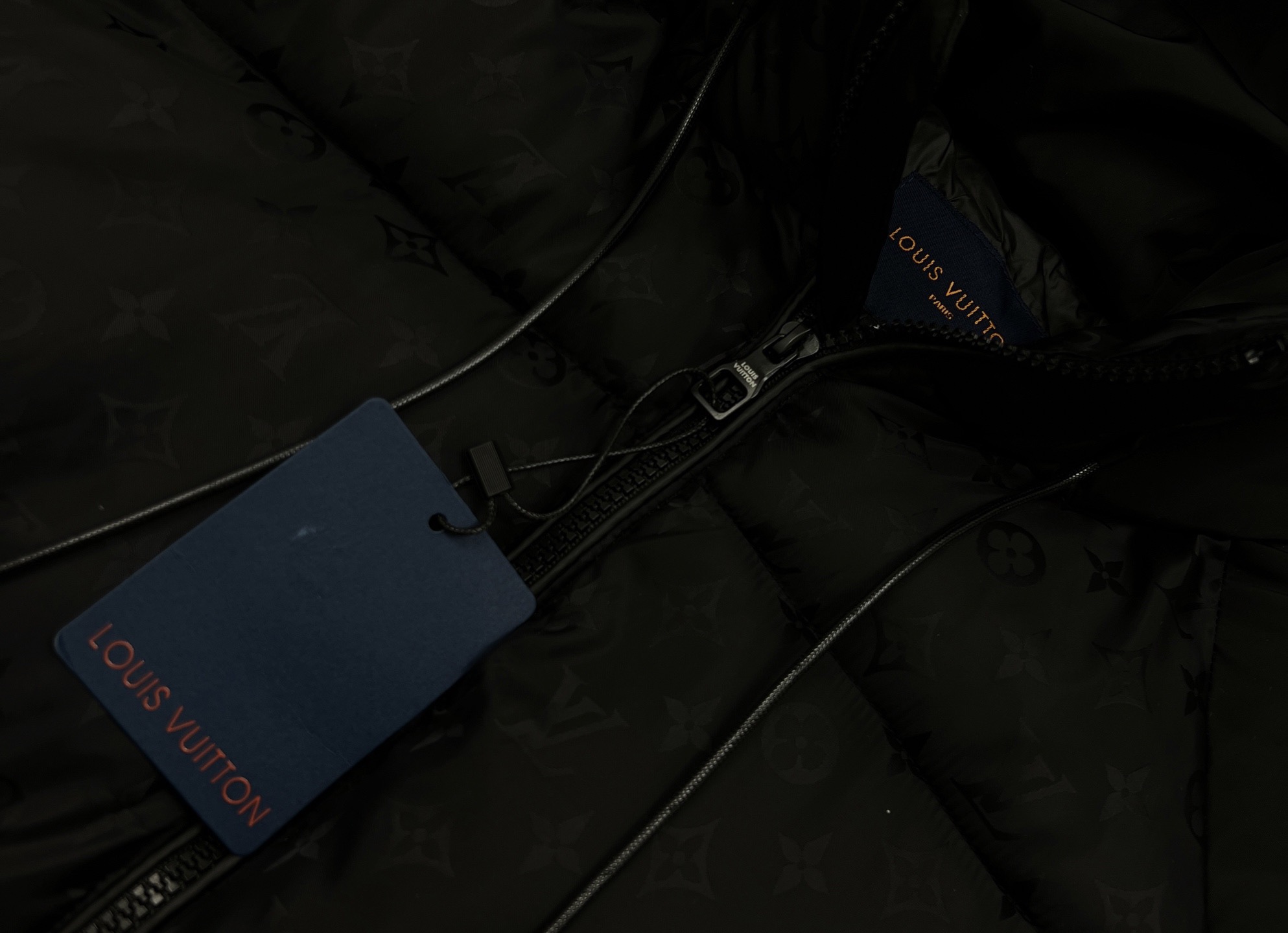 定制五金细节 拉链头 按扣 抽绳扣全是LV专属定制 连拉链齿都是哑光黑 普通羽绒服基本是亮面金属 和整体暗黑风完全统一 连标签都是绒面蓝卡配烫金标 拆标的时候都觉得是 拆礼物