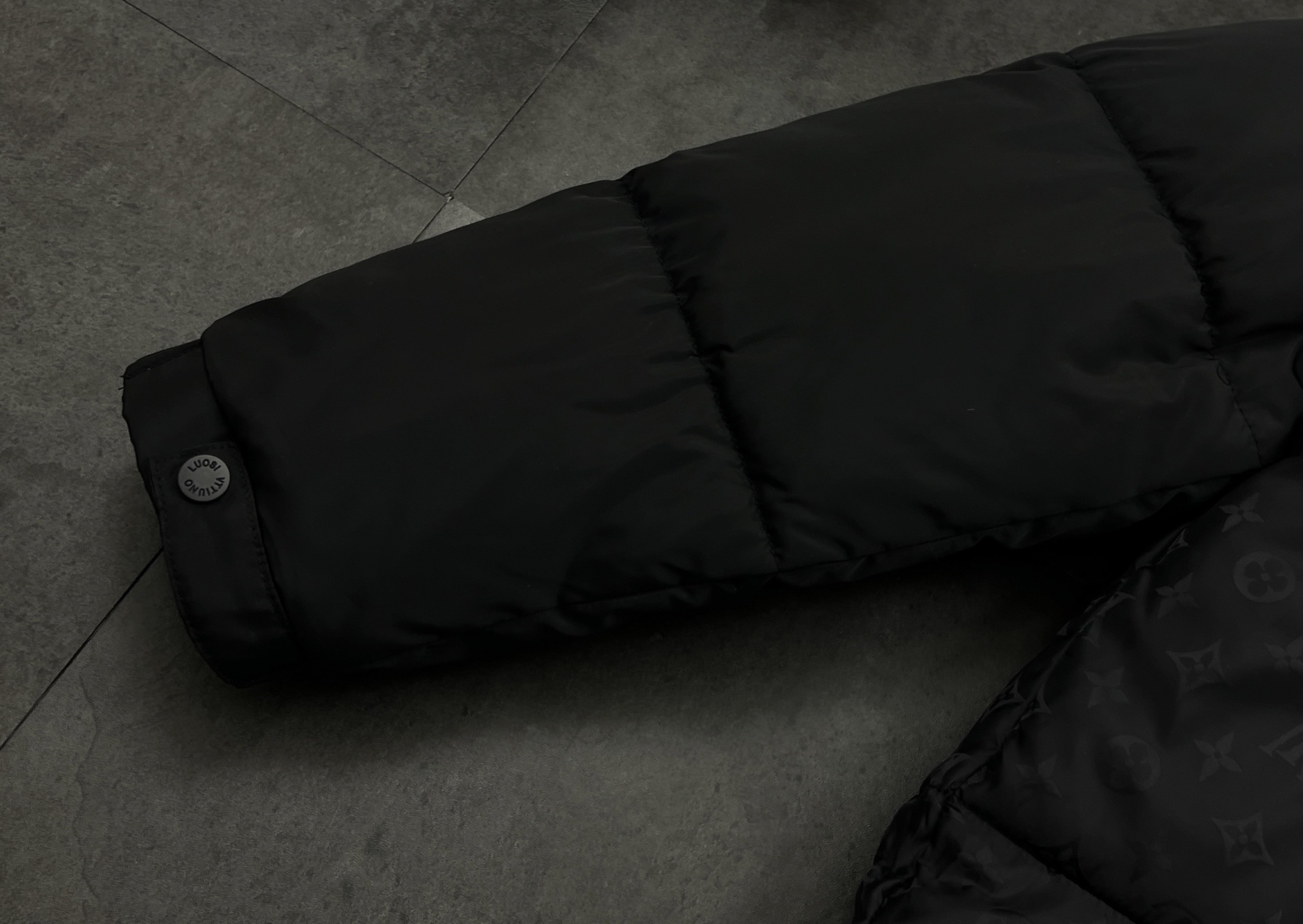衣身是 主体暗纹 袖子净面 的拼接 把Monogram藏在同色系里 远看是极简黑 近看全是细节