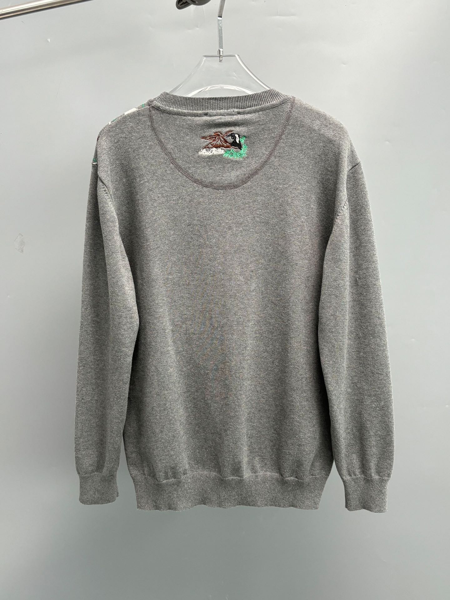 本款长袖圆领衫出自2025秋冬秀场 以细腻羊毛雅致造型注入学院气息 正面 Argyle 提花图案融入 Monogram 花卉和心标识刺绣 背部LV Mount FUi刺绣道出 Pharrell Williams 与