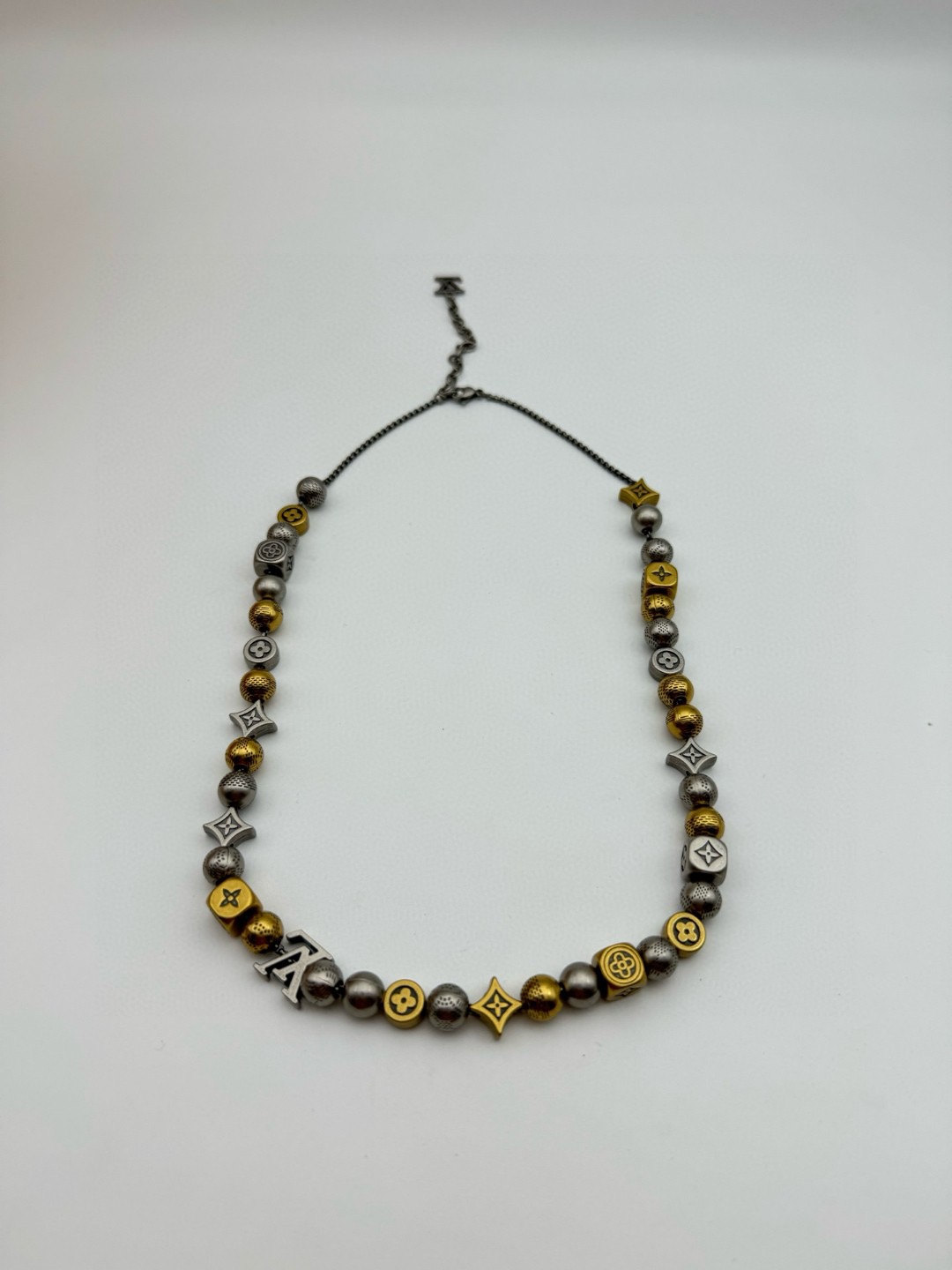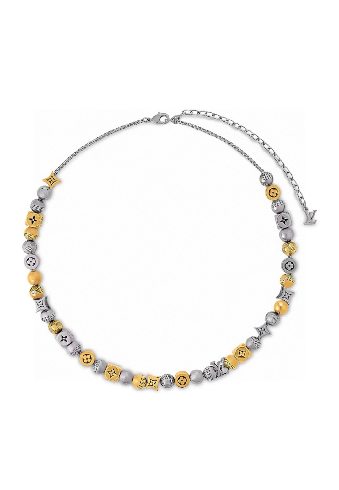 Damier Party 项链巧妙融汇迥异形状 莹泽色彩和路易威登标识 在别致之中流露潮流风范 温润黄铜雕琢圆形 方形和圆柱串珠 Damier 图案和品牌其他标识镂刻其上 龙虾扣方便调节长度
