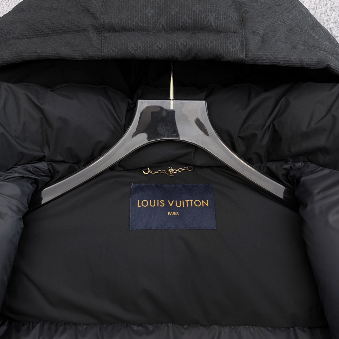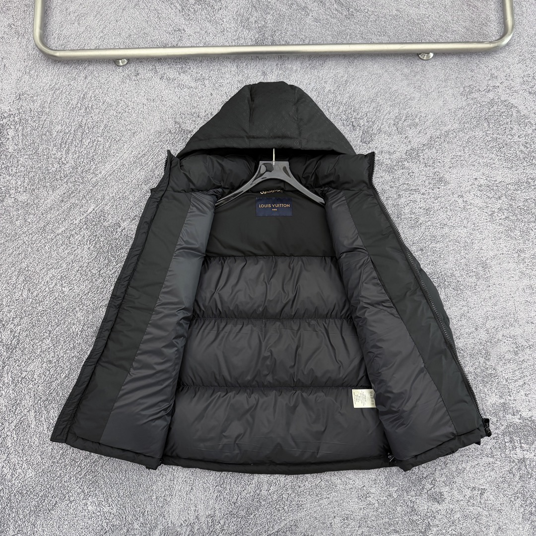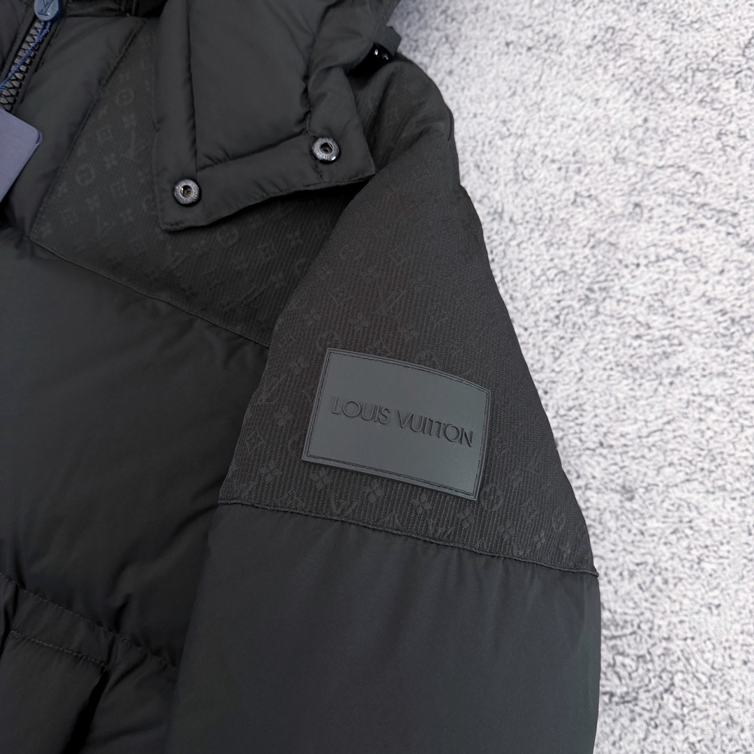 严选好货 路易威登Louis Vuitton新款男女可拆卸连帽羽绒服外套 某宝代购20000 客供轻量化羽绒专用面料 内里90 鹅绒填充 轻盈蓬松 保暖舒适 可拆卸连帽设计 一衣两穿 肩袖满印提花logo拼接 肩部硅胶徽章点缀 双开拉链门襟 松紧防风袖口 原版五金辅料 做工细节都无可挑剔 上身效果一级棒 可配情侣 喜欢的不要错过 颜色 黑色 尺码 S一2XL 模特160 98斤穿S