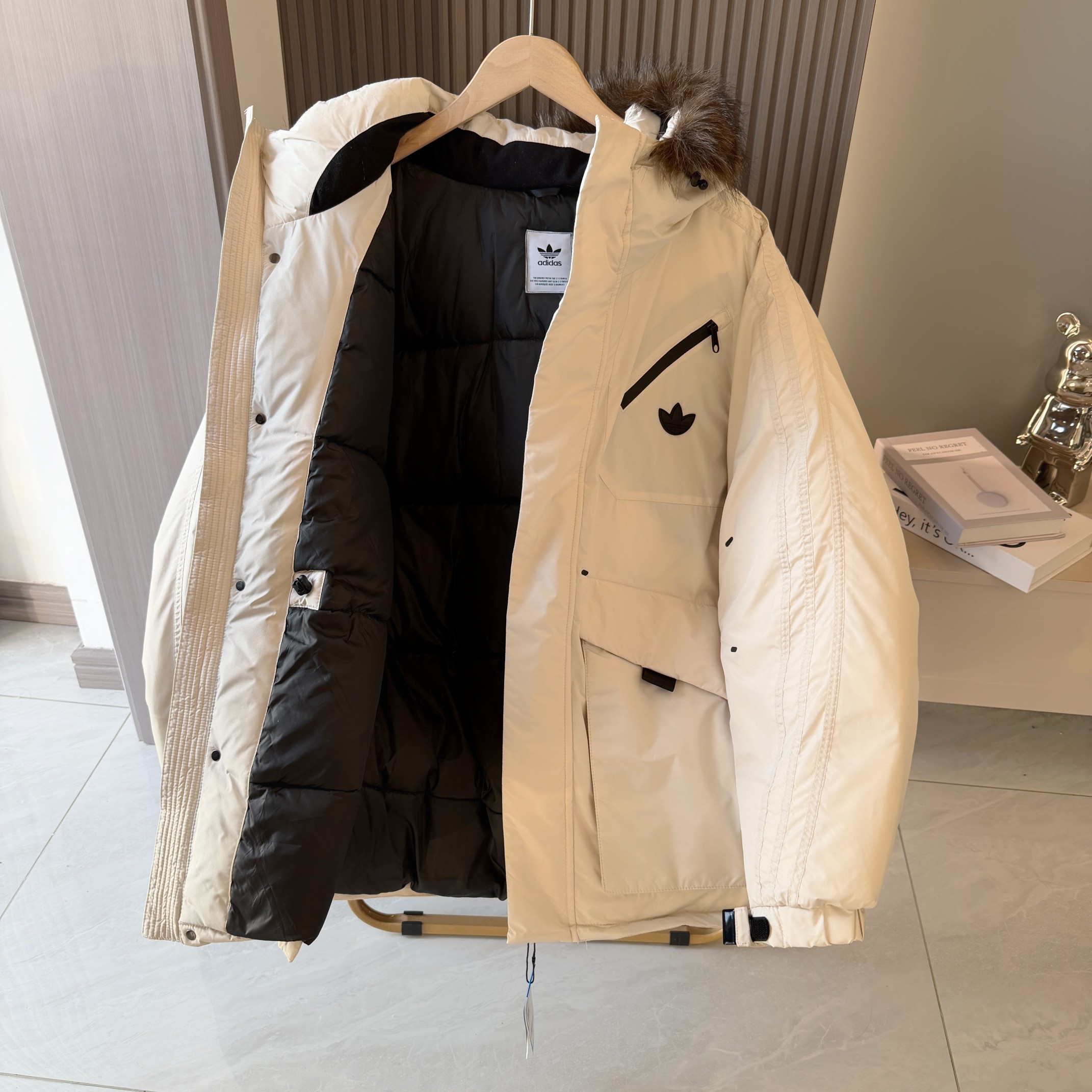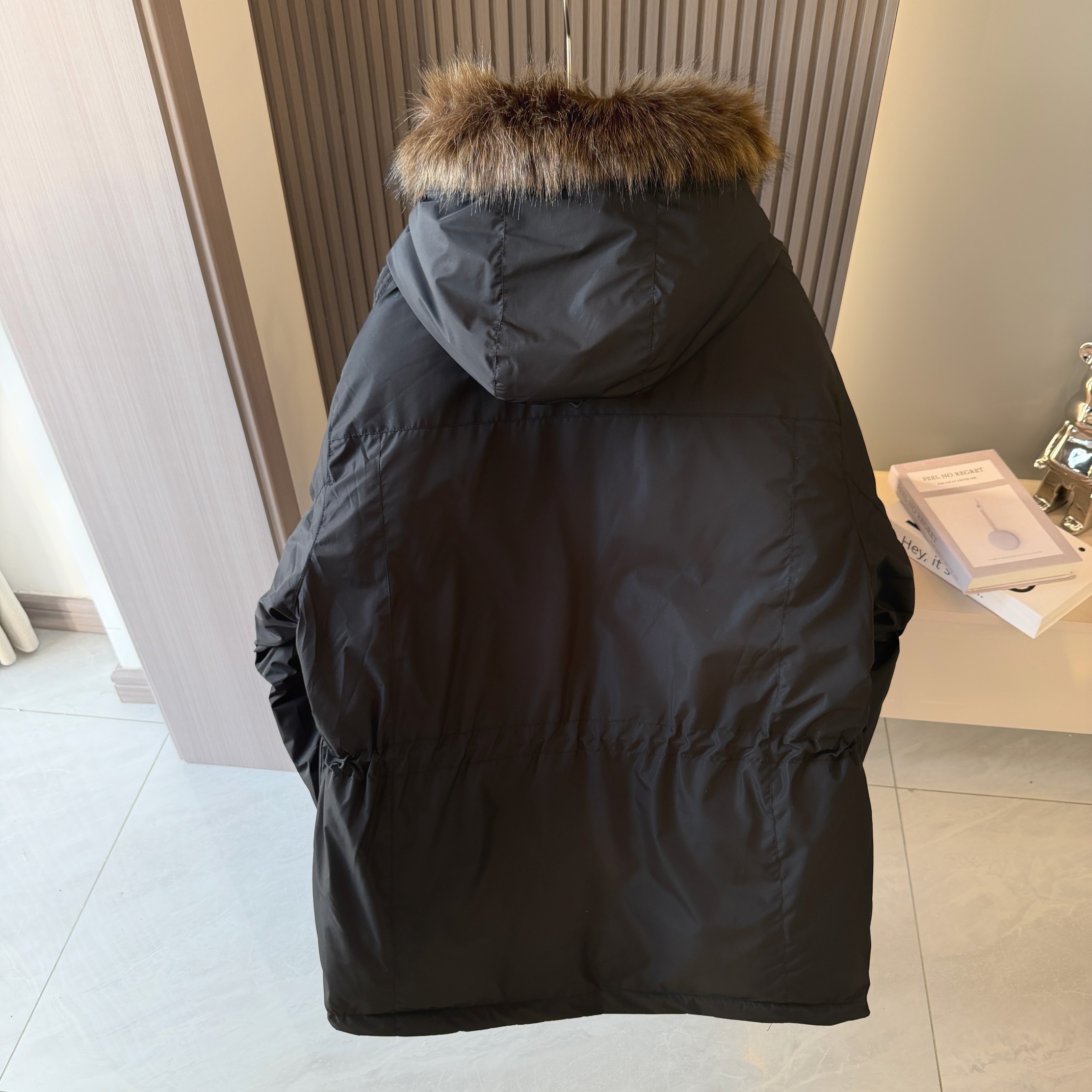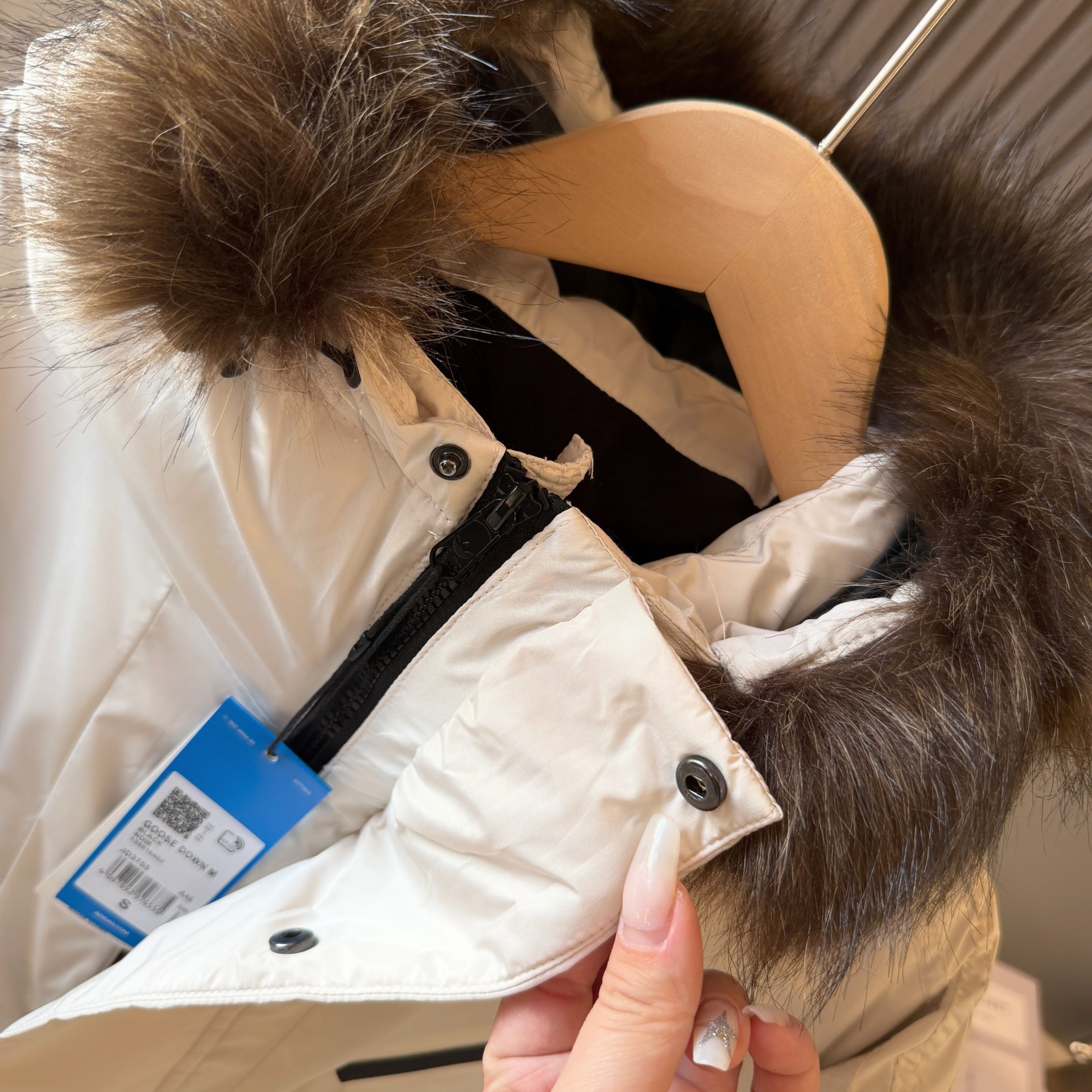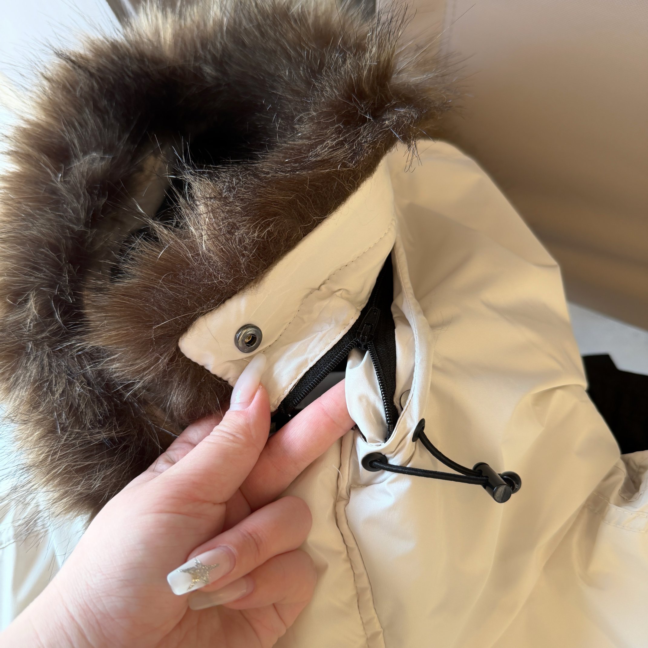 帽檐搭载可拆卸的貉毛毛领 隐形式拉链配合暗扣稳固不移位 需要时保暖更到位 拆下后帽型依旧独立 干净利落 一衣两种氛围
