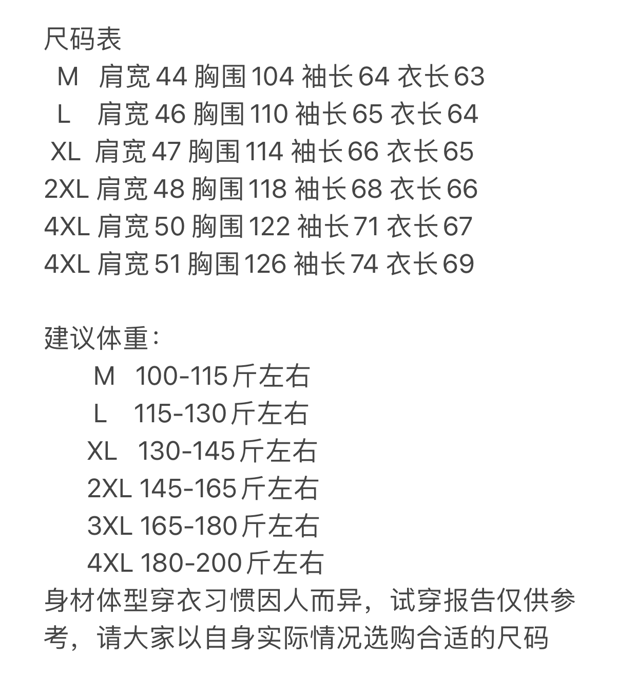 尺码 M 4XL