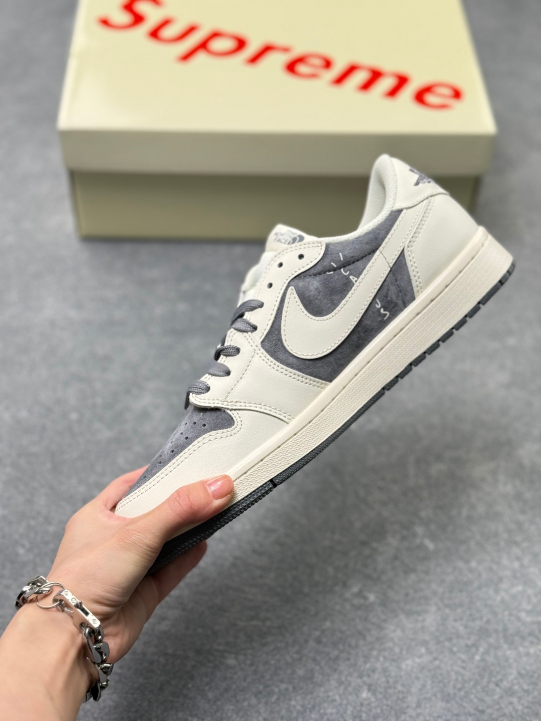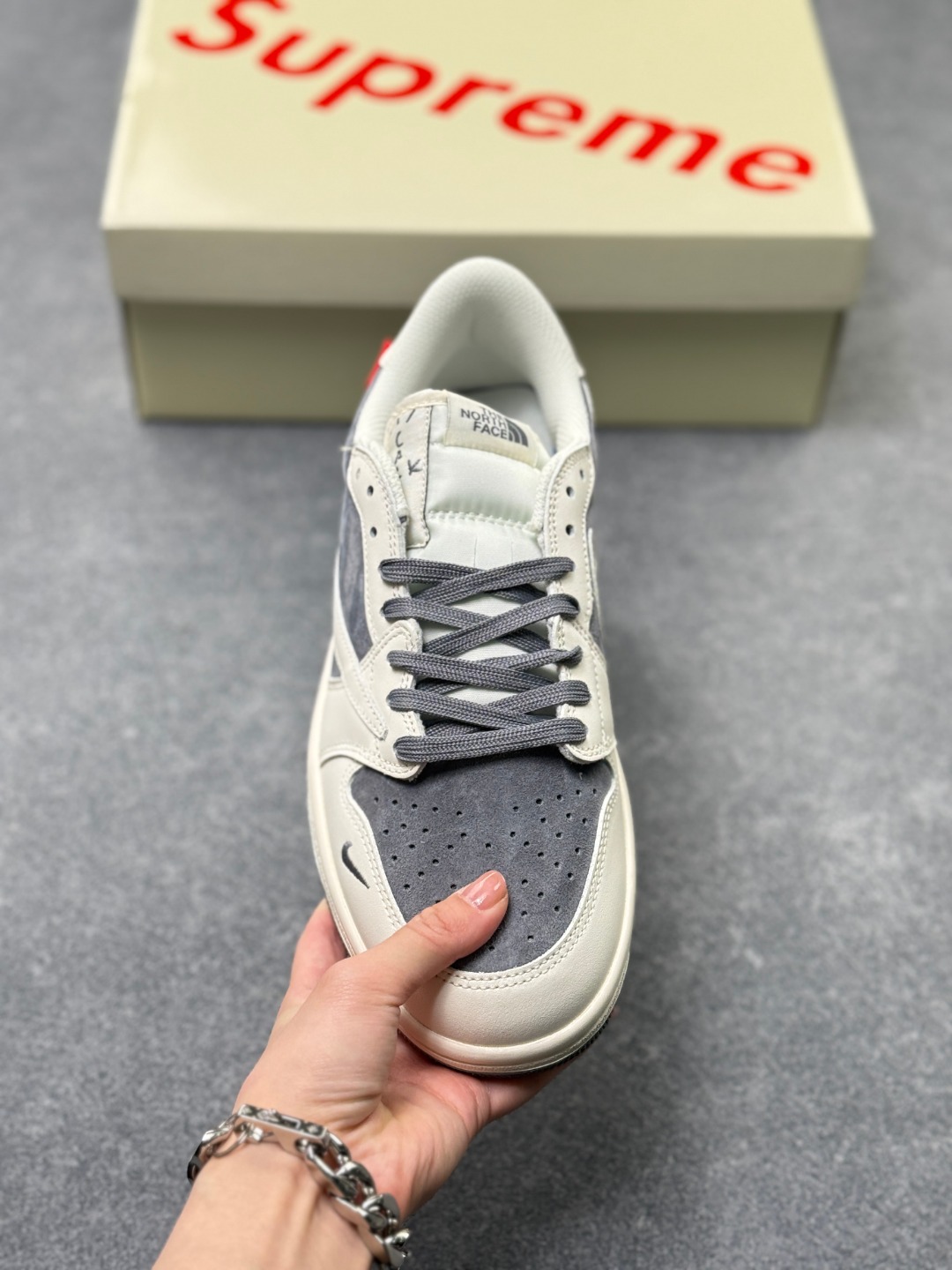 Travis Scott x Fragment Design x Jordan Air Jordan 1 Low OG SP 北面三方联名 米灰猪八革 多方联名合作融合了Travi灰勾s Scott 独特的音乐风格 藤原浩个性的设计风格以及Jordan品牌的经典元素 使其成为一双具有独特身份和价值的鞋子 清新而立体的外观加上联名标识更突出了其独特身份 这种配色方案显示出活力和时尚感 在视觉上引人注目 鞋身的质感和细腻的细节处理使其显得高端而格调十足 这款 倒钩 联名是设计与创意完美结合 融合多方的个性风格是一款备受瞩目的潮流鞋款 低帮休闲板鞋 定制鞋盒 大厂纯原品质出货 超高清洁度 皮料切割干净无任何毛边 细节完美