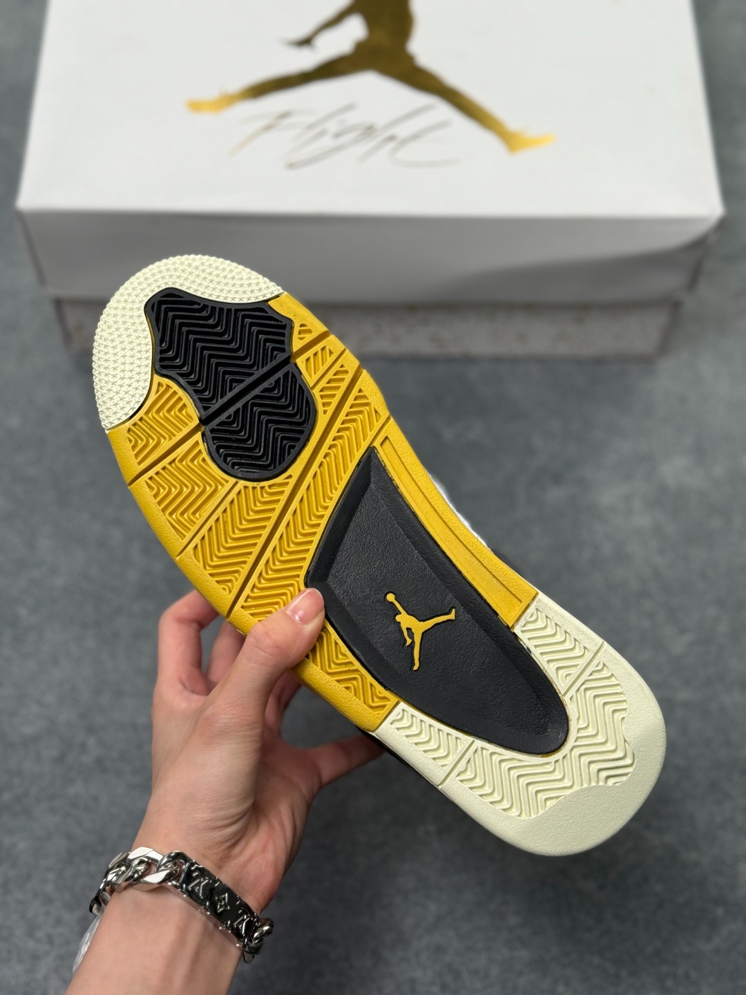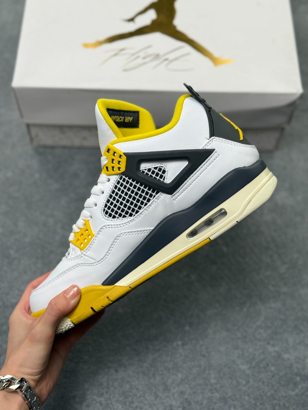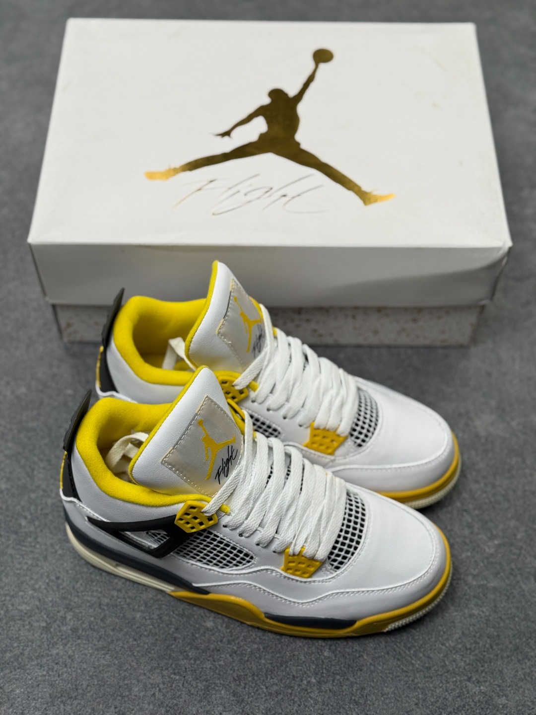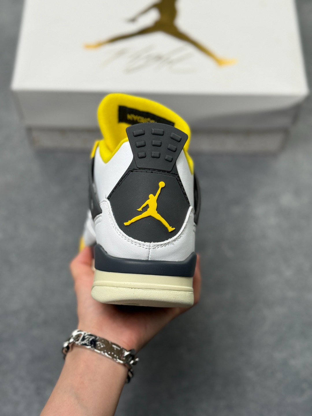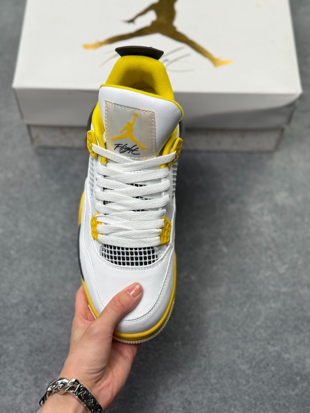 Air Jordan AJ4 Retro 黄雷电 全套原纸板楦头开发 原厂特供皮料加持 确保原汁原味 完美呈现四代版型 一比一鞋头弧度高度鞋身弧度 数据细节工艺流程均保持原鞋一致 原厂TPU网格鞋带扣 正确内里网布 菱角分明不变形无多余毛边 柔软性质感一致于原鞋 市场唯一原厂鞋扣模具 背面可见隐藏注塑口 原厂织唛标 原厂飞人电绣工艺 尾指中部跳三针 独家绑鞋带手法 印刷中底布 四线拉帮 米色美纹纸贴合固定 进口港宝加持 后跟自然饱满 全鞋荧光划线卡点 追求极致完美 每一双都是工艺品 多重QC质检 超越公司货的品控标准 实实在在的免检产品