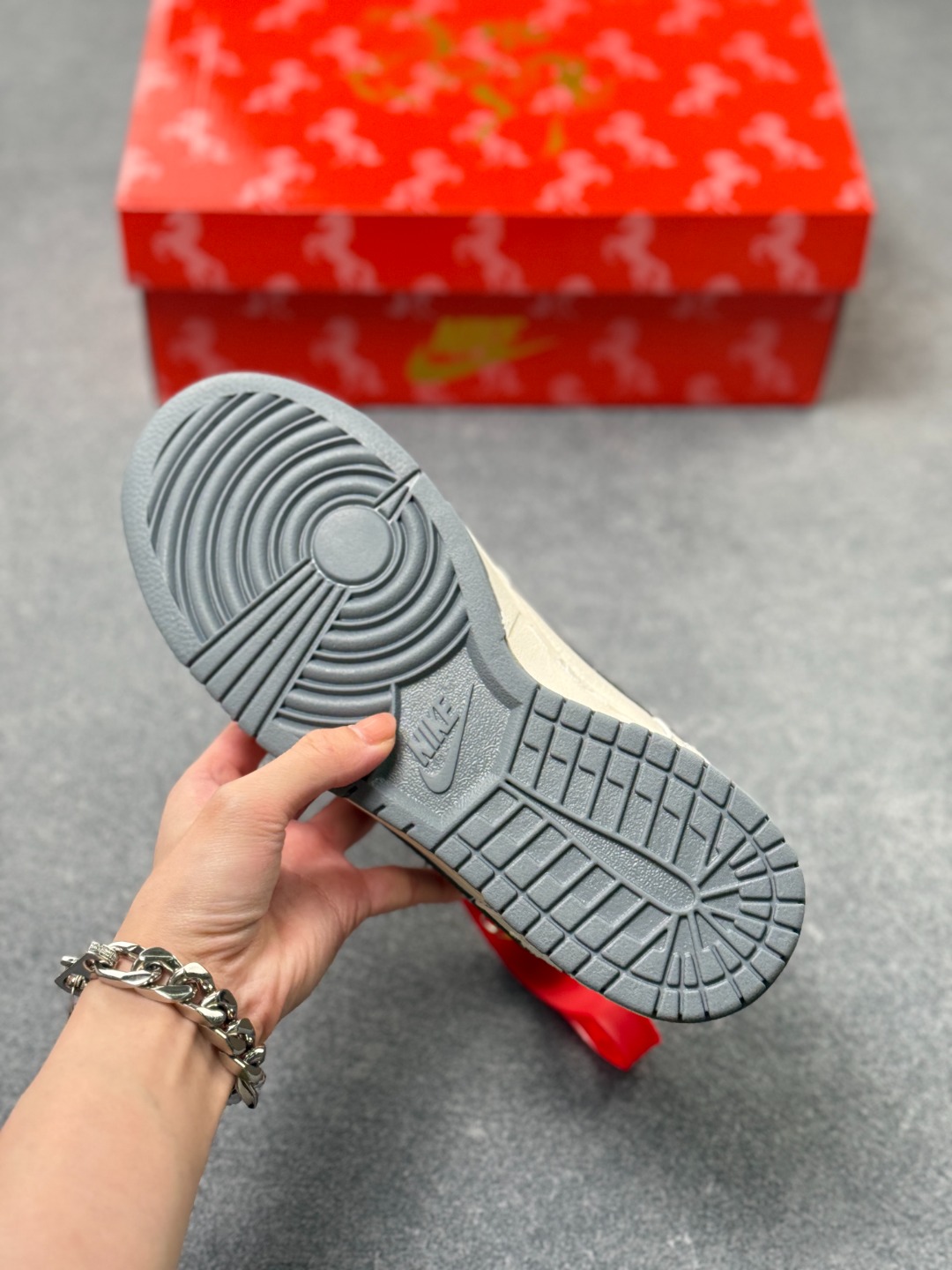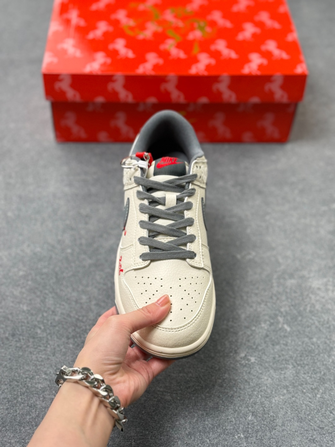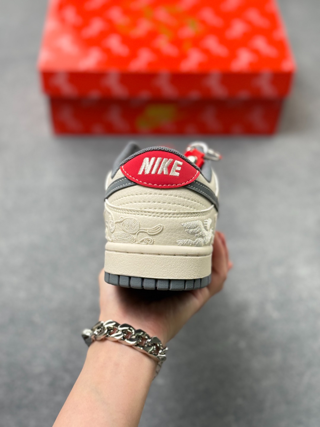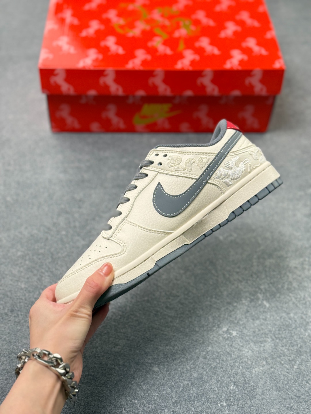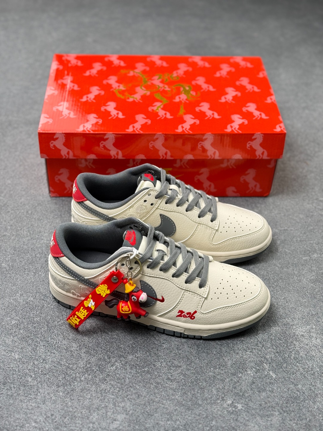 米白色皮革鞋身宛如未染尘的宣纸 匠心底料上压印着连绵的祥云暗纹 每一道纹路都藏着中式美学的含蓄与精致 烟灰色Swoosh侧身斜跨 红针勾边的细节像朱砂点睛 瞬间打破视觉的沉闷 让街头感与国风韵味撞出奇妙火花 鞋头处的 2026 红色烫印字样 既是新岁的专属标识 也让这双鞋成为你迎接新年的独特注脚 鞋舌与后跟的红灰撞色设计 延续了整体的国风配色逻辑 灰调的沉稳中和了红色的热烈 就像中式美学里的 藏 与 露 经典的低帮鞋型搭配橡胶大底 兼顾了日常穿搭的舒适度与街头造型的利落感 无论是搭配工装裤打造街头风 还是配汉服马面裙玩转出圈国潮混搭 都能轻松hold住全场 这双Nike Dunk Low 2026限定款 不止是一双潮鞋 更是把东方年味穿在脚下的新方式 新岁踏云 用一双有故事的Dunk 开启你的2026潮流序章