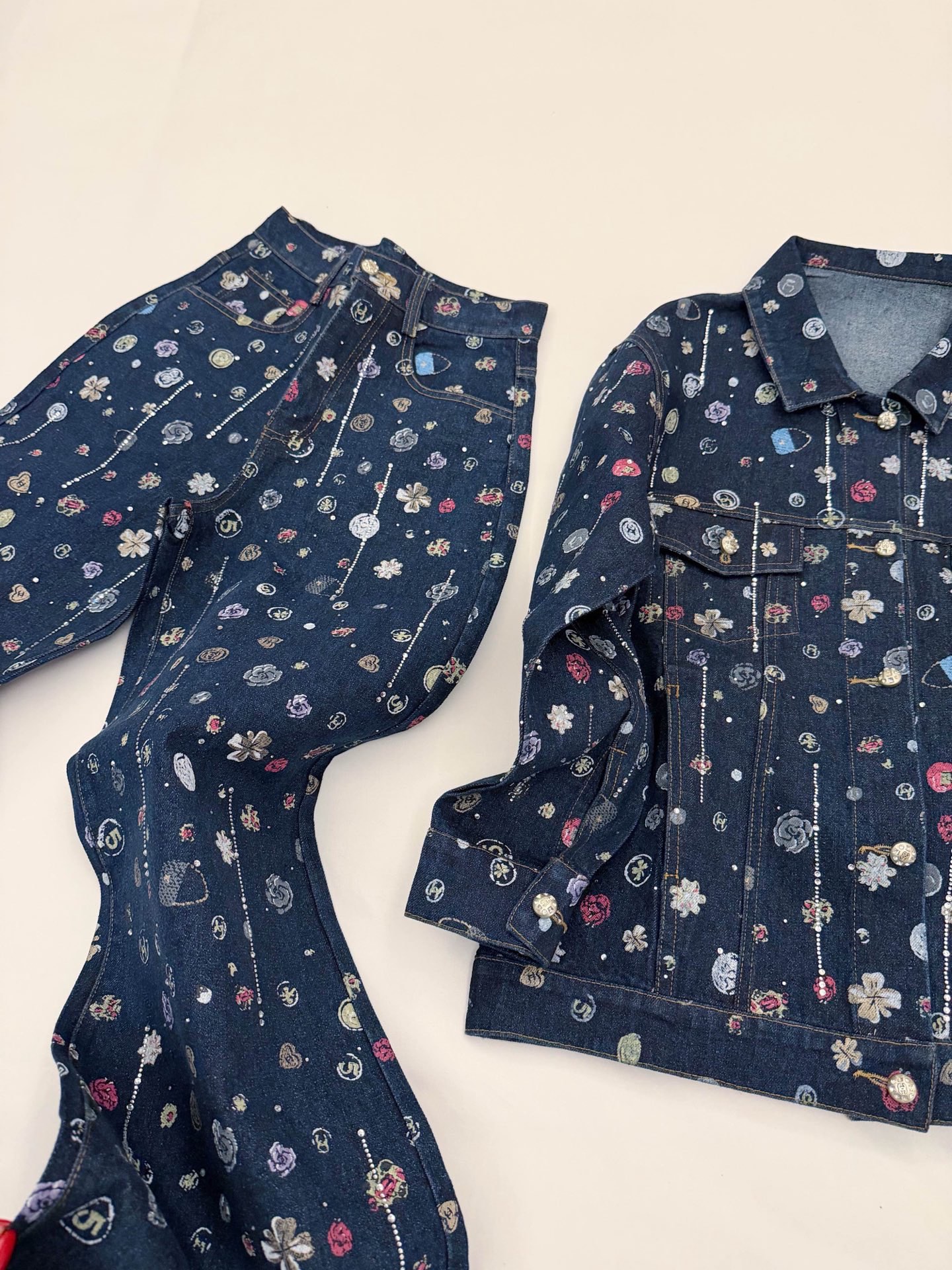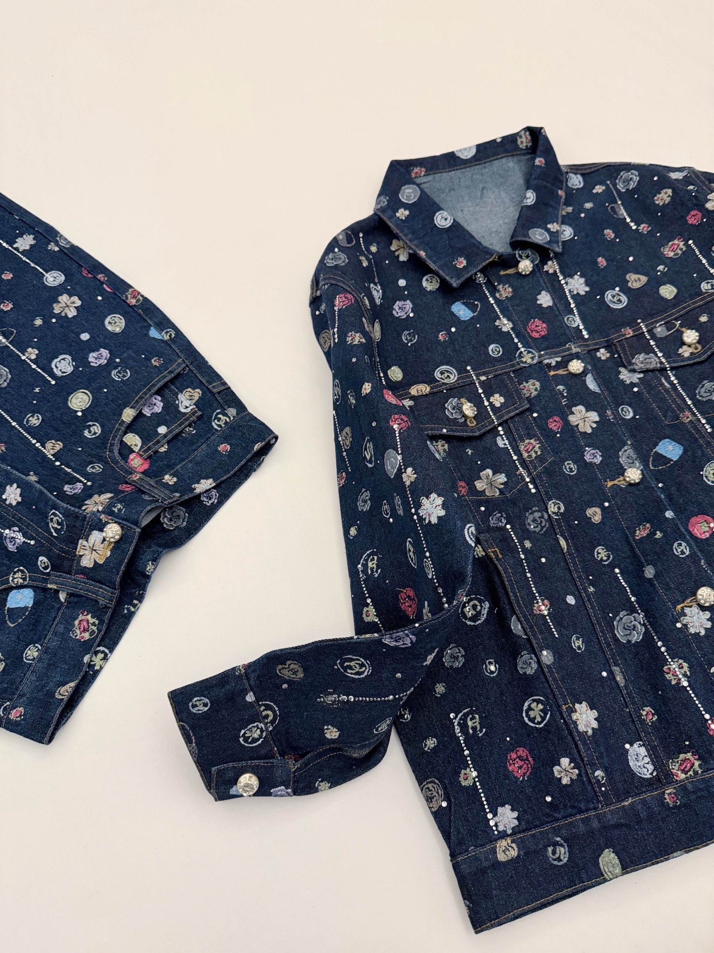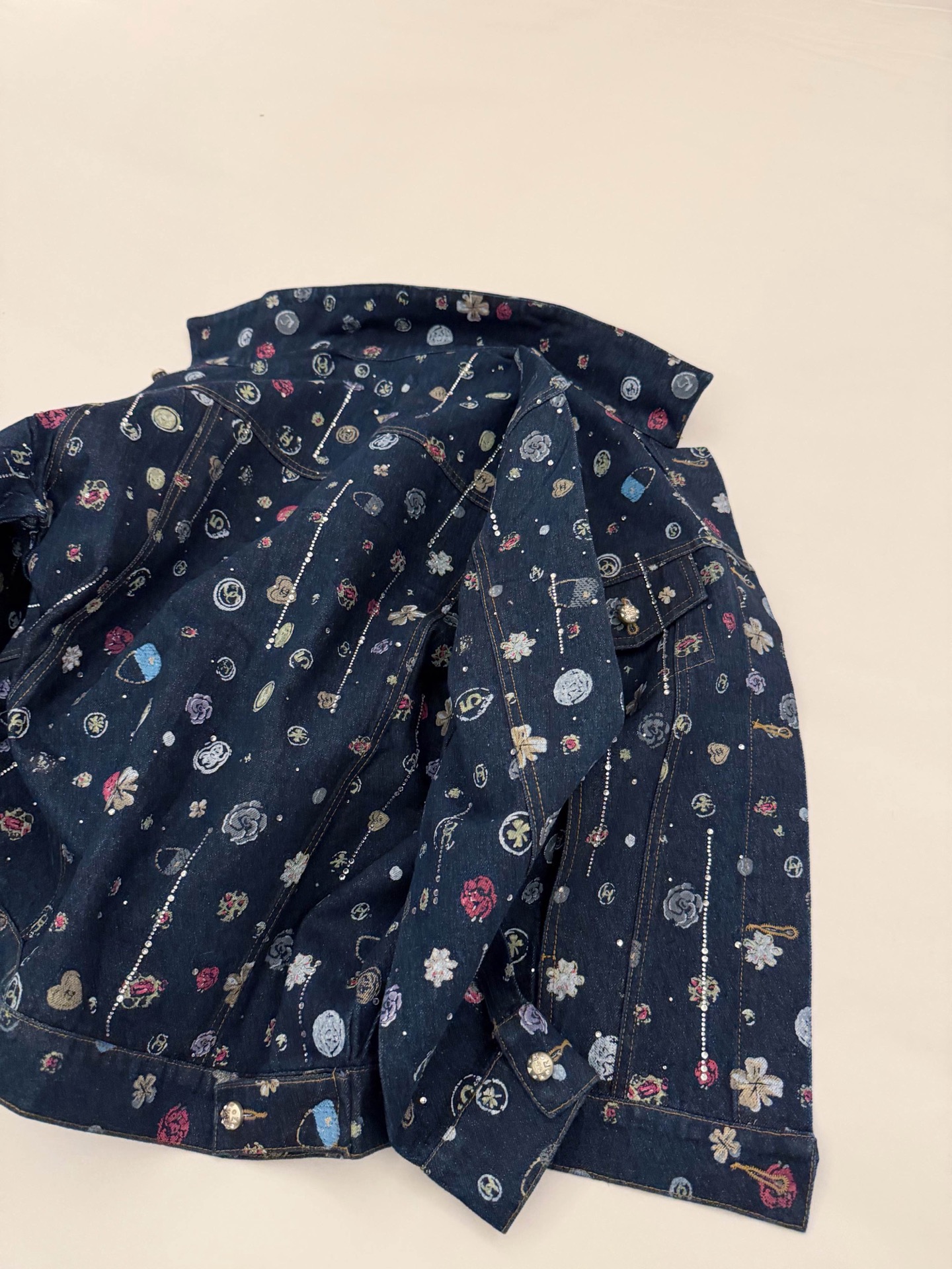 Chanel香奈儿小香双C字母山茶花满印流苏烫钻牛仔外套
