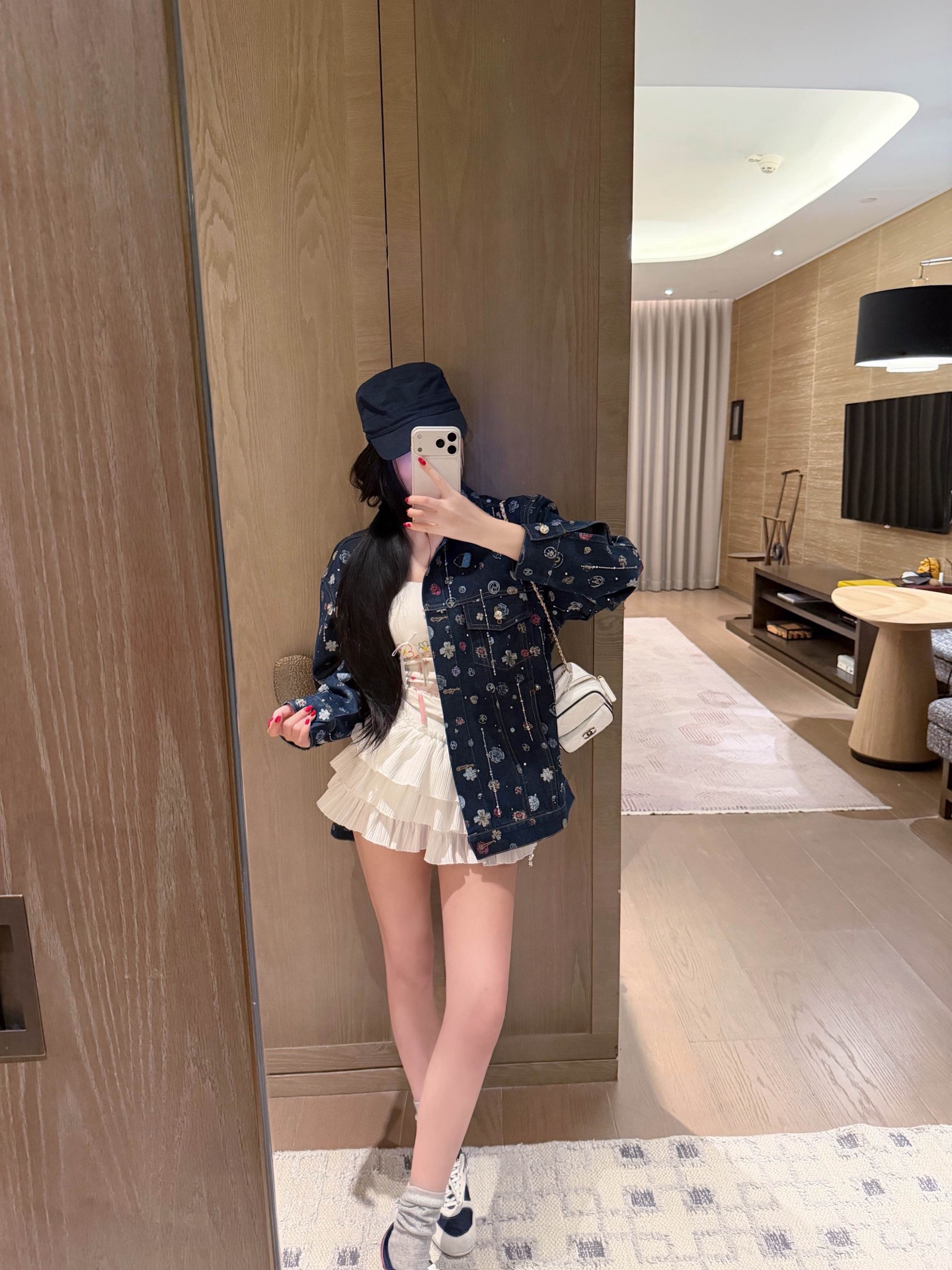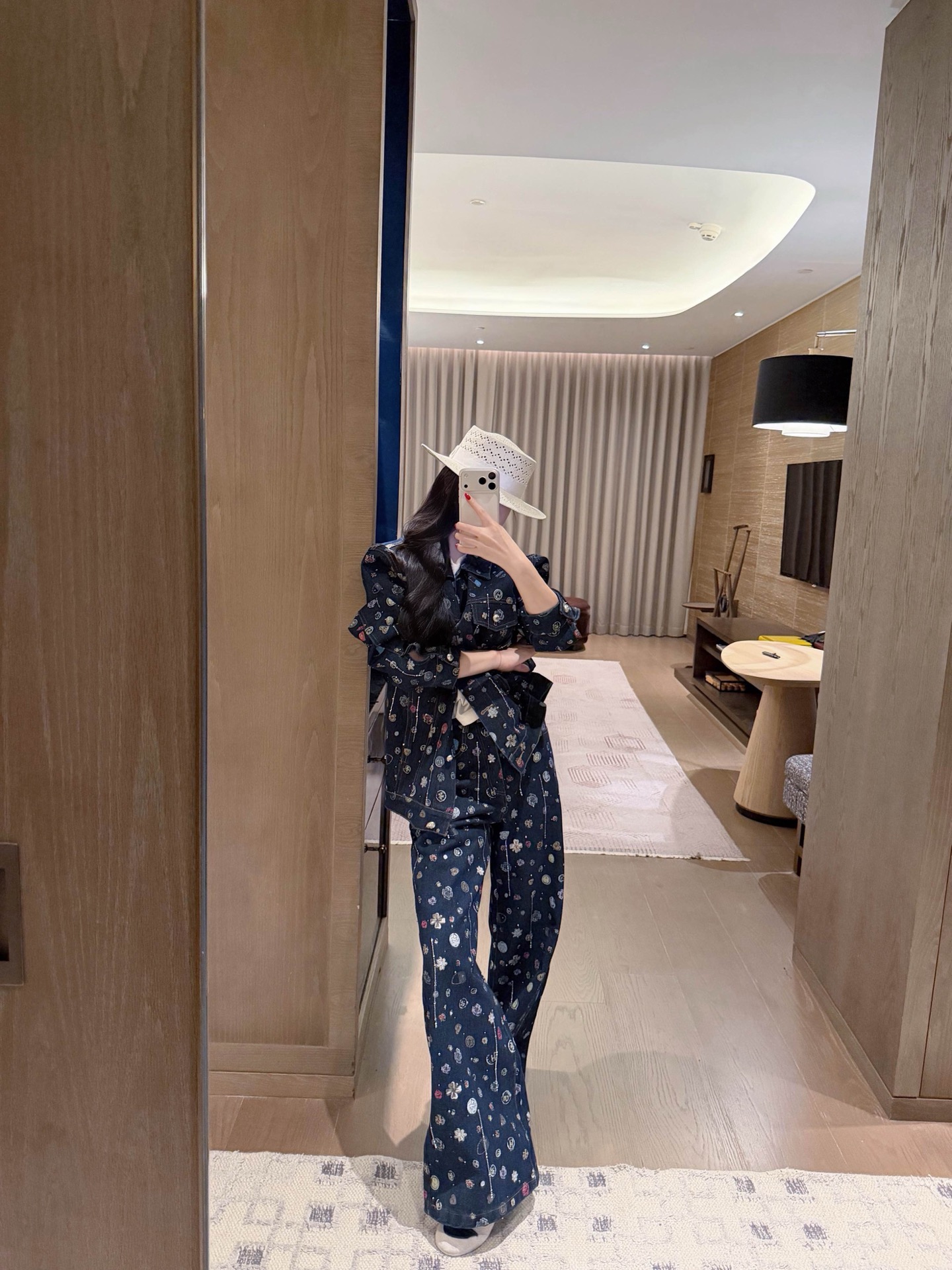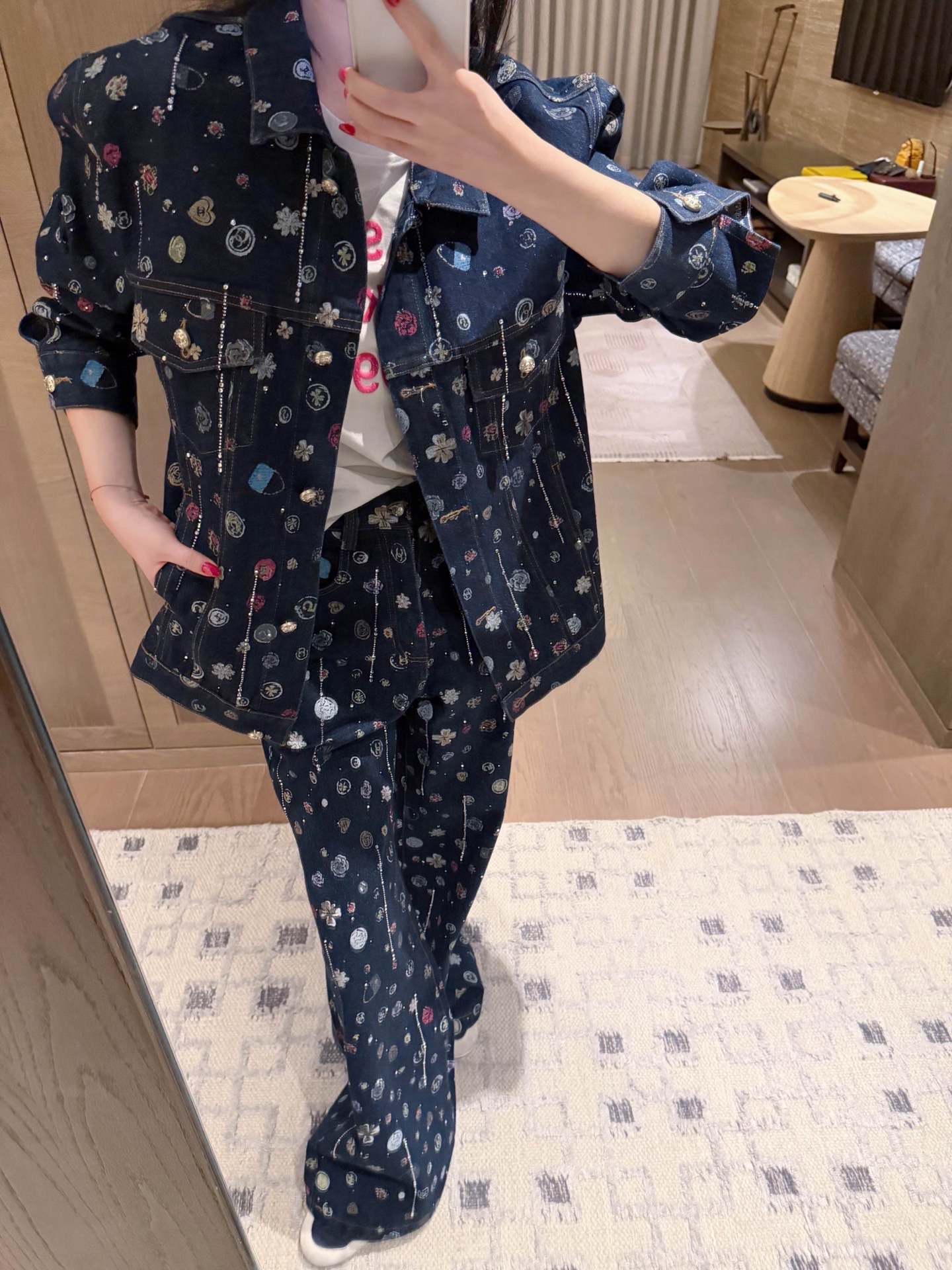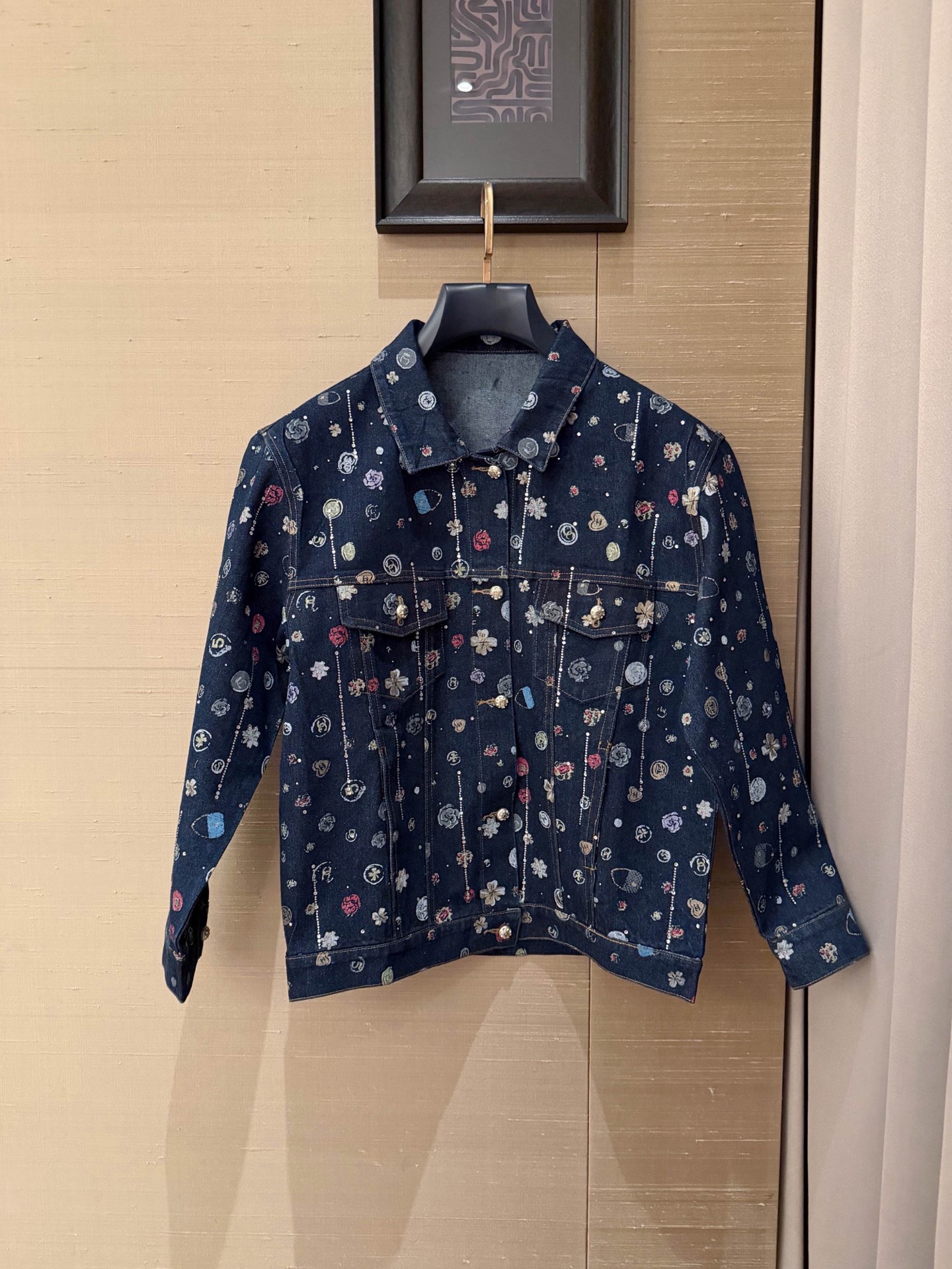 Chanel香奈儿小香双C字母山茶花满印流苏烫钻牛仔外套