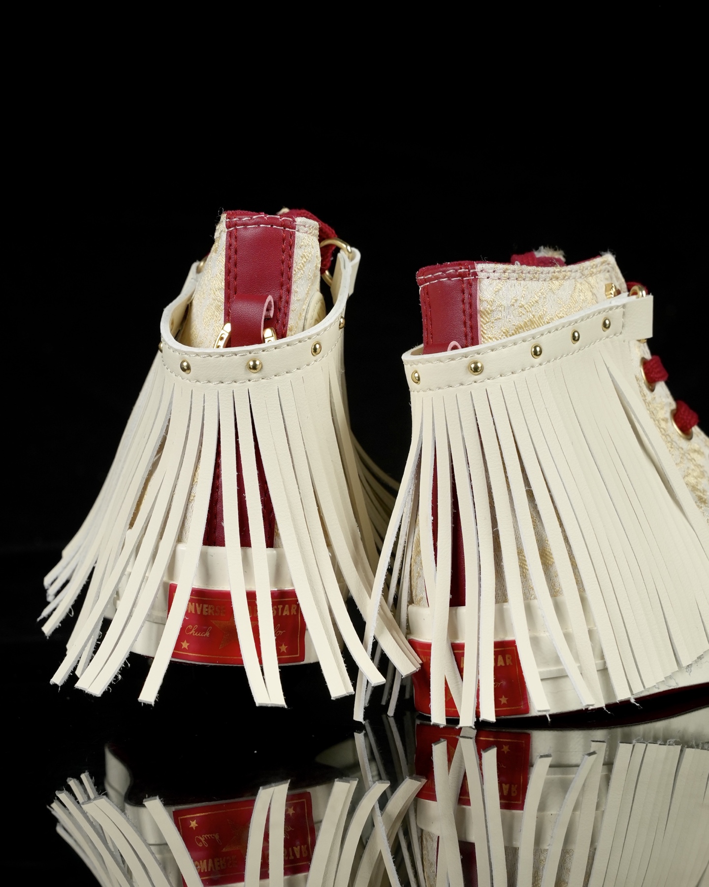 经典1970s鞋型披上新年战袍 白金红配色自带新年氛围 流苏可拆卸搭配双鞋带设计 鞋面材质纹理凸显质感 白底赤纹交织祥瑞 金色铆钉点缀鸿运 左牵酒红沉稳 右系彩带飞扬 每一步都踩出传统与潮流的交响