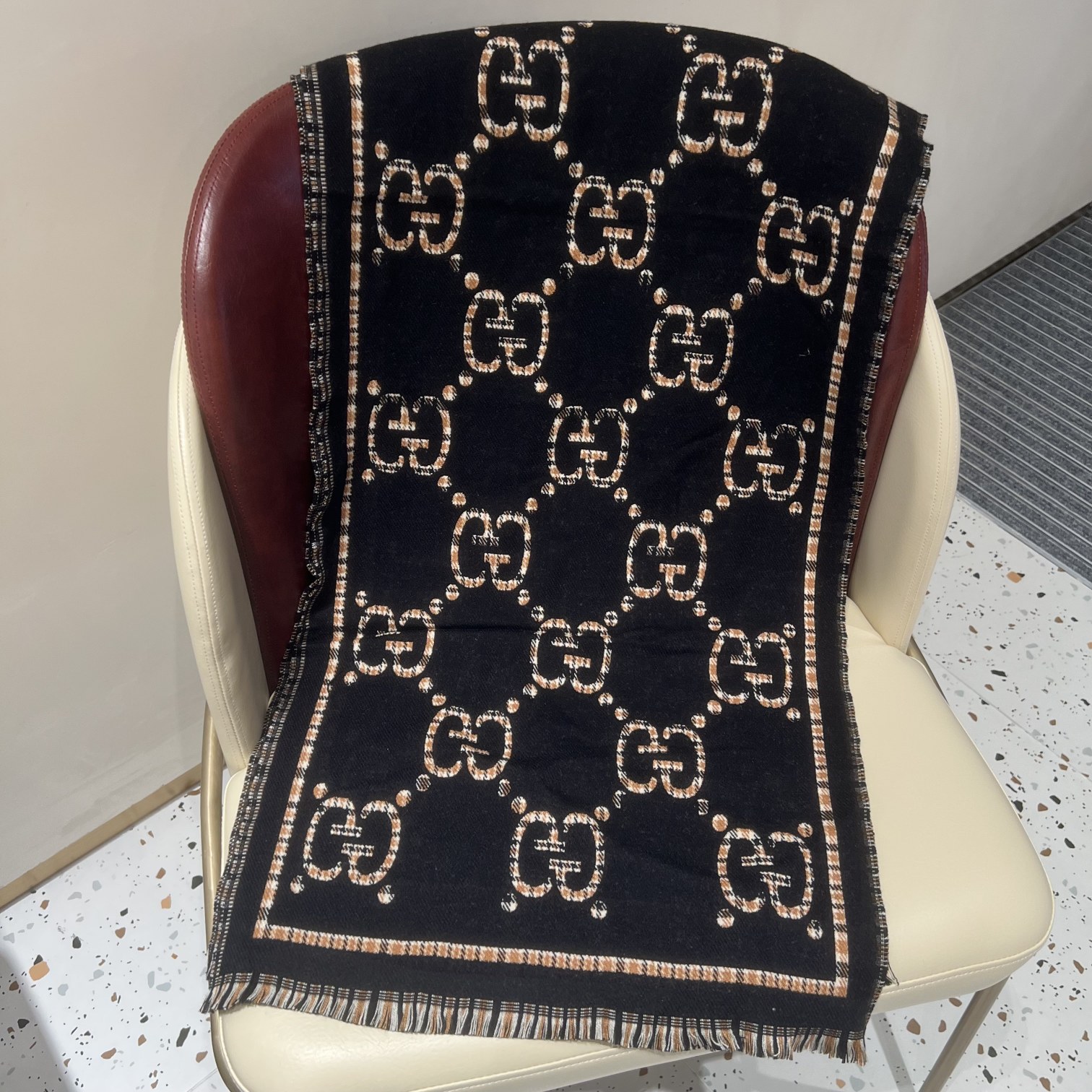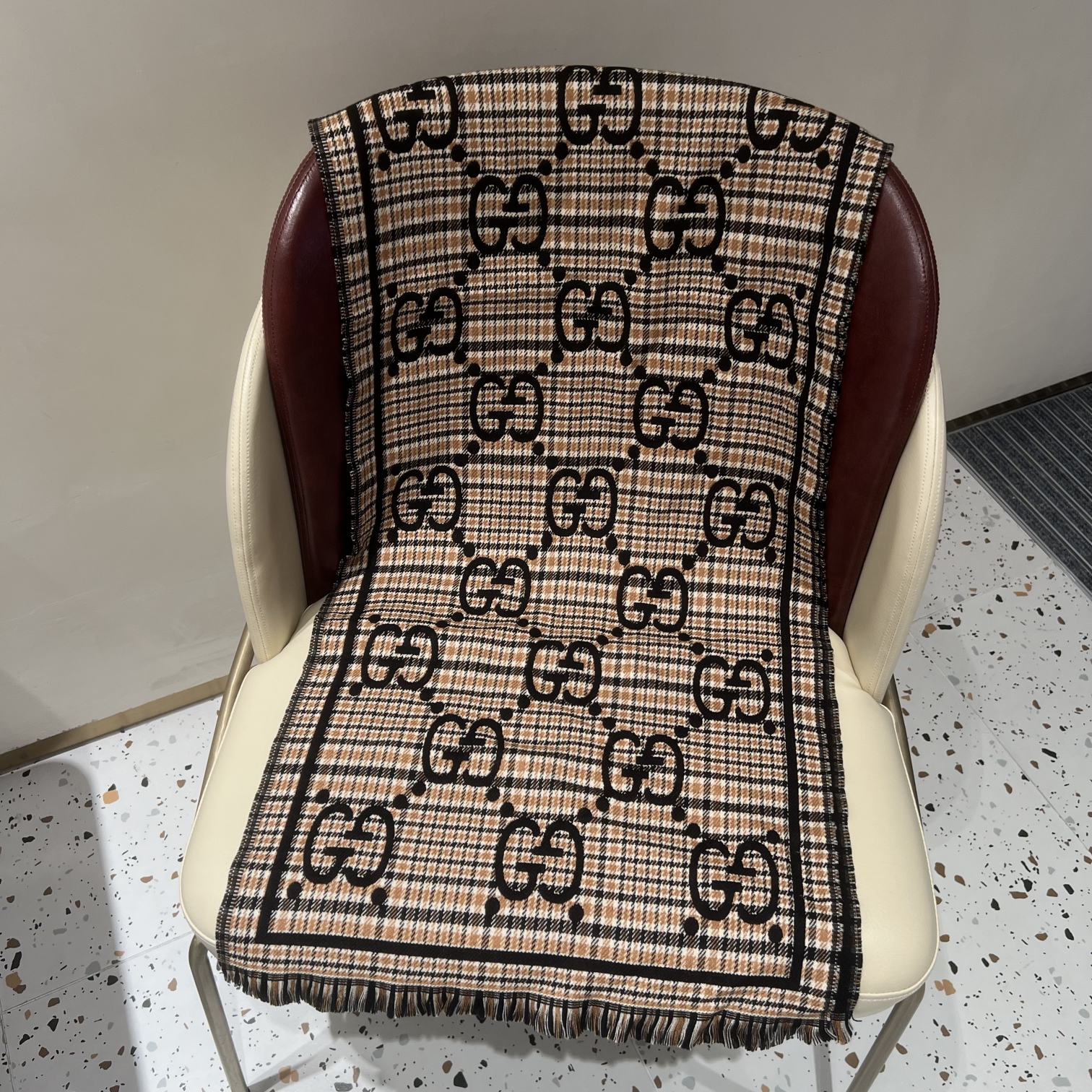 GUCCI 古驰 GG双面围巾 古奇专柜最新款双面围巾 断货王 一货难求 顶级品质 随意比对 配专柜礼盒包装 经典GG图案是品牌在30年代开始使用的标志性元素之一 历经近一个世纪的发展依然为品牌探索全新表达提供灵感 在这款羊毛围巾上 它以夸张的方式呈现 Gucci秋冬新款 专柜主打的GG时髦复古双面羊毛围巾 Gucci主打系列 太喜欢这样的调调了 长在很多喜欢复古时髦感人儿的审美上 这东西100 真心是好东西 中等厚度很温暖 这样的大披肩的 完全可以当一件小外套 凹造型又保暖 可围可披可系 软糯保暖 一条足够温暖 高端客户追求的品质 这样的极品货色面料柔软而厚实 总之 真心省钱省到家 尺寸规格 47 180cm