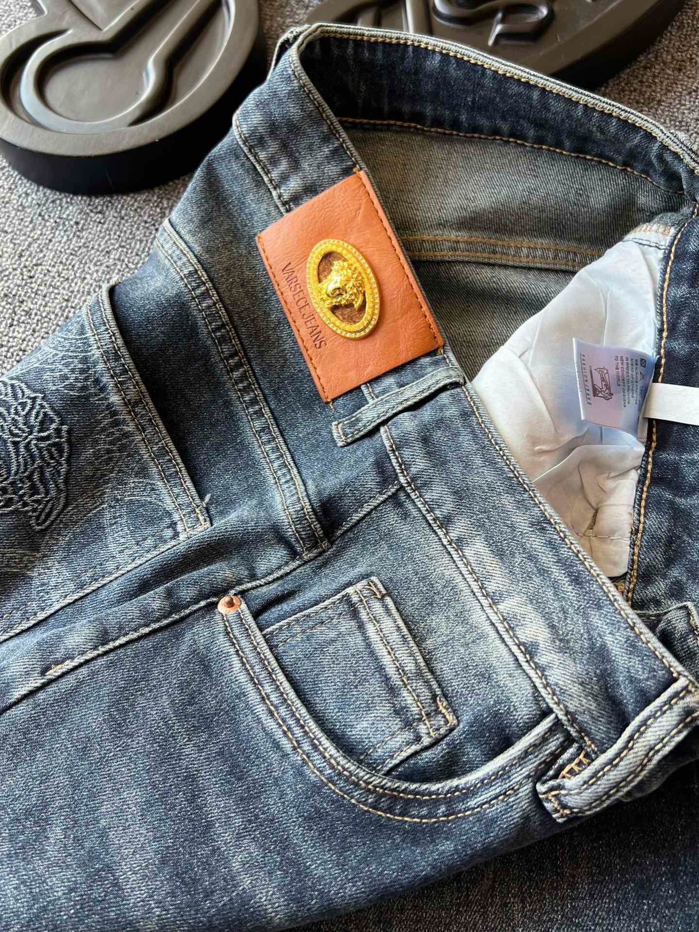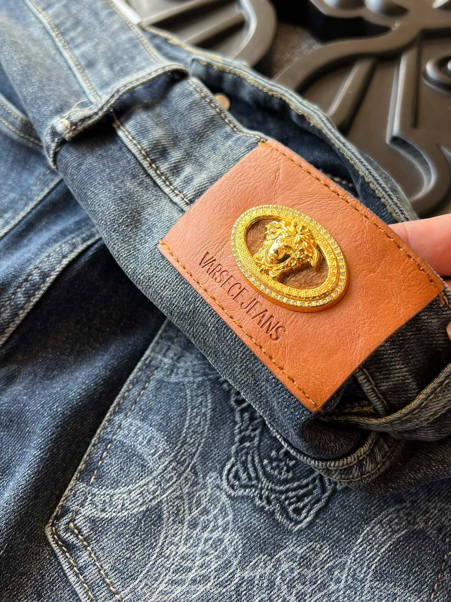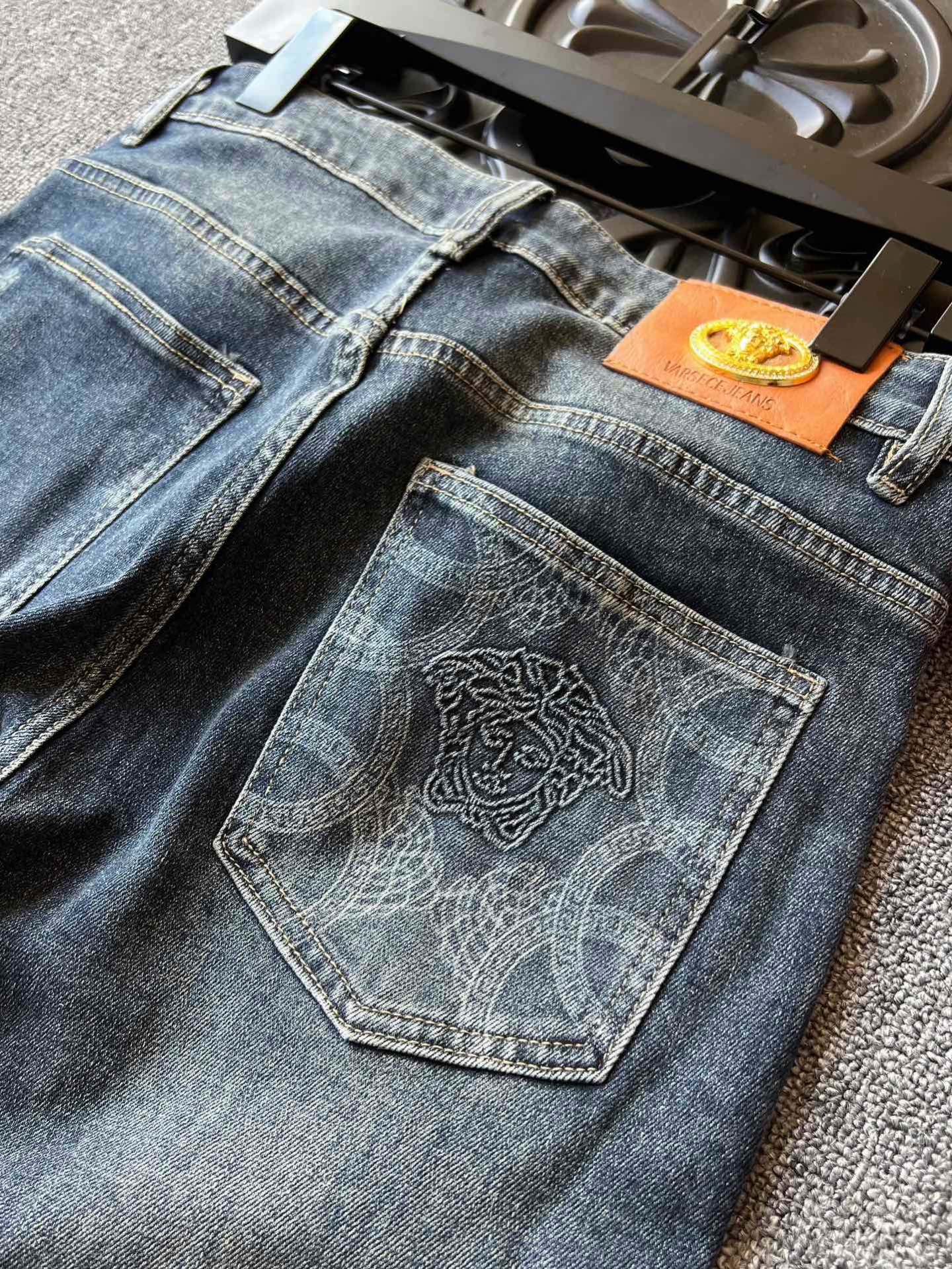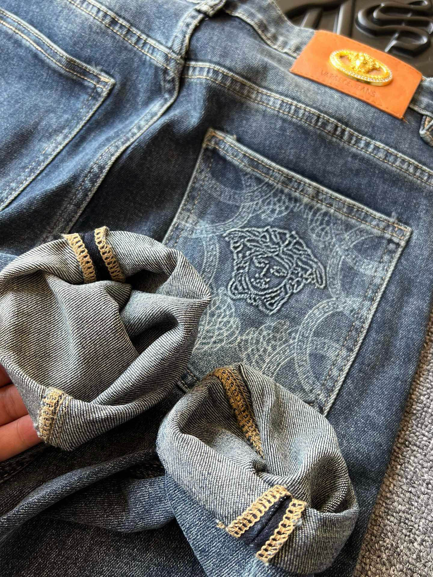 细节细节再细节 范思哲家专柜高奢牛仔裤 高端水洗蓝特调配色 裤前3D立体多层次打磨工艺 视觉效果特别精致 腰口定制浮雕美杜莎金属皮标 口袋高频凹凸美杜莎标识 内里包边精湛做工
