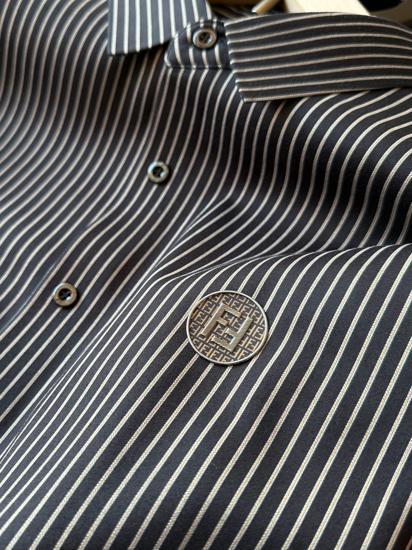 细节细节再细节 Fendi家商场新款双F长袖加绒衬衫 定位精致都市商务休闲系列 胸前圆形咖啡色双F满印带为基底 居中又做了浮雕3D立体双F芬迪金属丝工艺轮廓配套立体细节 十分精致 内里精湛做工 拼接处做了套结加固细节可圈可点