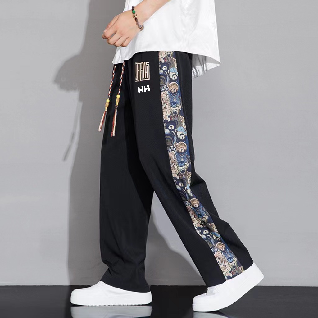 海丽汉森HH国风刺绣休闲裤韩版潮流拼接帅气春秋季情侣长裤直筒宽松休闲裤 男女同款