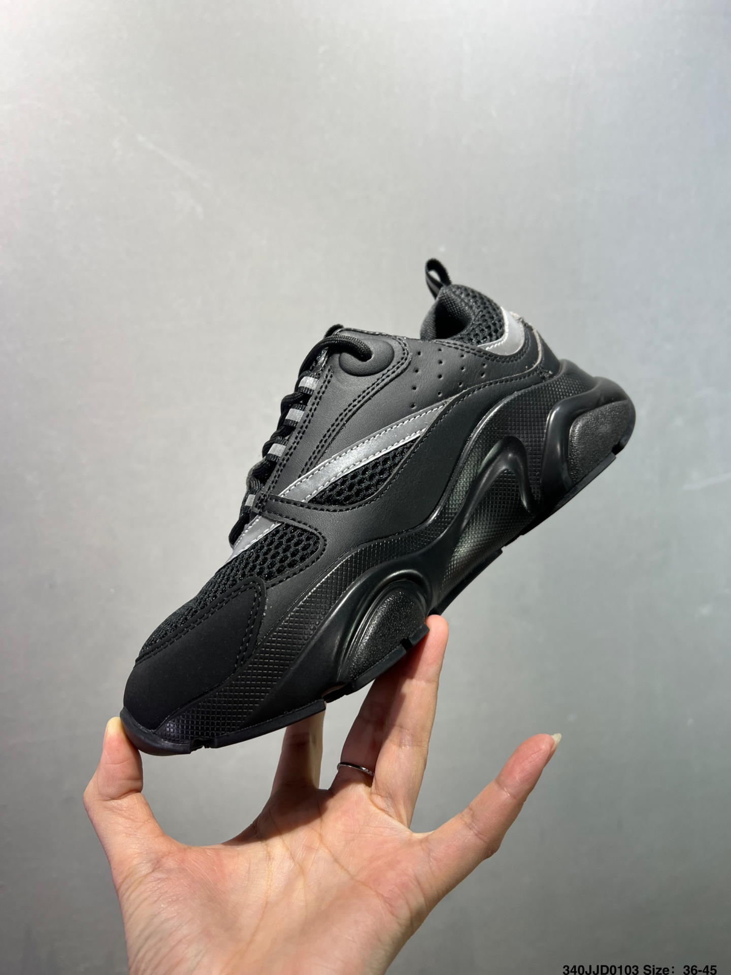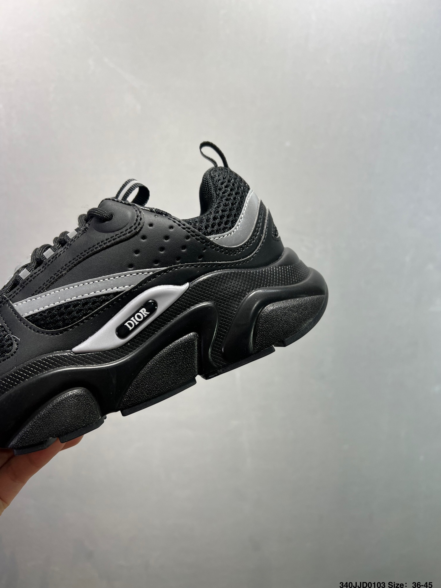 顺应复古市场的趋势的 Dad Shoes风格鞋款鞋舌上的Dior标志 也注明了这双鞋是B30的型号 B30运用了质感细腻的皮革和网眼布面材质拼接成鞋身 鞋身两侧有显眼的字母CD 表明身份 鞋身多处线条勾勒细节 让鞋子看起来不那么单调 复古味十足