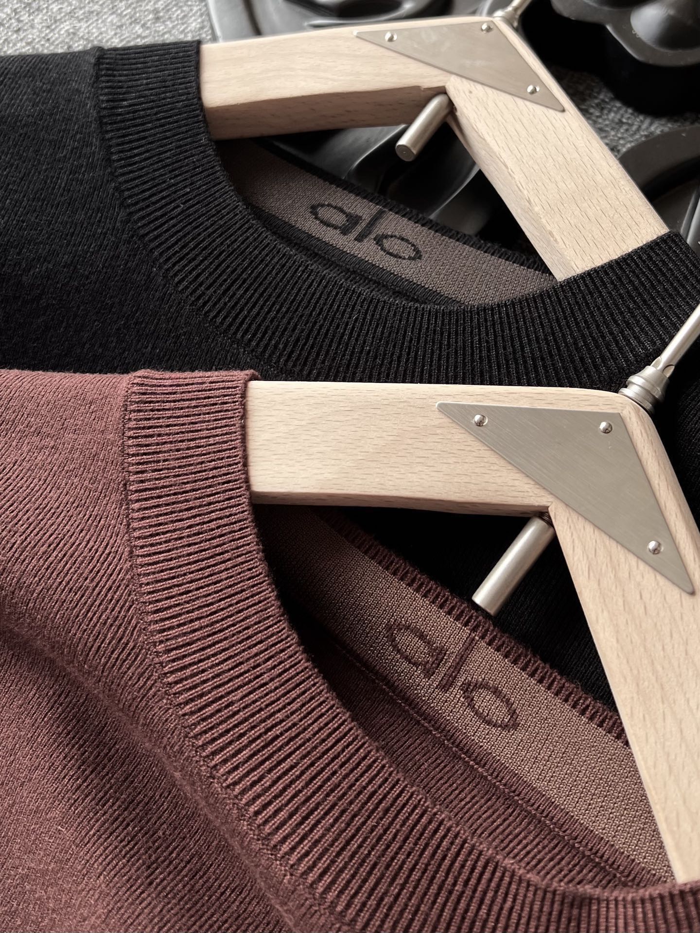 细节细节再细节 alo家商场新款超柔细支打底衫羊毛圆领毛衣 胸前3D立体高频凹凸alo硅胶小标 硅胶颜色也是做了对色处理 十分精致 领口做了双拼一体色织带有alo标识 双袖和下摆内里同样做了双拼色织四平针工艺 内里透露着精致