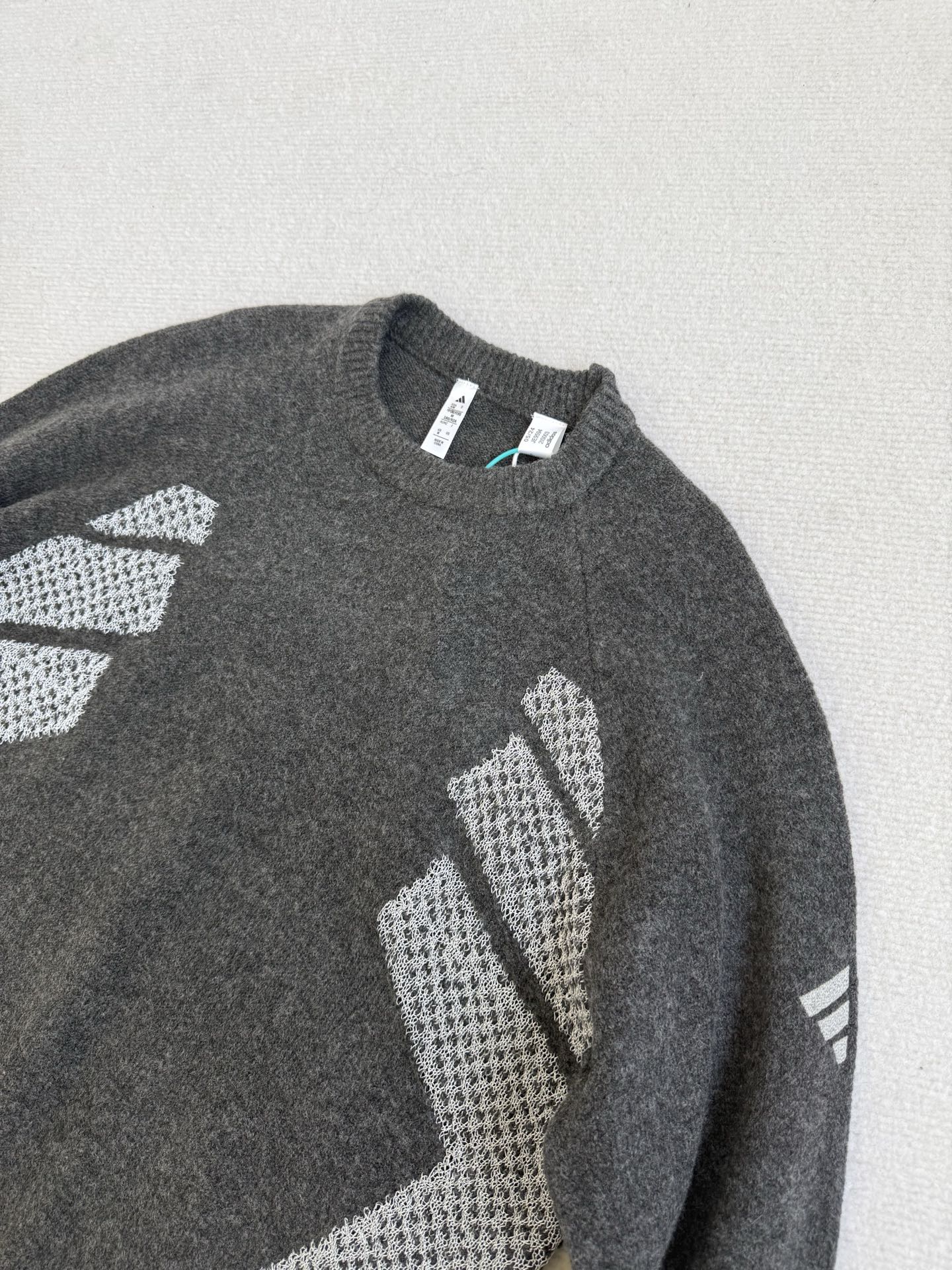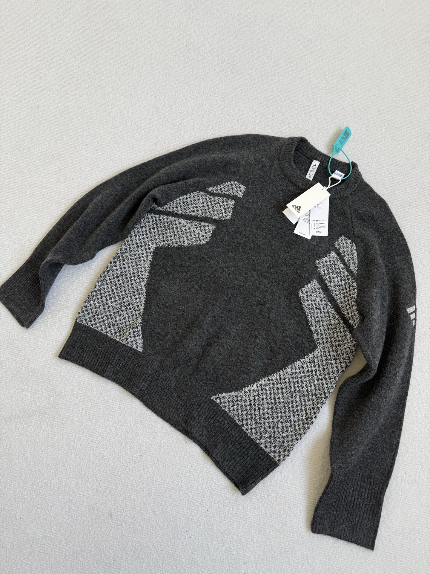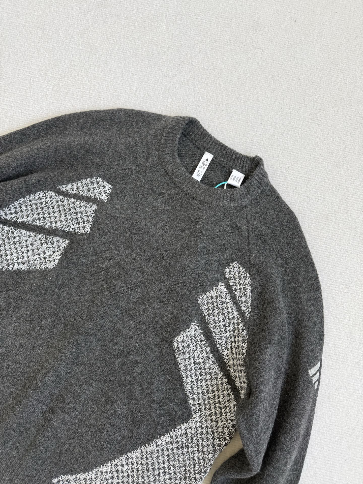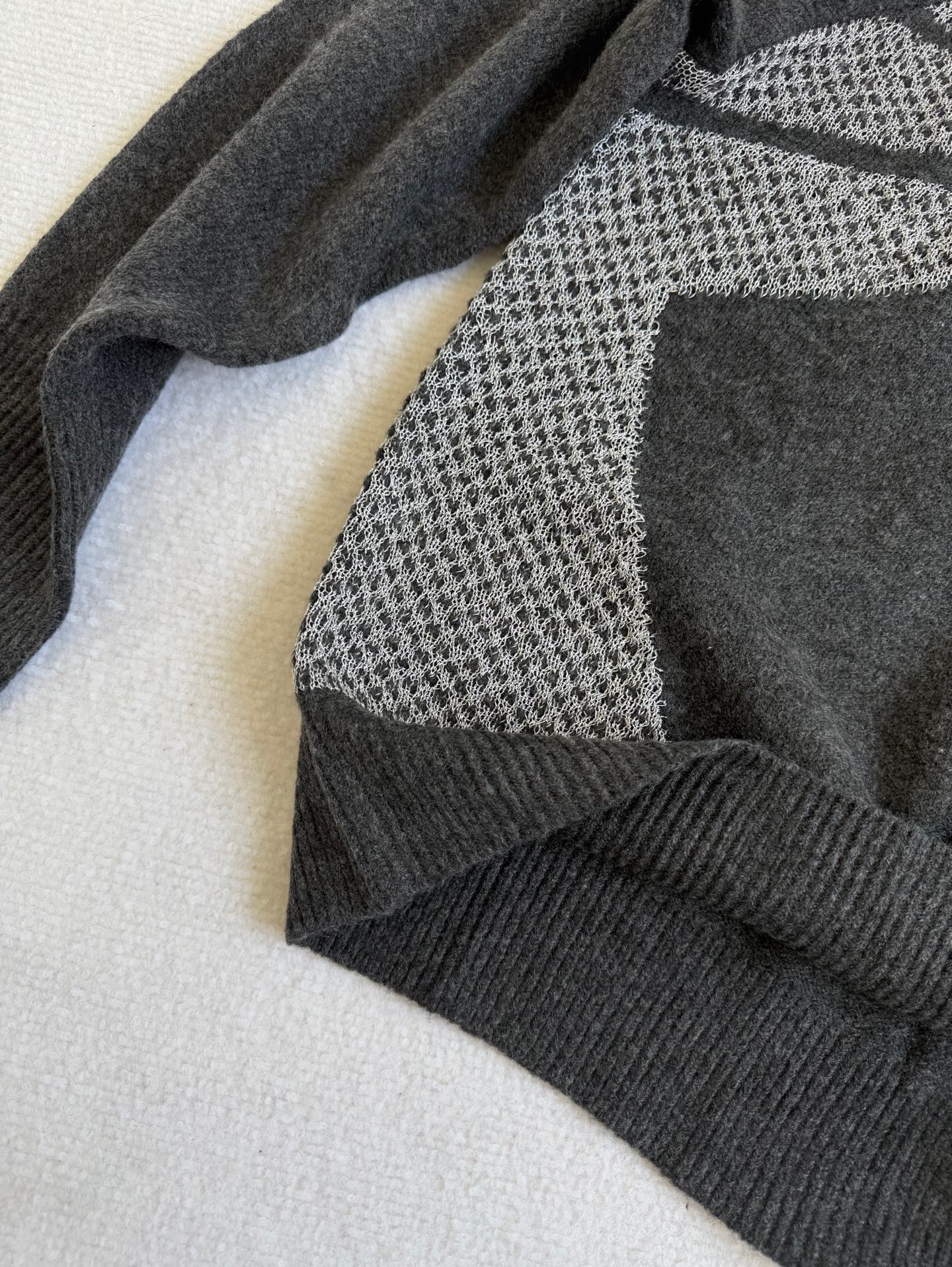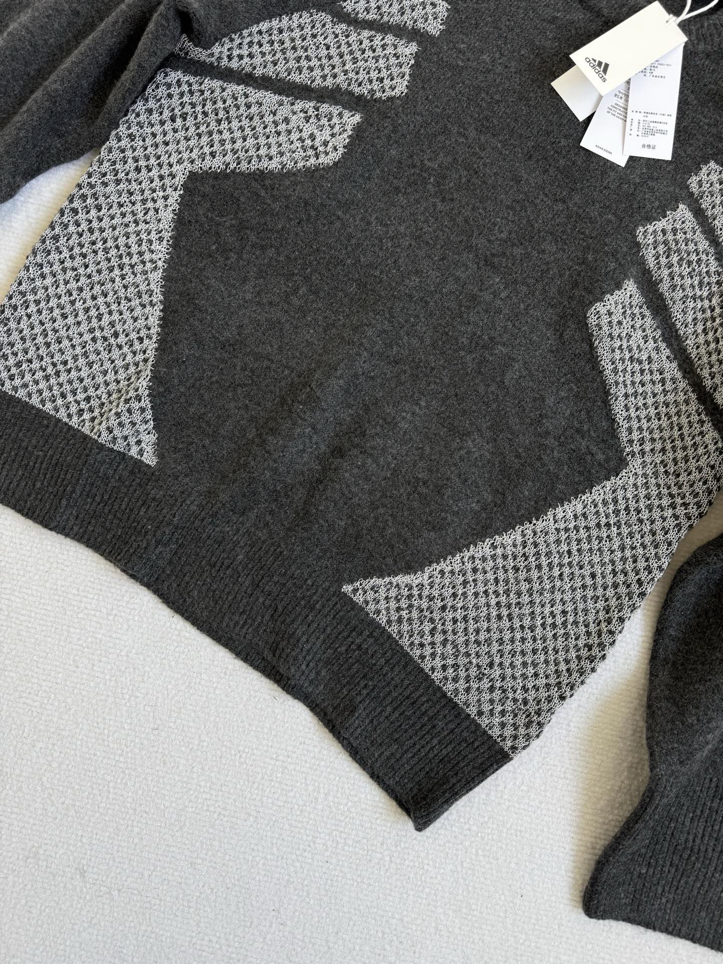 碳黑主调如都市暗夜里的高级注脚 自带 低调却抢镜 的氛围感Buff 侧身银色网眼纹理拼接堪称神来之笔 通透针织与密实面料的碰撞 在简约廓形中凿出建筑感层次 若隐若现的呼吸感 瞬间打破传统针织衫的沉闷刻板 袖臂处标志性三杠标识 以利落线条点睛品牌辨识度 却又克制得恰到好处