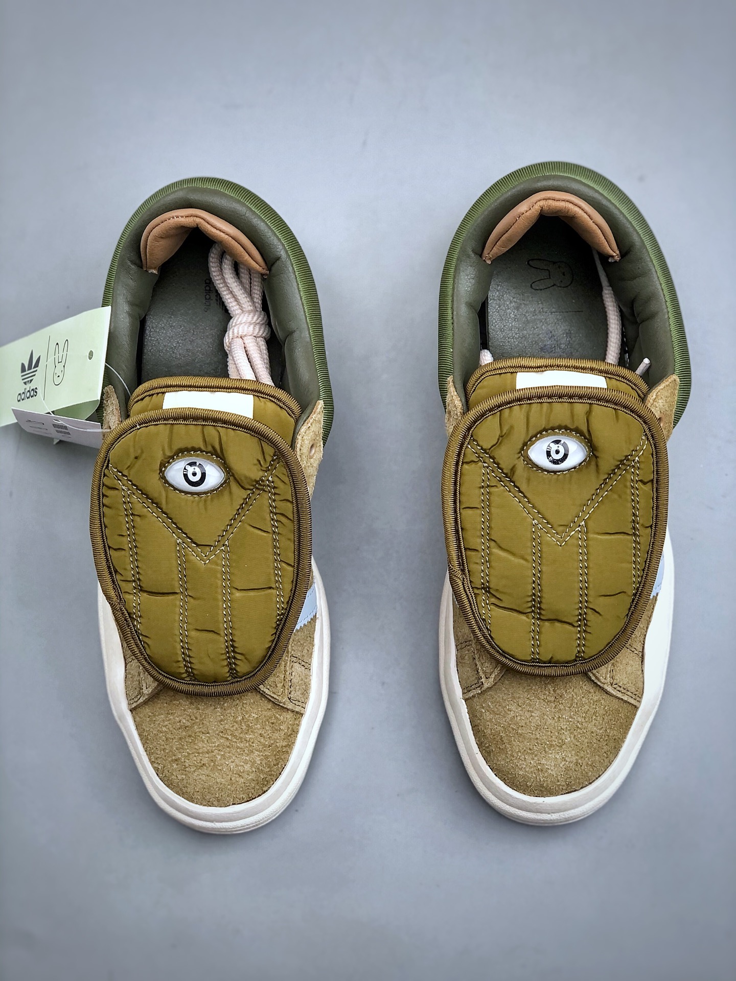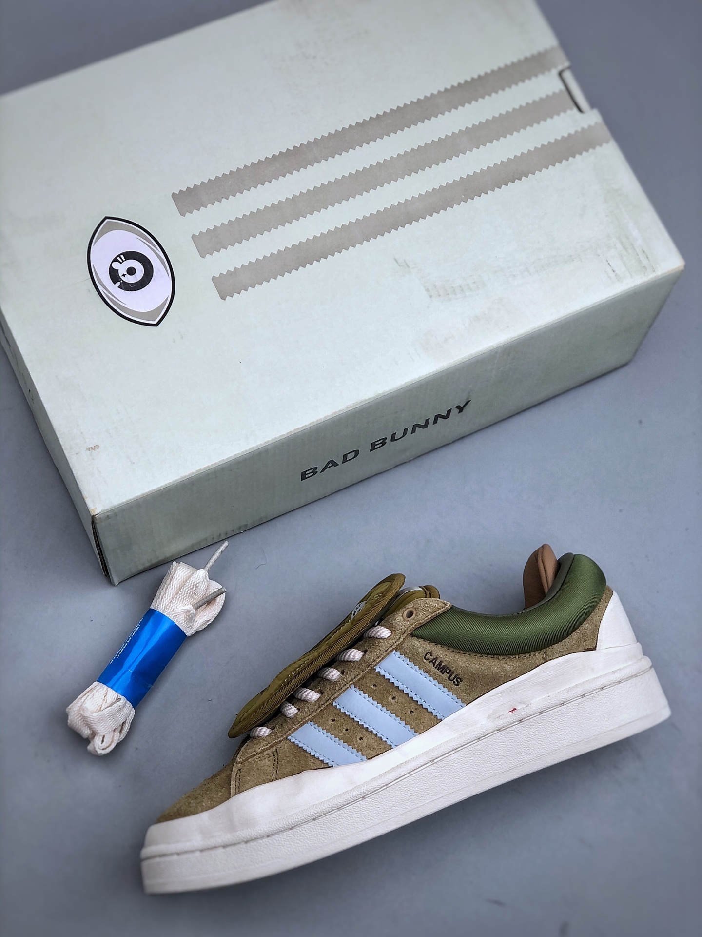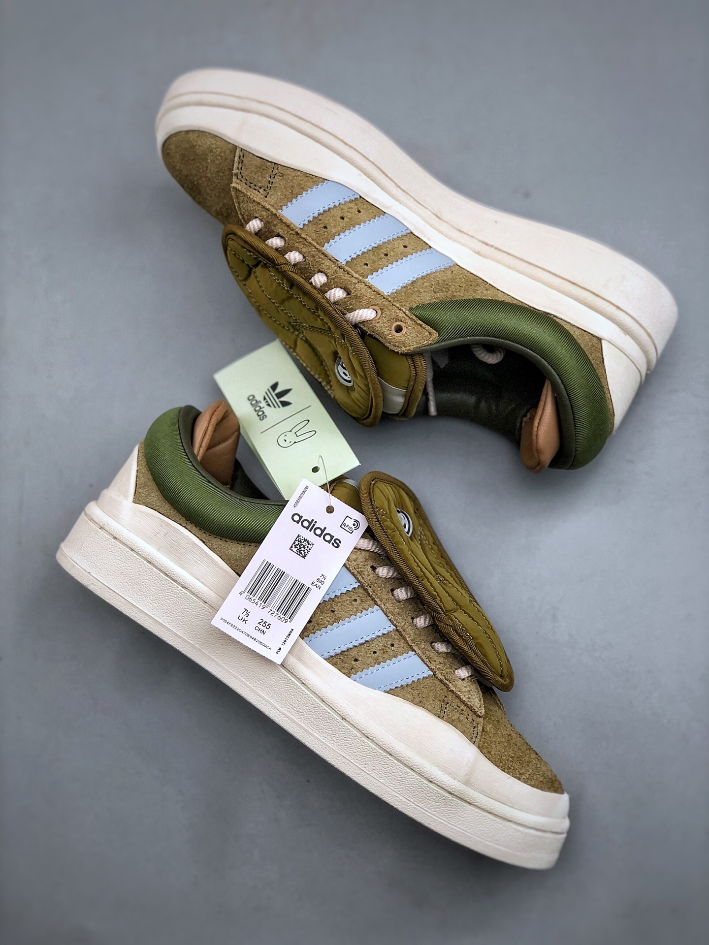 Bad Bunny x Adidas Campus 坏痞兔联名 阿迪达斯 低帮百搭潮流休闲运动板鞋 采用皮革鞋面和绒面革饰面 搭配标志性双鞋舌和双鞋垫设计 踝部束带跨过鞋带 辅以插扣设计助你随心挑选喜爱的颜色 配束带和插扣的系带系统 皮革鞋面 织物衬里 橡胶外底 货号 ID7950 尺码 36 45 半