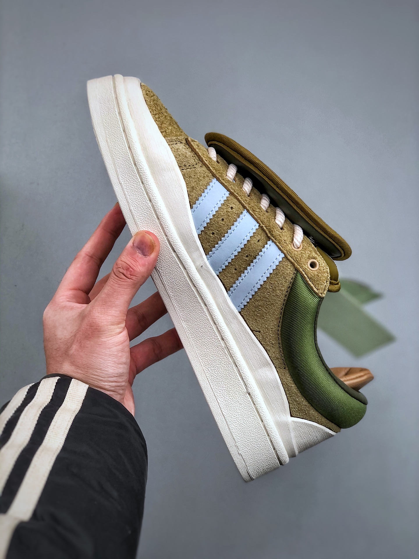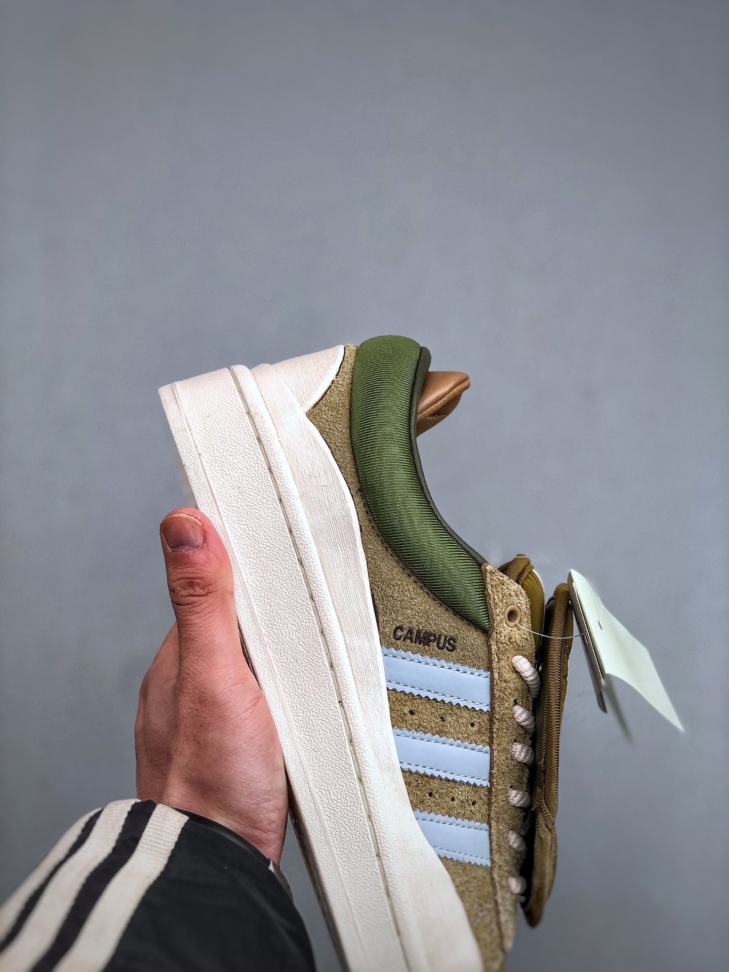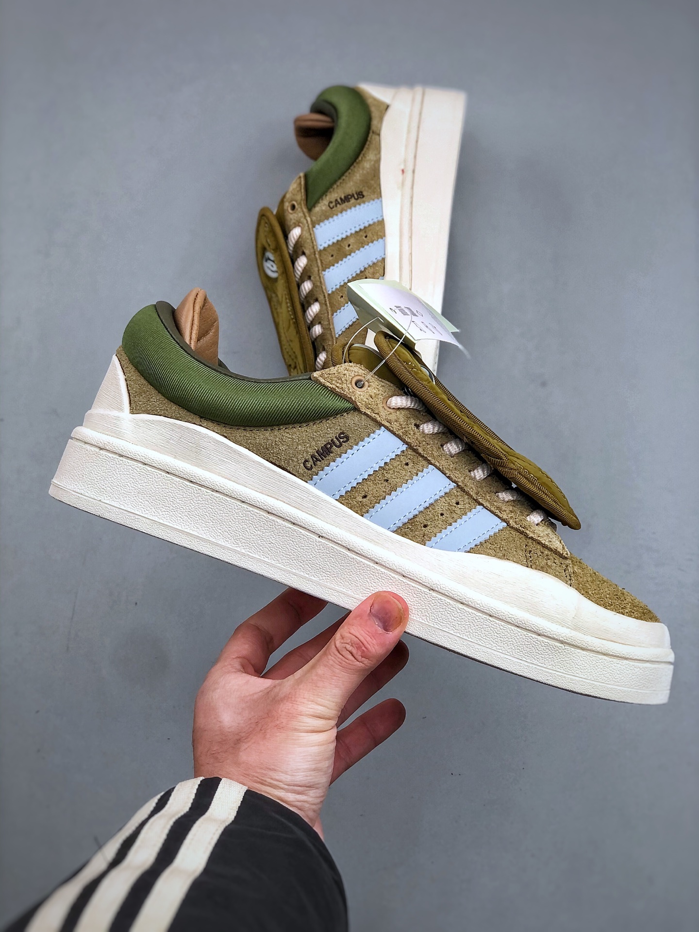 Bad Bunny x Adidas Campus 坏痞兔联名 阿迪达斯 低帮百搭潮流休闲运动板鞋 采用皮革鞋面和绒面革饰面 搭配标志性双鞋舌和双鞋垫设计 踝部束带跨过鞋带 辅以插扣设计助你随心挑选喜爱的颜色 配束带和插扣的系带系统 皮革鞋面 织物衬里 橡胶外底 货号 ID7950 尺码 36 45 半