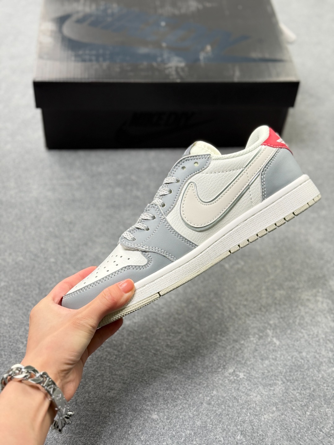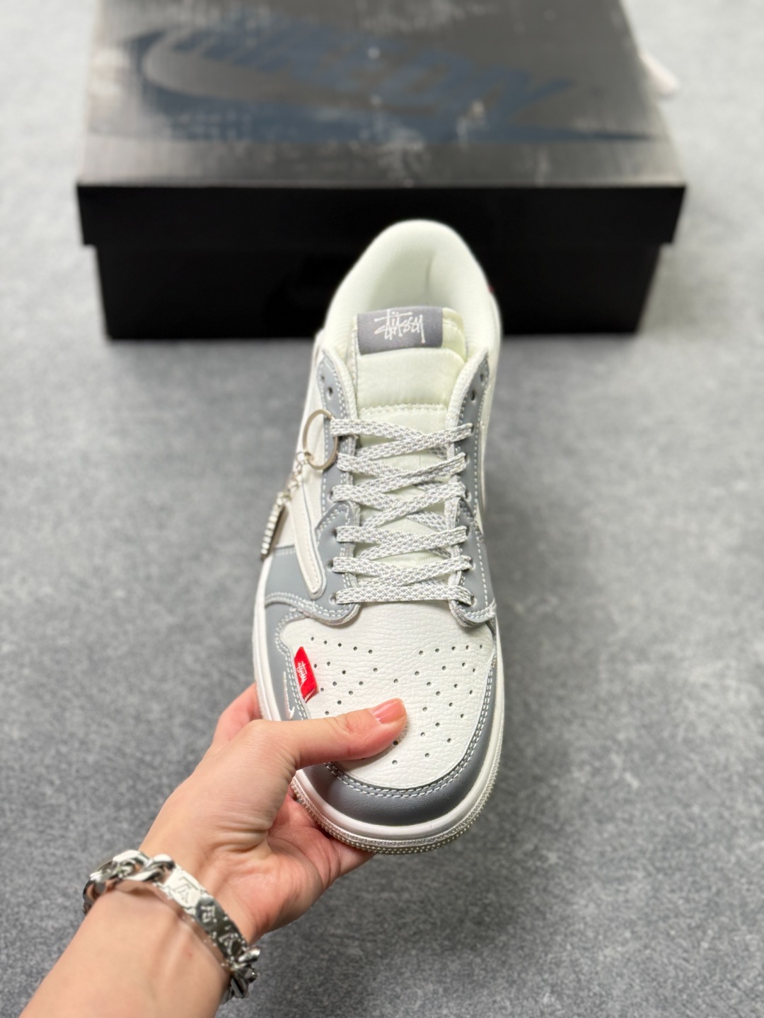 定制版 Travis Scott x Fragment Design x Jordan Air Jordan 1 Low OG SP 斯图西联名 白灰红尾 多方联名合作融合了Travi翻毛蓝勾s Scott 独特的音乐风格 藤原浩个性的设计风格以及Jordan品牌的经典元素 使其成为一双具有独特身份和价值的鞋子 清新而立体的外观加上联名标识更突出了其独特身份 这种配色方案显示出活力和时尚感 在视觉上引人注目 鞋身的质感和细腻的细节处理使其显得高端而格调十足 这款 倒钩 联名是设计与创意完美结合 融合多方的个性风格是一款备受瞩目的潮流鞋款 低帮休闲板鞋