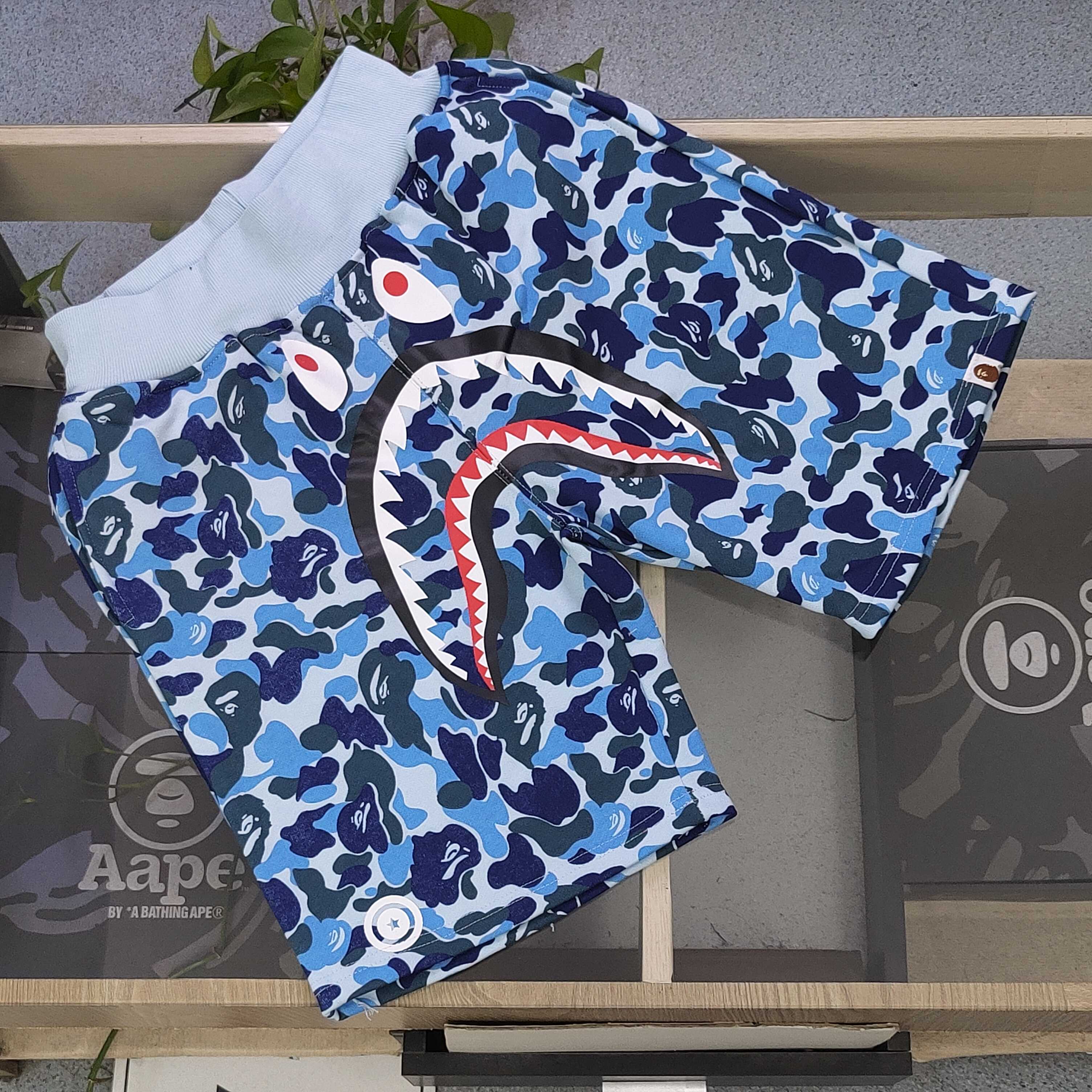 2025新款Bape猿人头联名鲨鱼ABC迷彩图案logo休闲情侣毛圈短裤五分裤 潮人出街 怎能少了这款吸睛神器 迷彩交织 碰撞出不羁的时尚火花 搭配正面霸气侧漏的鲨鱼嘴图案 红齿白目 张力十足 每一针每一线都在诉说着独特与个性 浅蓝裤腰设计 舒适与潮流兼具 穿上它 即刻化身街头焦点 轻松驾驭潮流风向 释放属于你的独特魅力 让每一步都踏响时尚的鼓点 男女同款