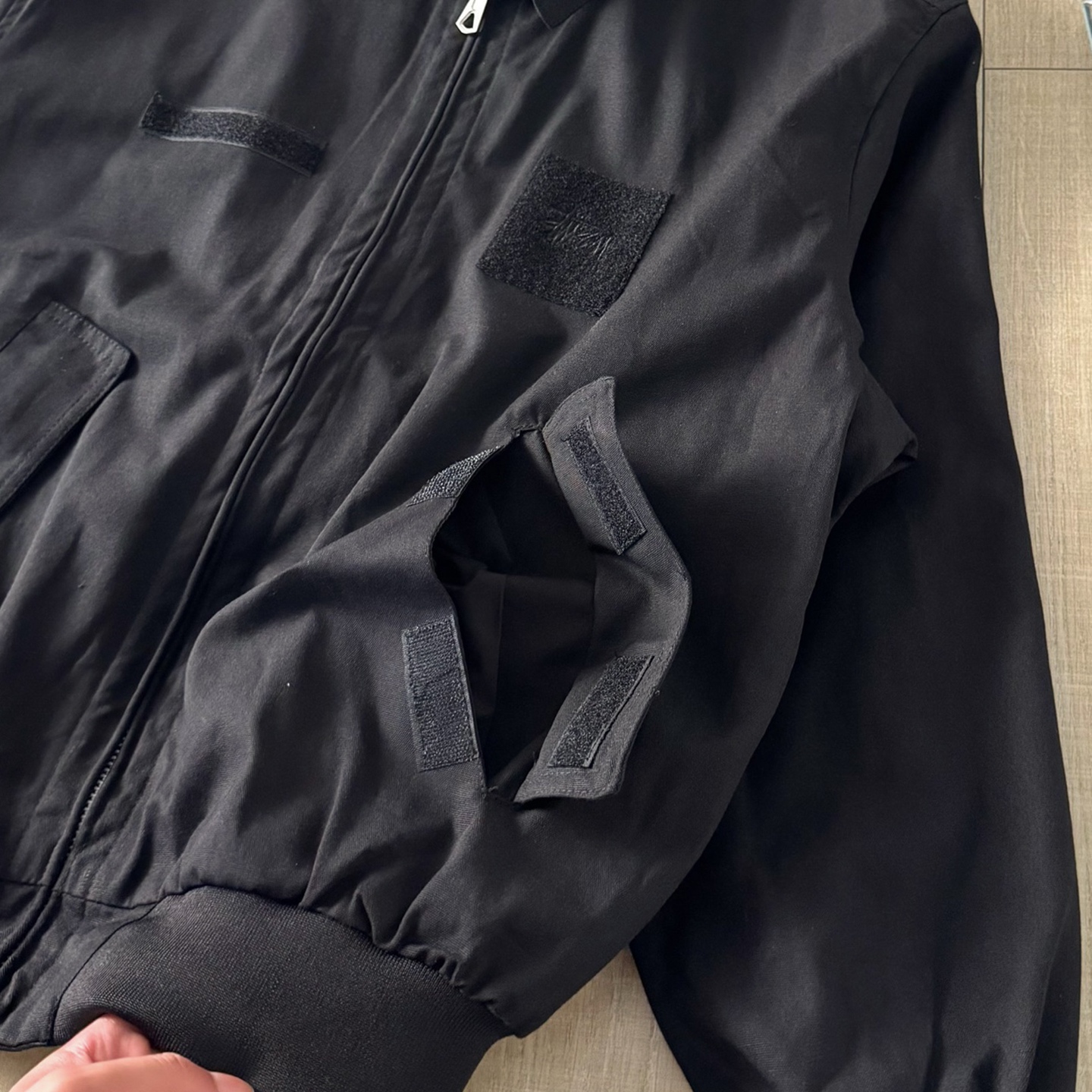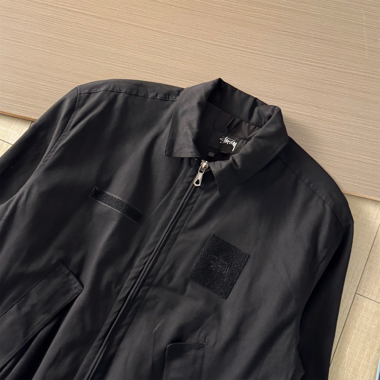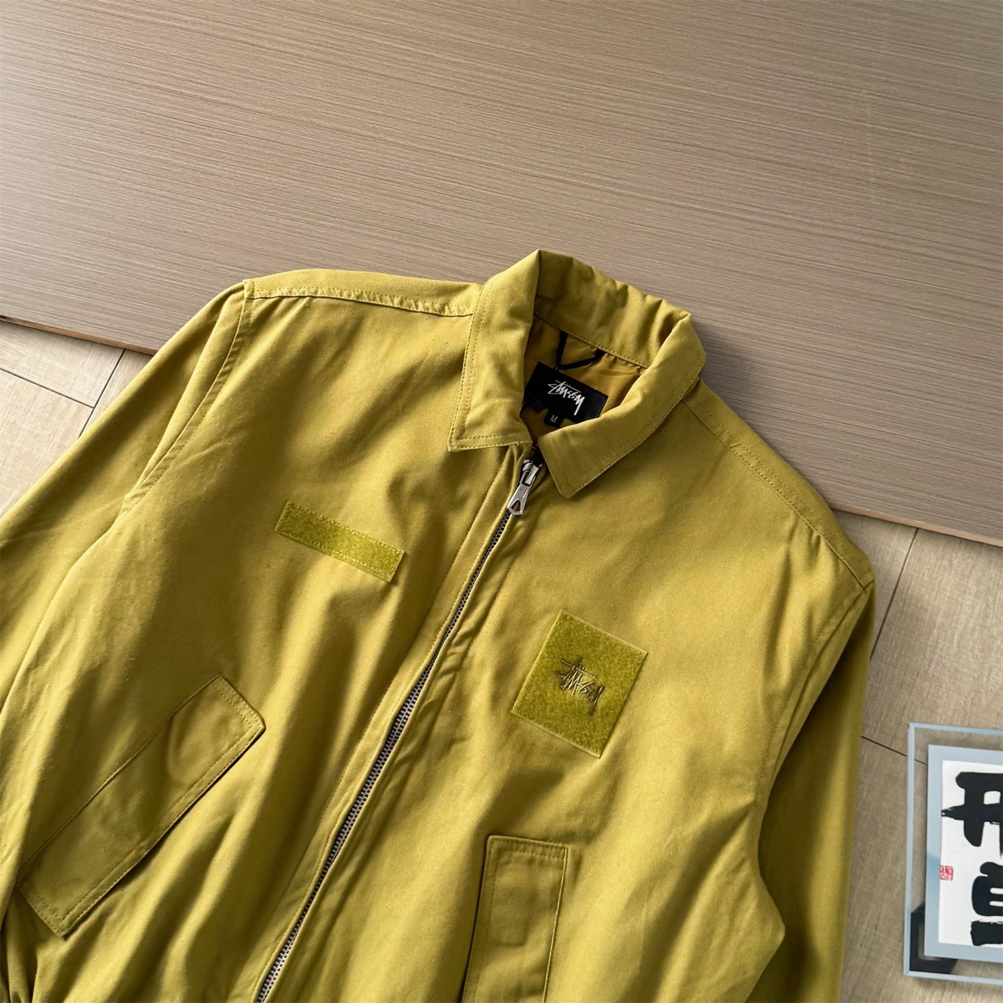 新款 Stussy 斯图西 罗纹边拉链翻领徽标宽松美式复古夹克外套 Stussy今年终于带来一好看的新款飞行夹克了 上身最好看还得属这个金橄榄配色 实物比图片亮一些 设计上增加了翻领和魔术贴的设计 用料比想象中的薄 内里没有填充物 拉链用了故意做旧氧化的复古效果