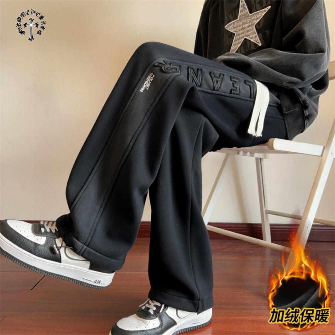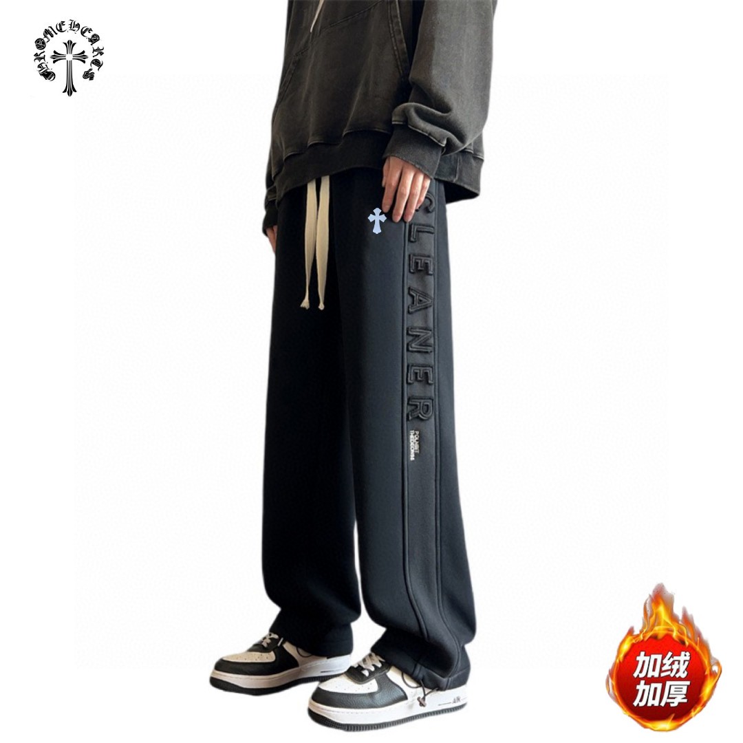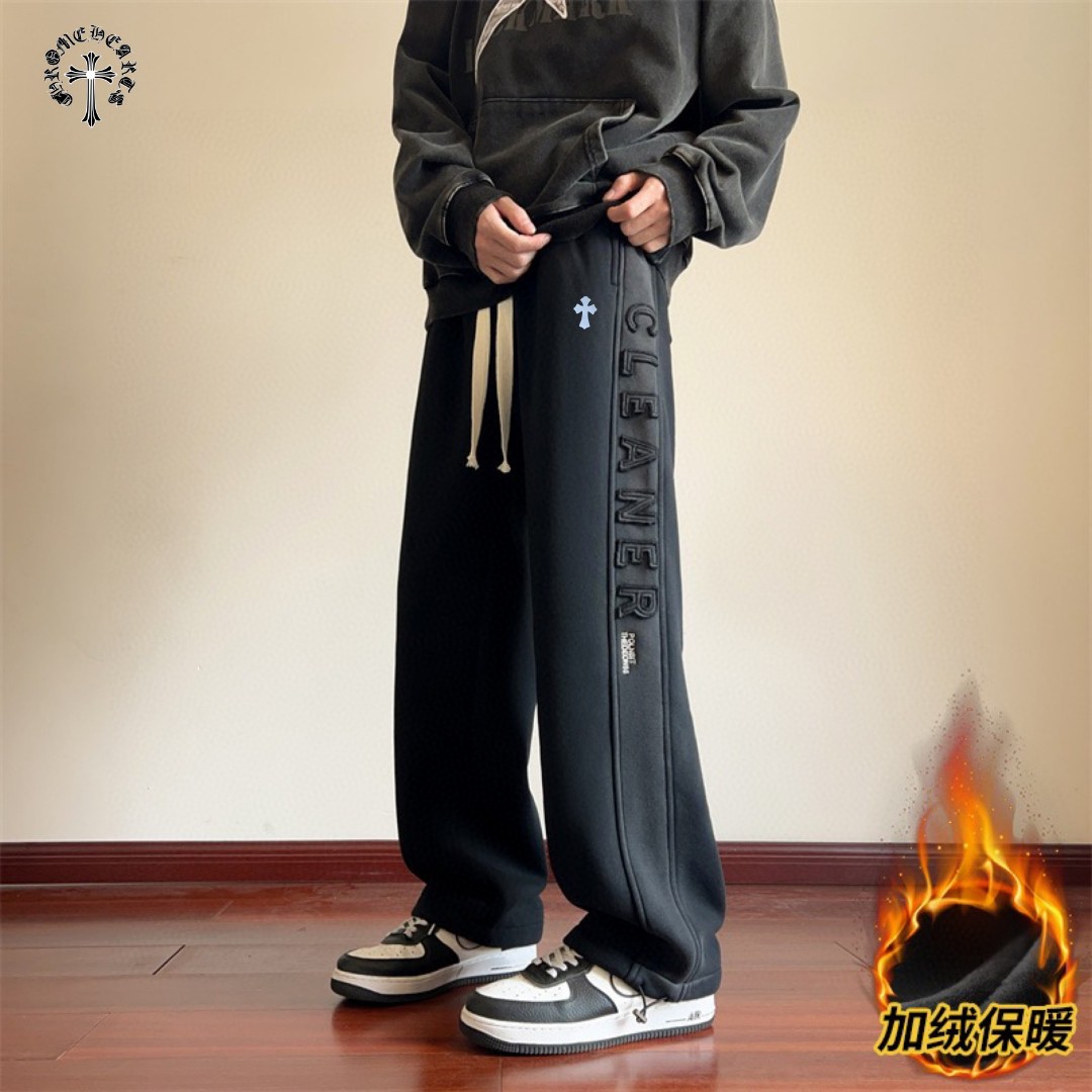 CHROME HEARTS克罗心海外版25ss新款水洗磨毛刺绣布丁相拼加绒加厚休闲运动裤