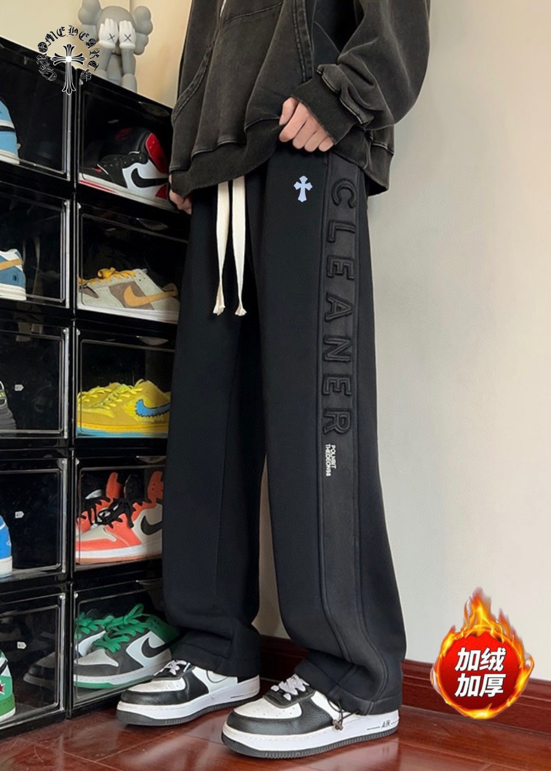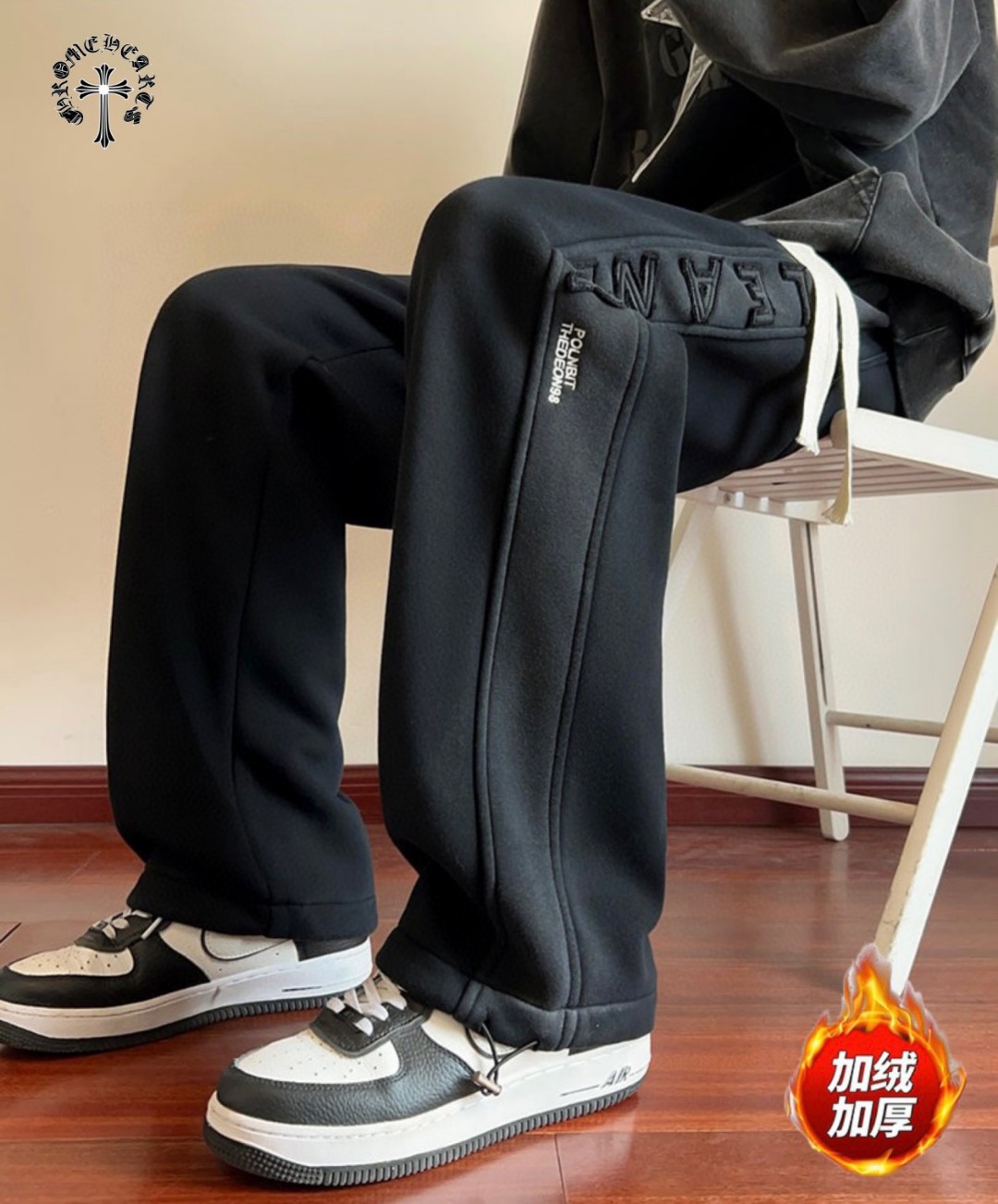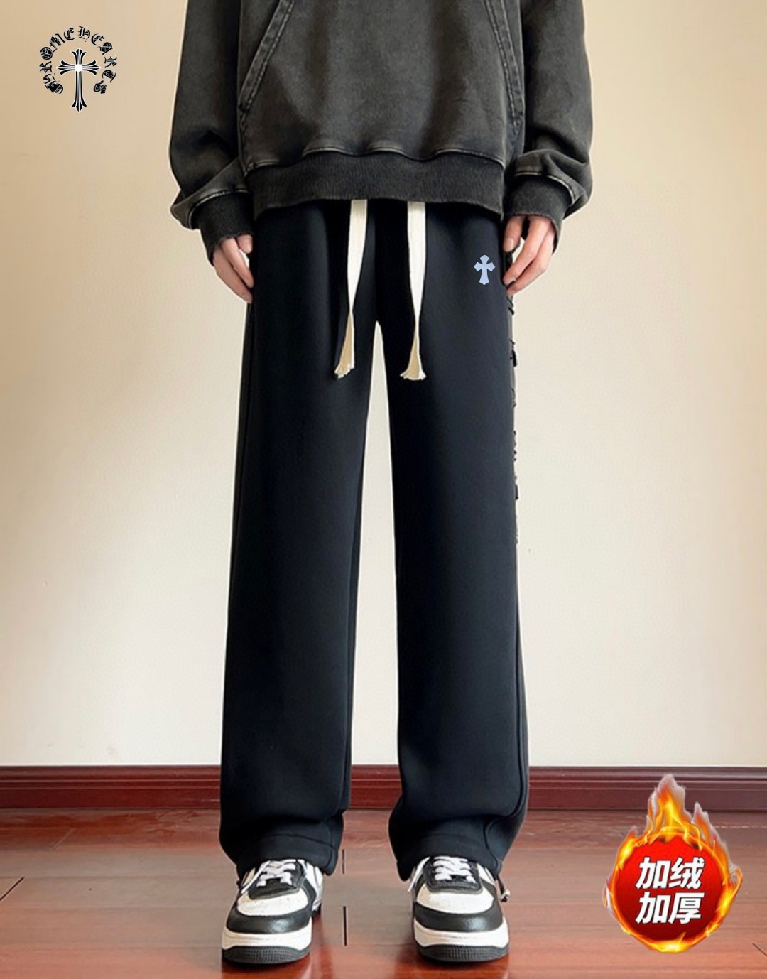 CHROME HEARTS克罗心海外版25ss新款水洗磨毛刺绣布丁相拼加绒加厚休闲运动裤