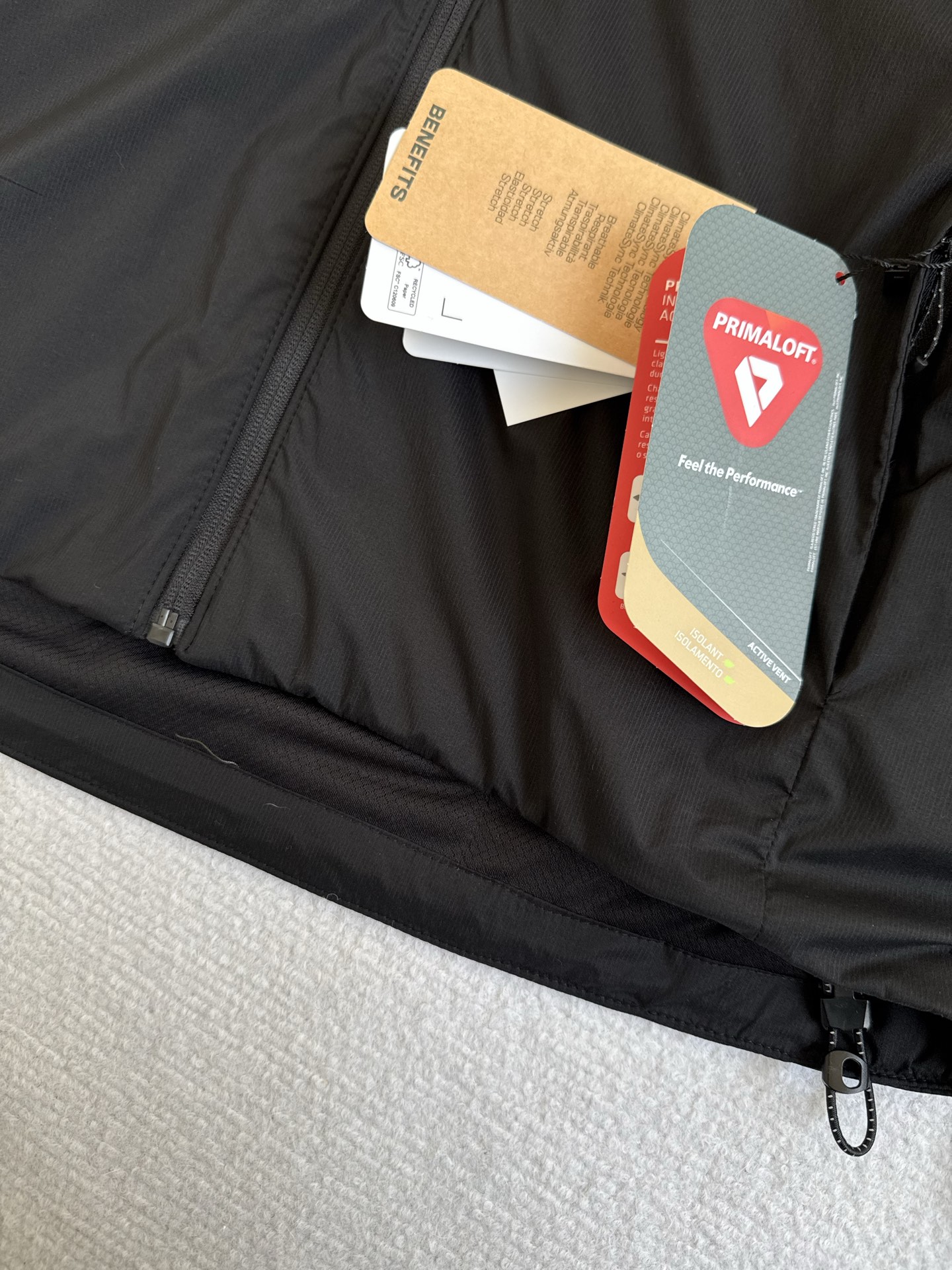 ClimateSync 动态温控 保温层做了激光切割的 山形标 开孔 动作幅度大时会张开排湿散热 静止时闭合锁温 真正做到动不闷 静不冷 Climatesync动态暖芯科技加PRIMALOFTB隔热层实现温控管理新突破 提供优秀保暖性能