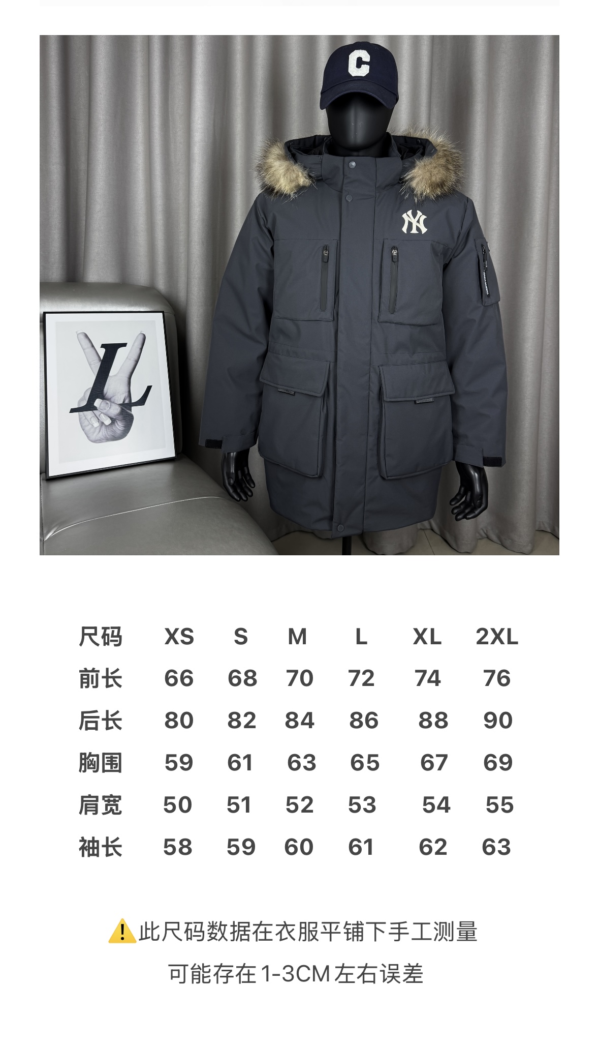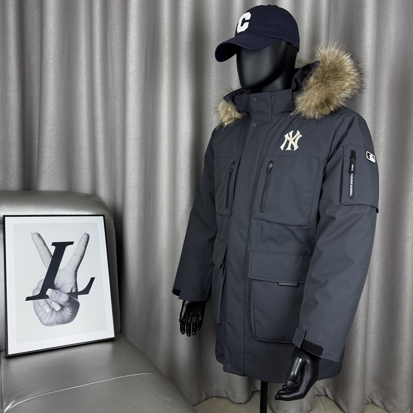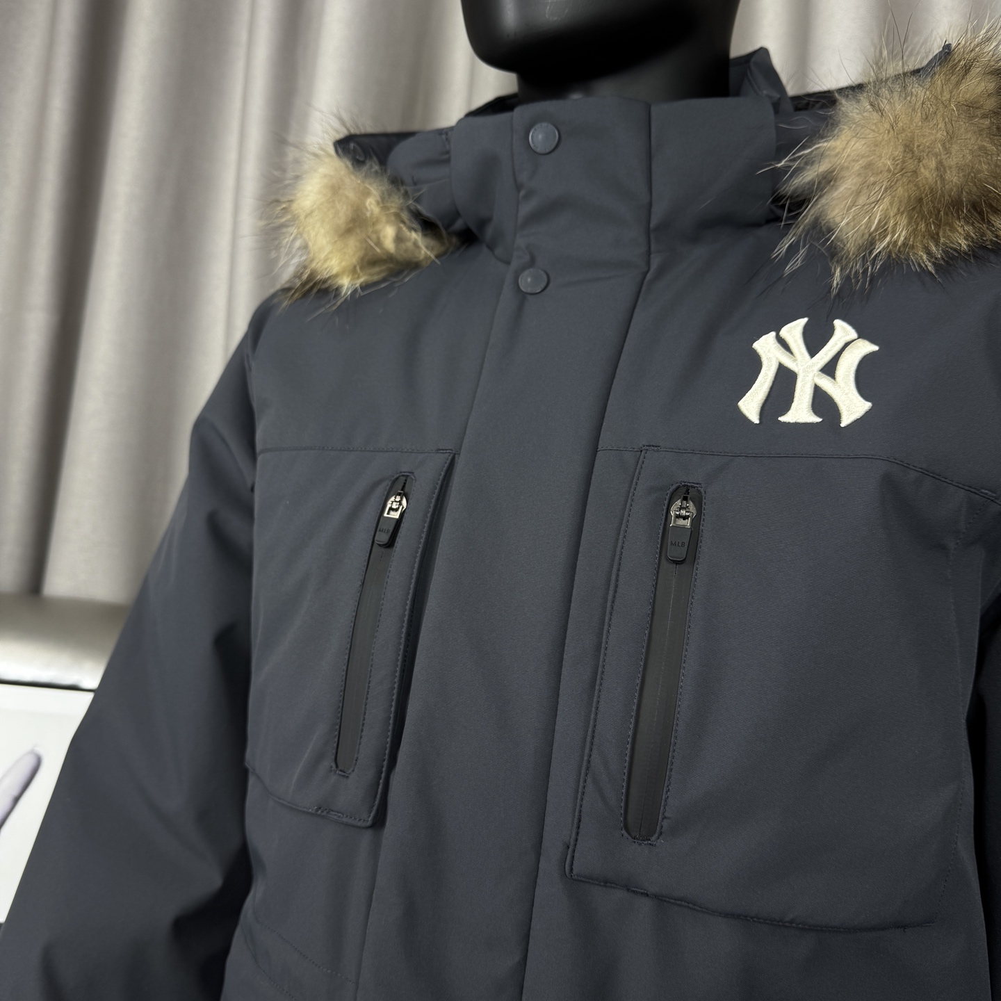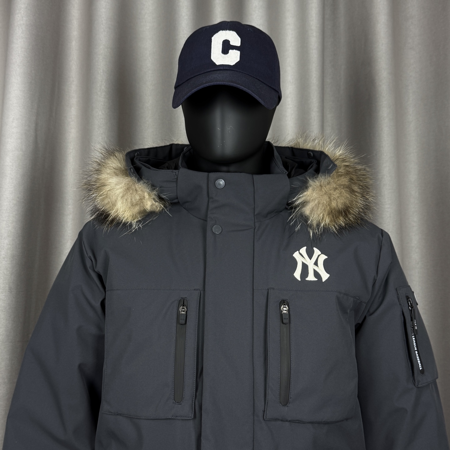 𝑴𝒍𝒃 𝑴𝒐𝒏𝒐𝒈𝒓𝒂𝒎 纽约洋基队工装风大毛领派克羽绒服张凌赫同款多口袋拉链中长款可拆卸连帽外套男女同款