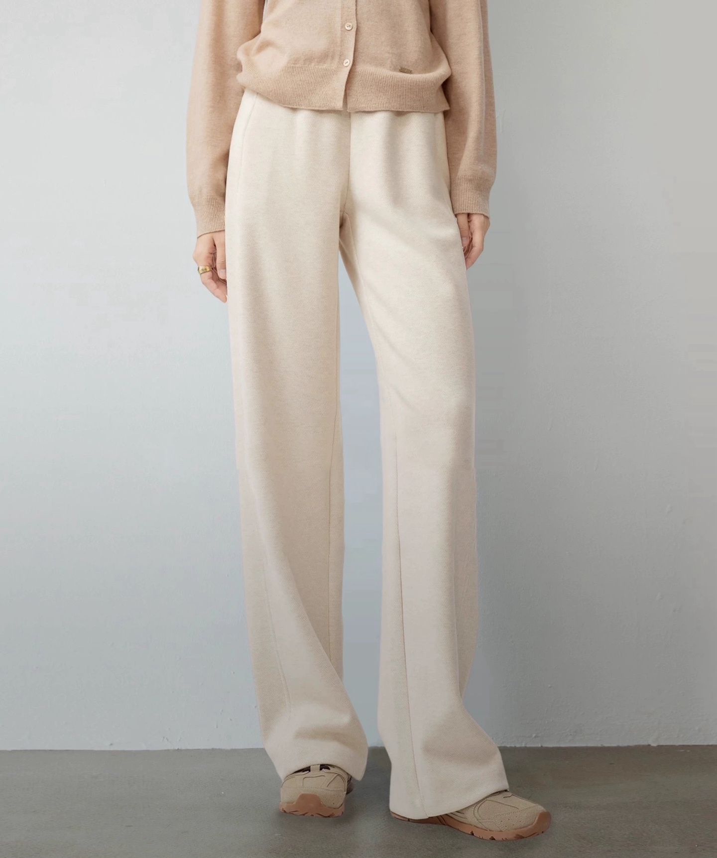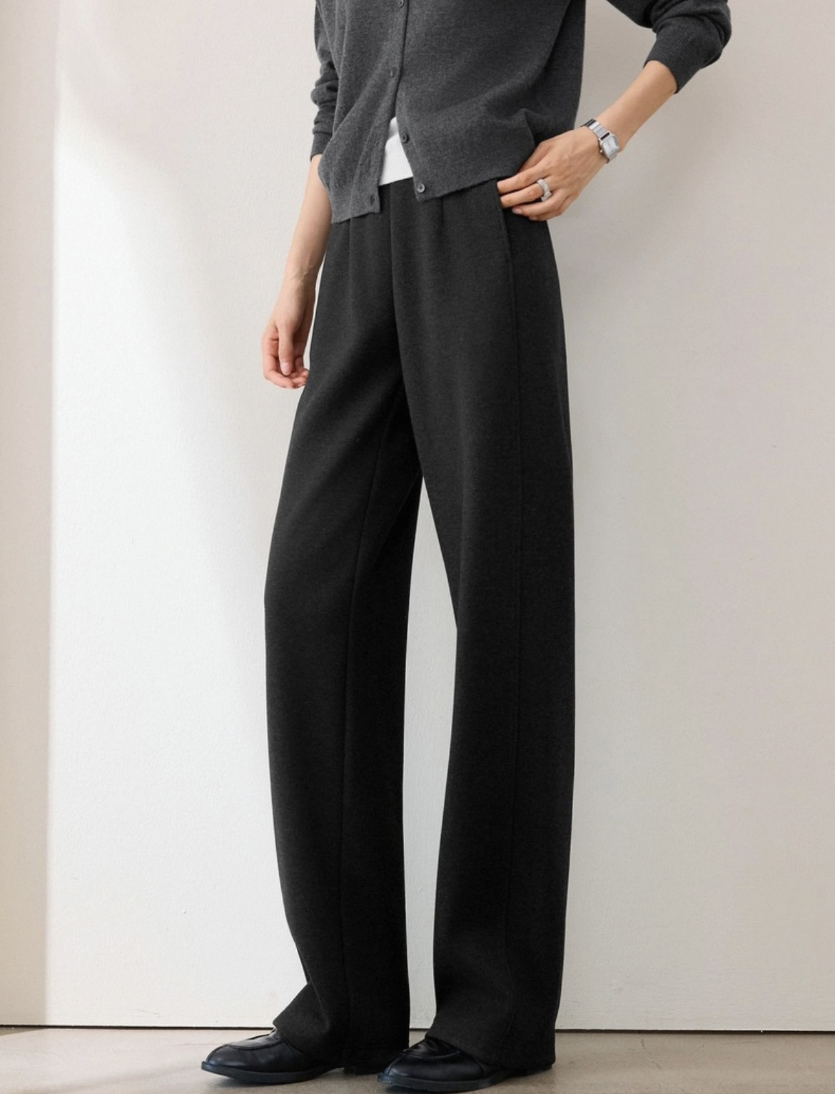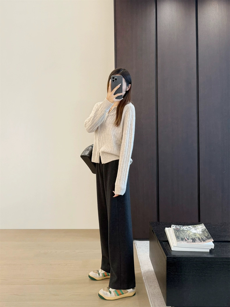 工艺上这是一条针织裤 它经历了醉难的预缩工艺 含羊毛的裤子做预缩面料会耗费的更多 所以工艺真的慢慢慢 而且在舒适度上达到了跟人体蕞贴合的状态 柔软亲肤工艺上大程度上 解决了大部分的易勾纱的问题 看预缩后的布料的纹理 更加平整贴合梭织的功能 他实际上远比大部分的针织裤更不容易勾丝了 众所周知 羊毛醋酸针织面料 不便宜 轻 柔软 舒适具有良好的弹性和伸缩性和柔软性 吸湿性和透气重点比梭织防皱性也要好很多很多 市面上有的醋酸羊毛针织面料我们全部翻遍了 这条是足够耐看细腻有质感的针织面料超级无敌糯叽叽 被呵护般的亲肤感不夸张 细节上做工炒鸡好 腰部升J加固 宽边会更加舒适 后臀假口袋 呈现饱满臀部线条 窄版直筒裤型 又有微妙弧度 质感慢慢流入