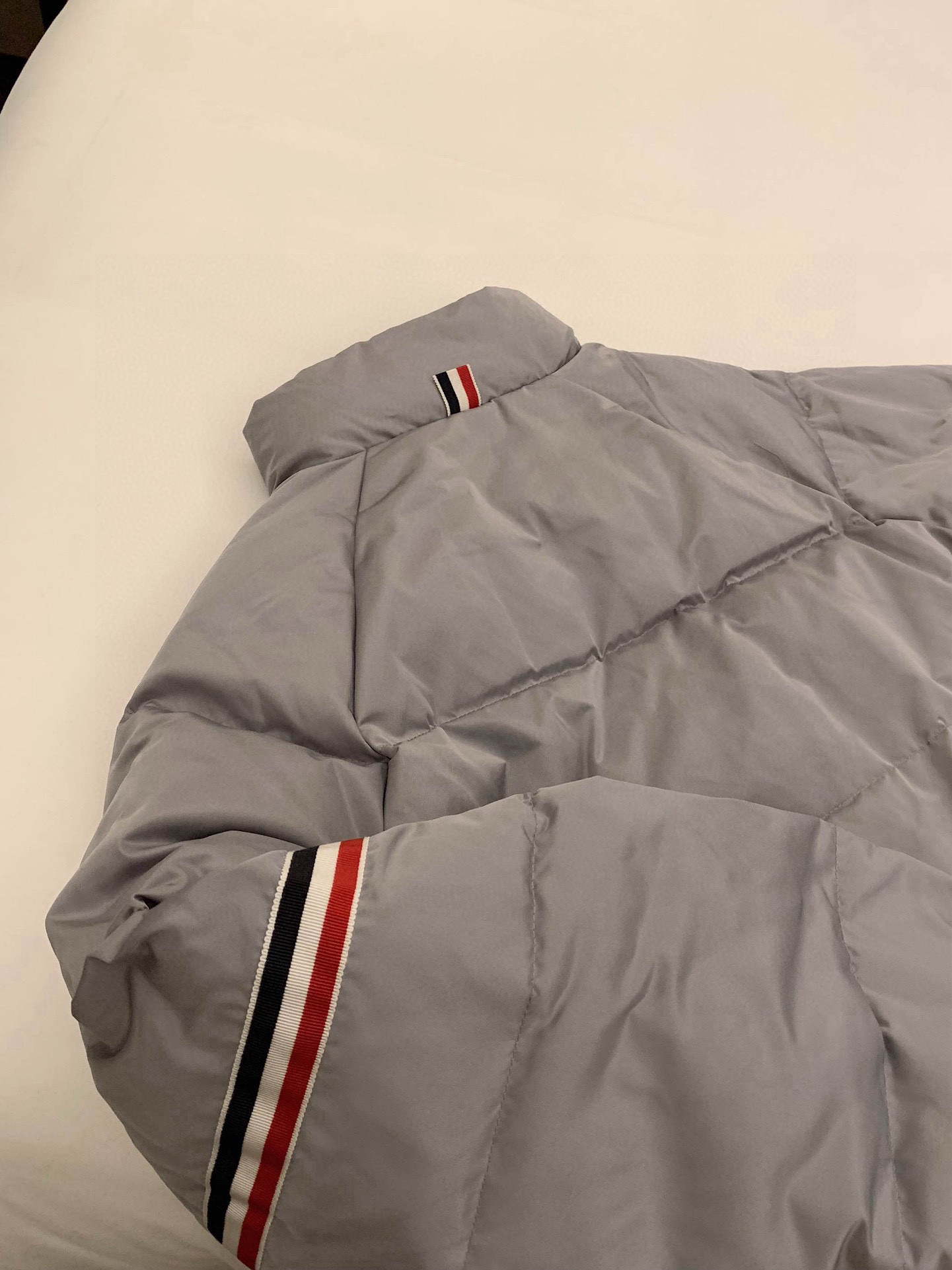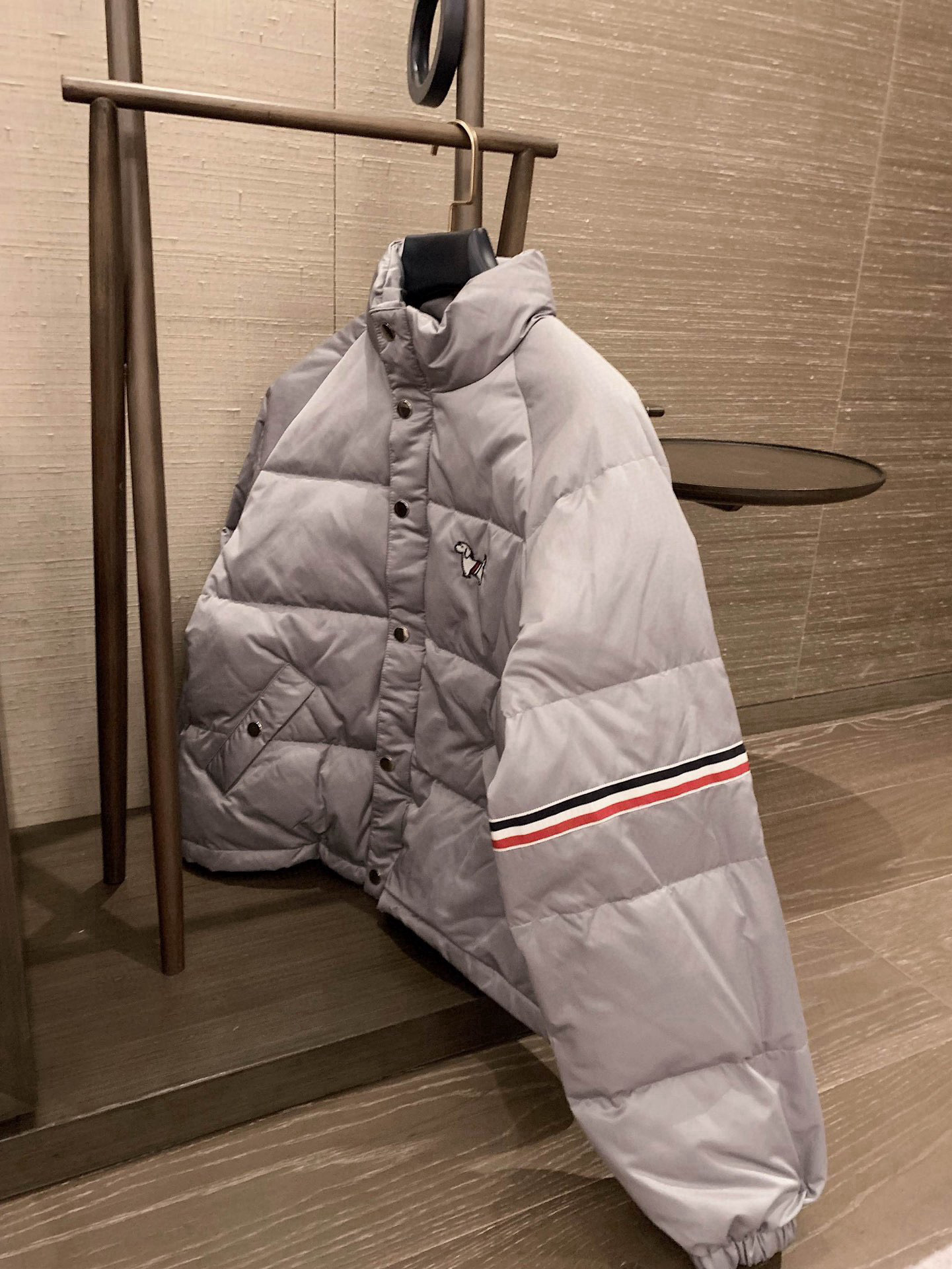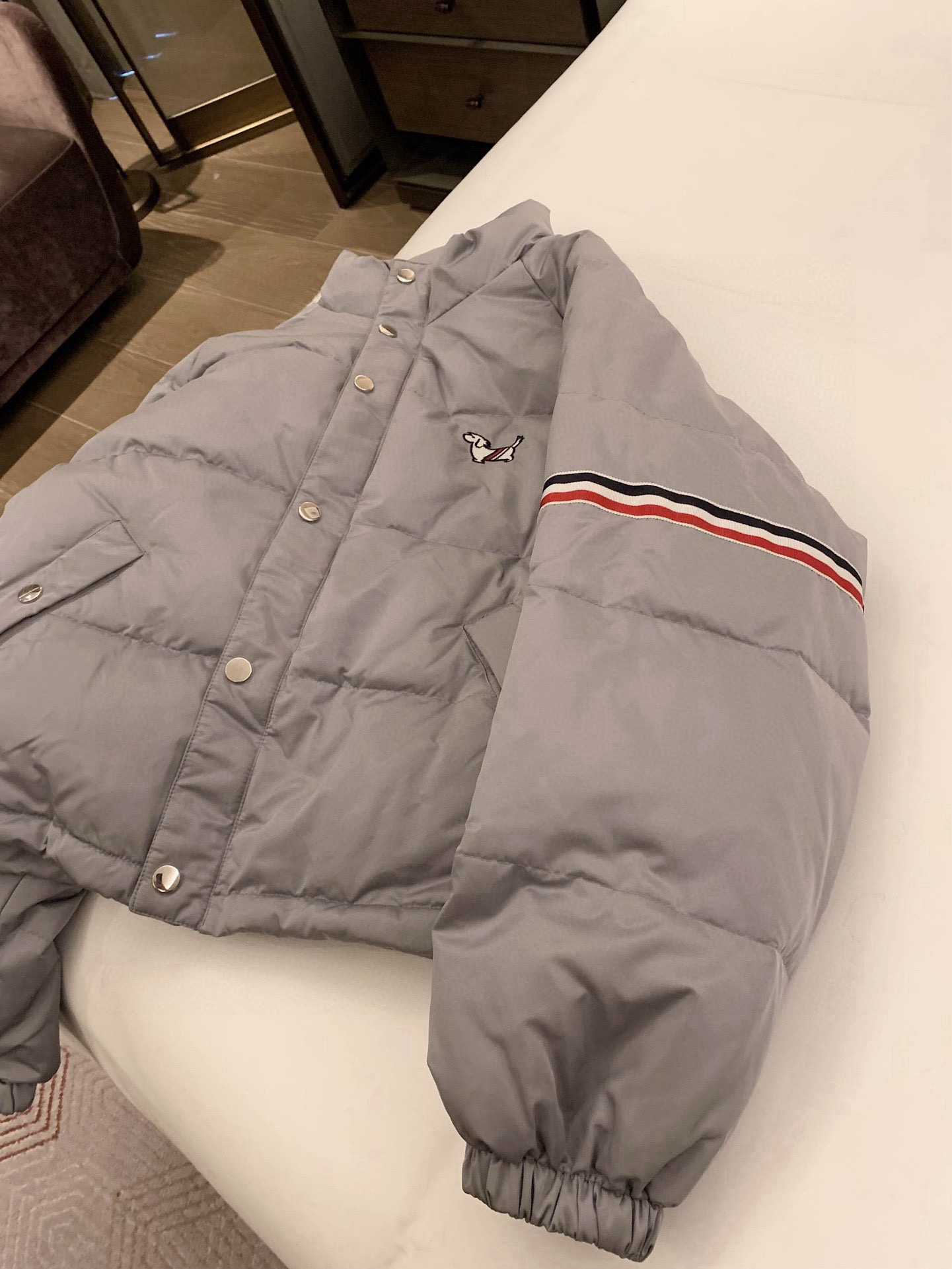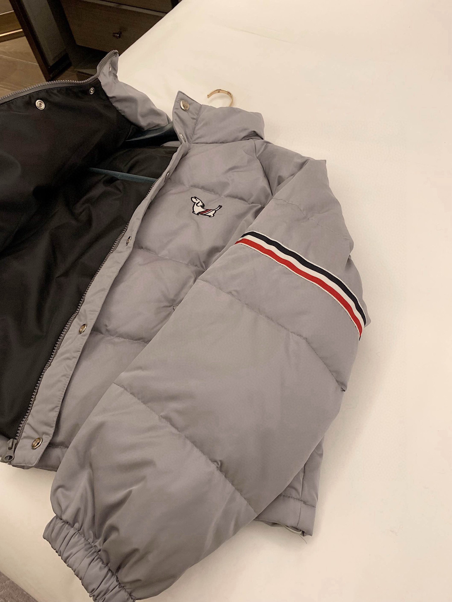 Thom Browne TB小狗刺绣三色织带装饰立领拉链羽绒服